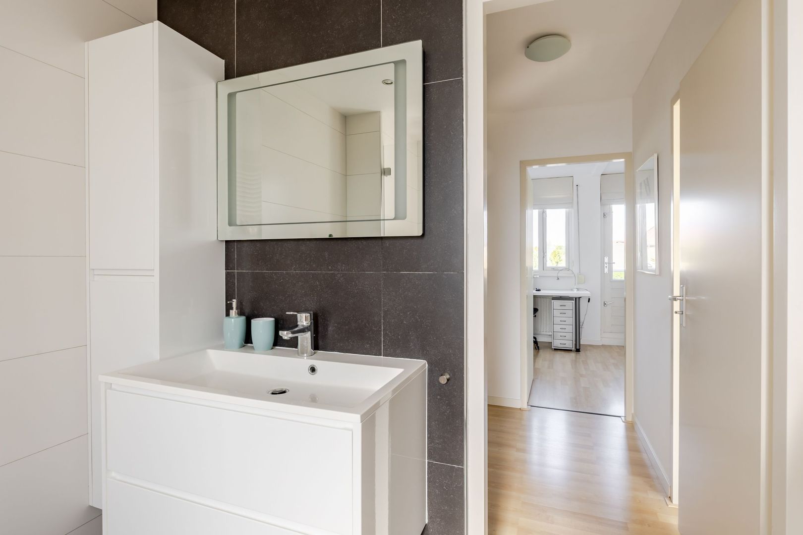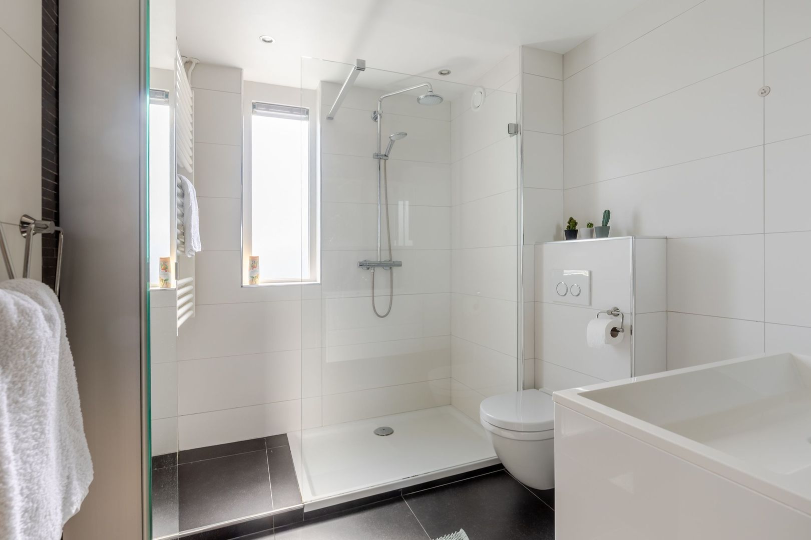 De tweede slaapkamer ligt aan de voorkant, evenals de badkamer. Deze is modern en ingericht met een inloopdouche, een wastafelmeubel en een tweede toilet.