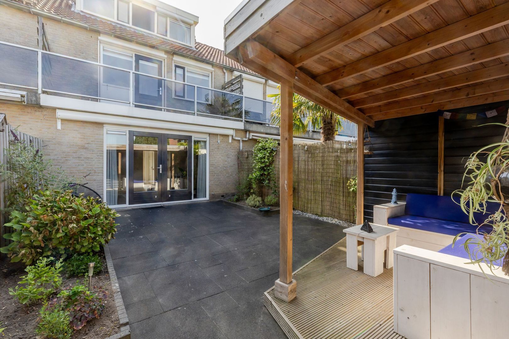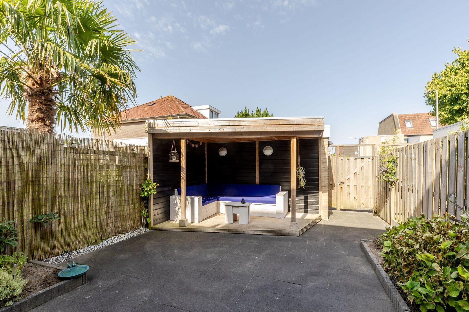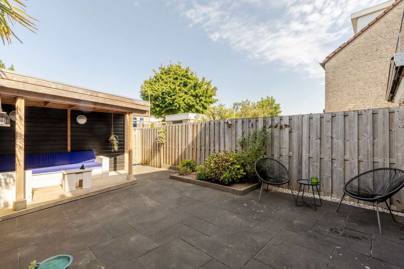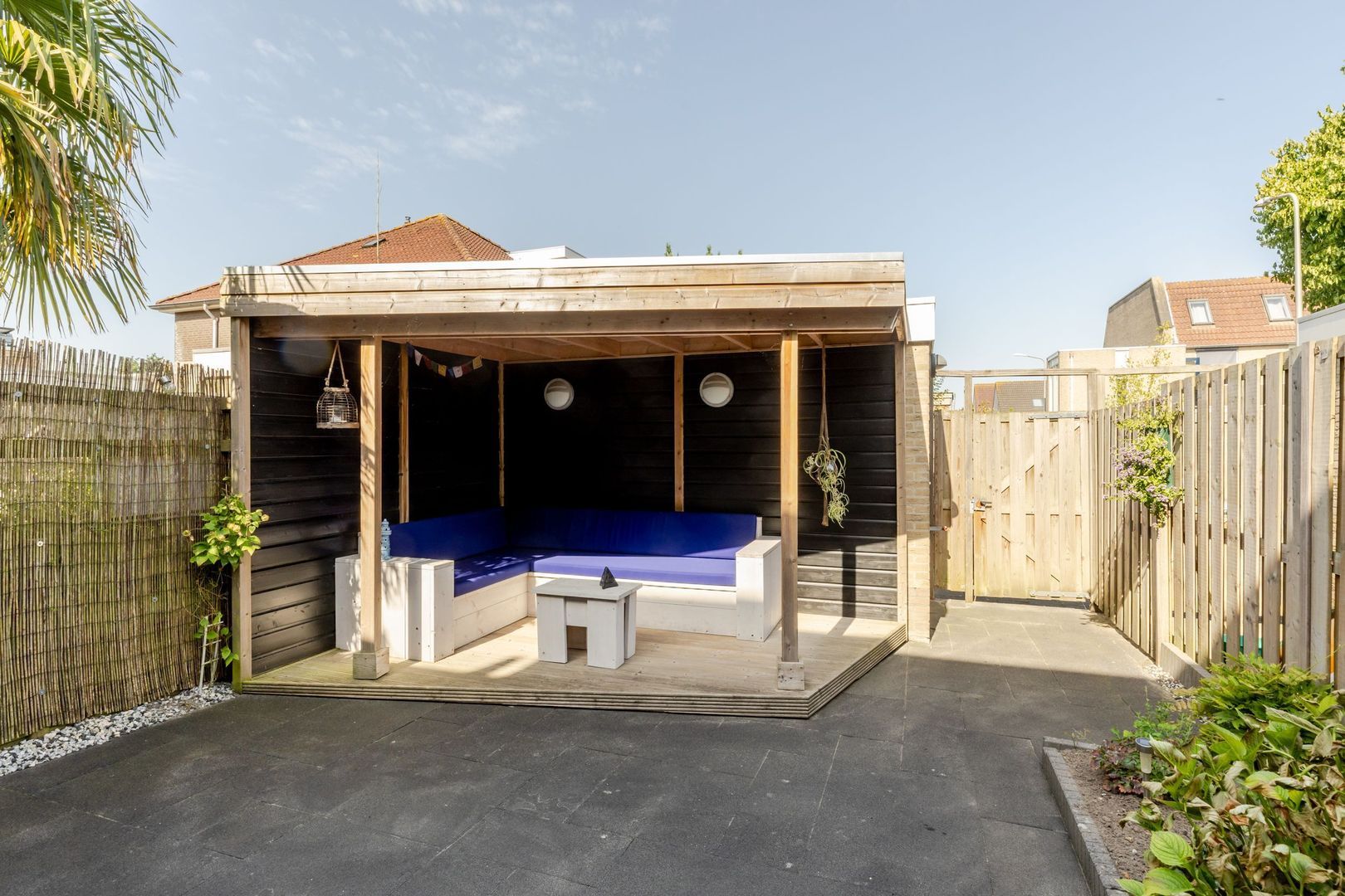 Voor de stenen berging is een gezellige overkapping gebouwd, waar het heerlijk toeven is.