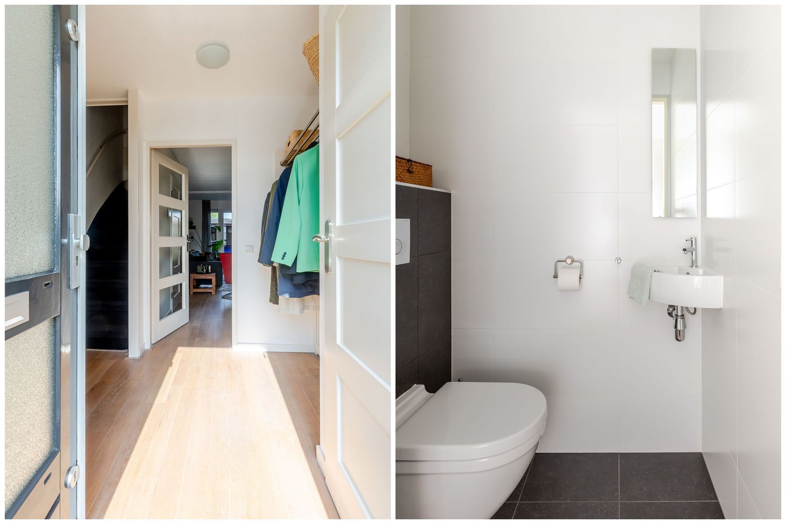 Entree, hal met meterkast, trapopgang en toiletruimte met wandcloset en fonteintje.