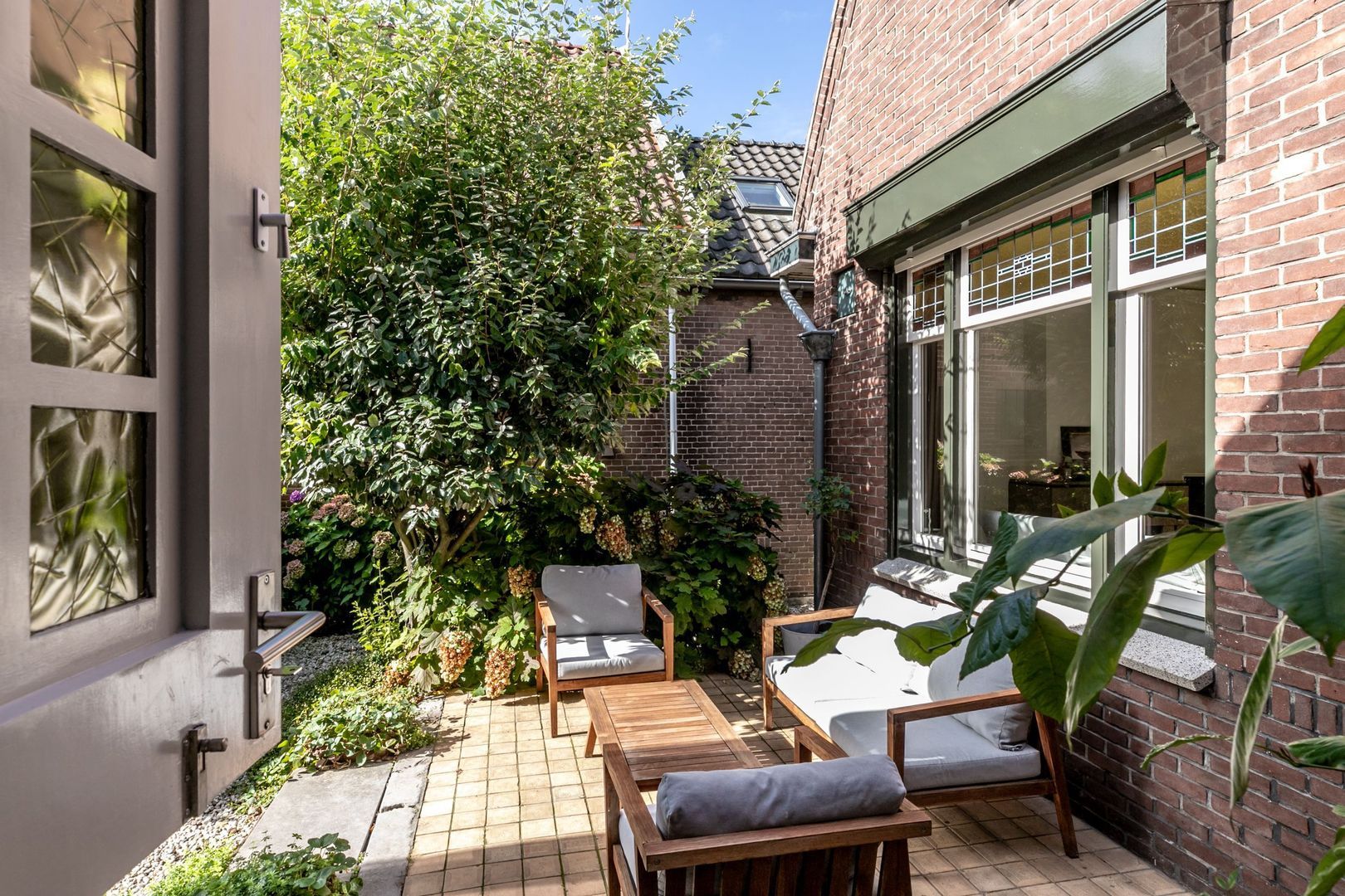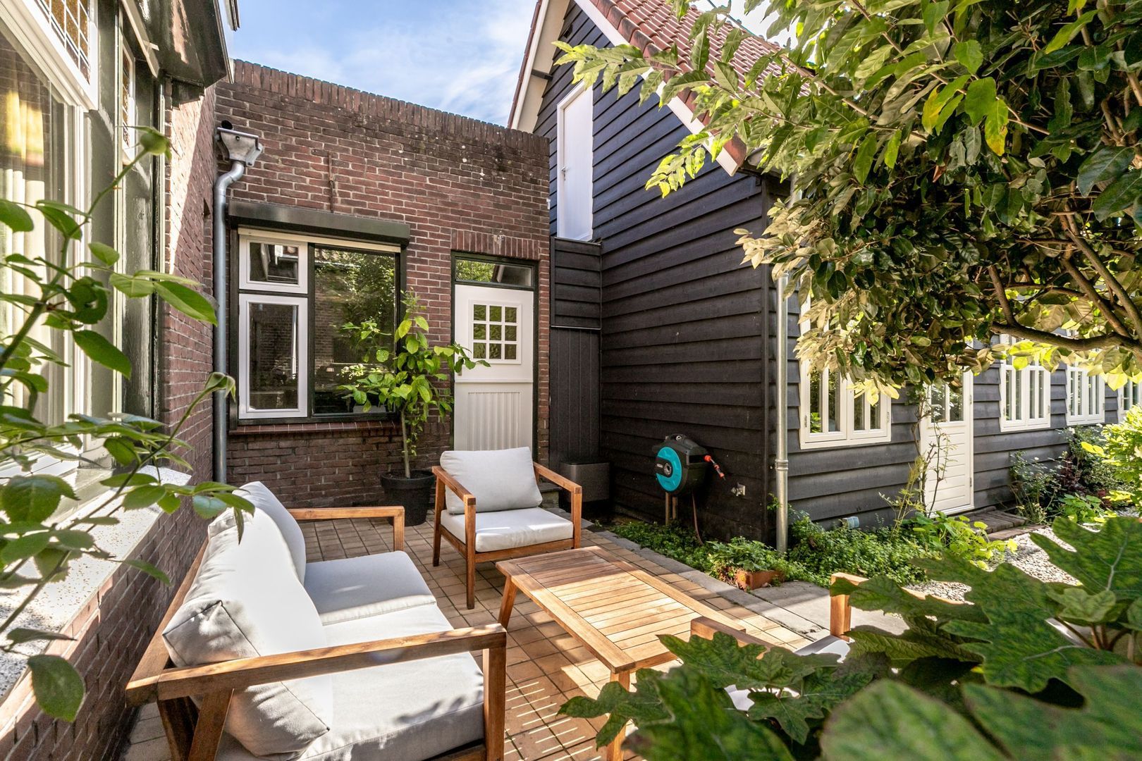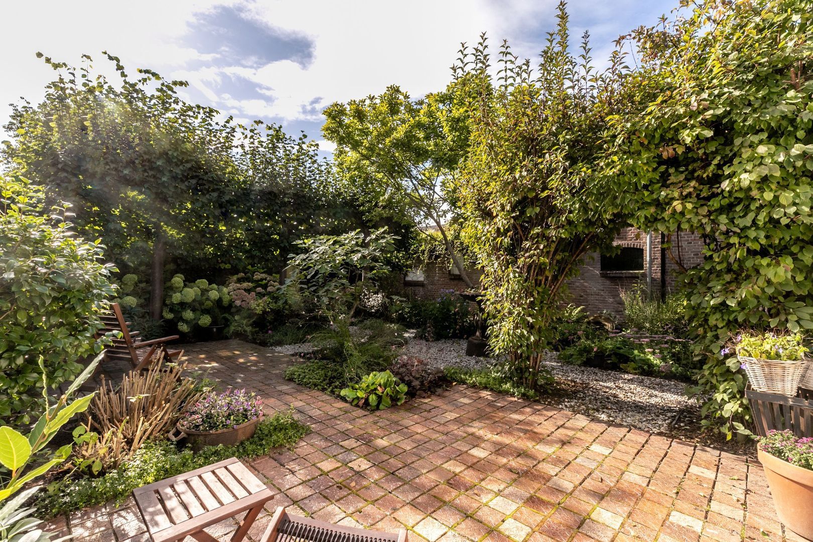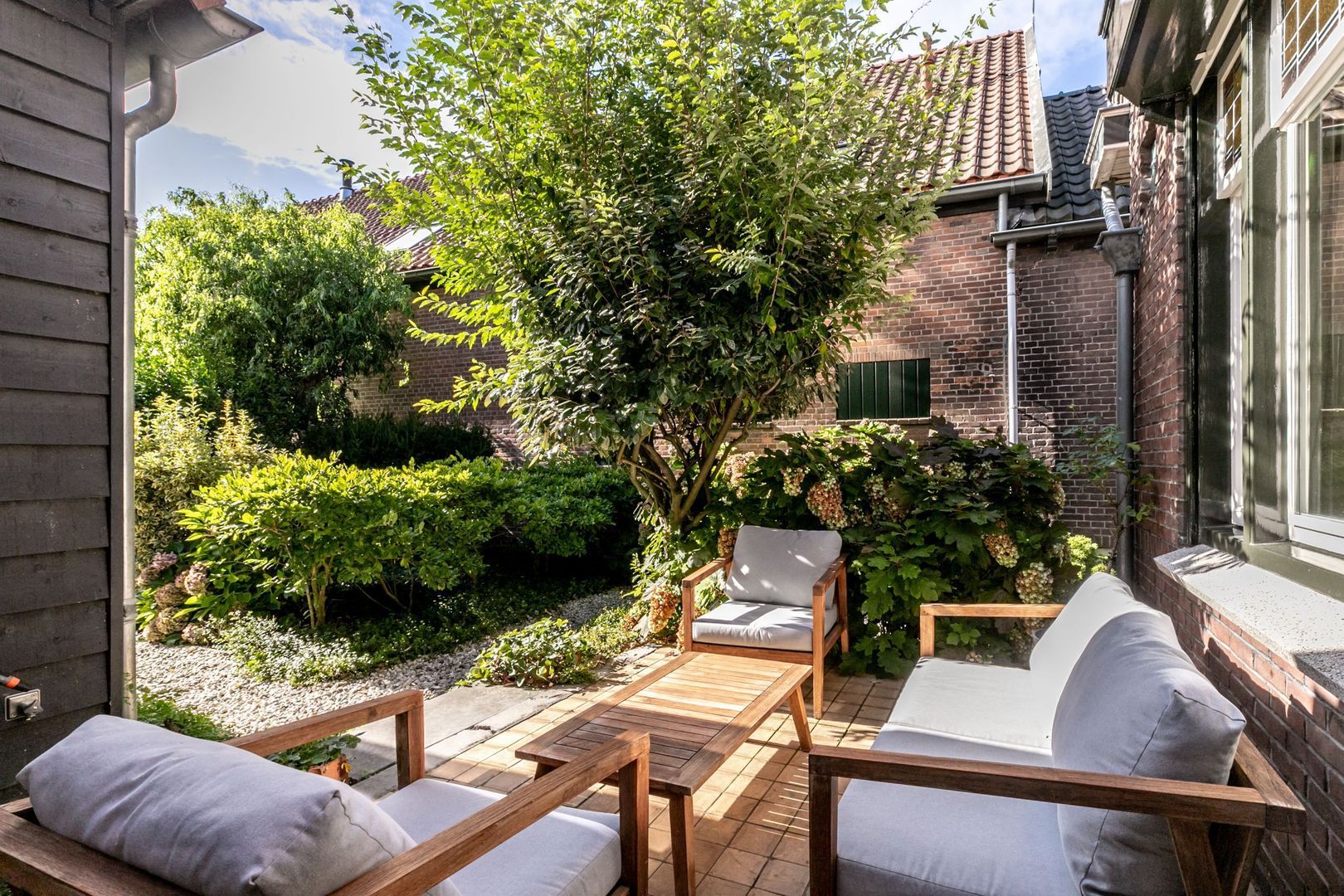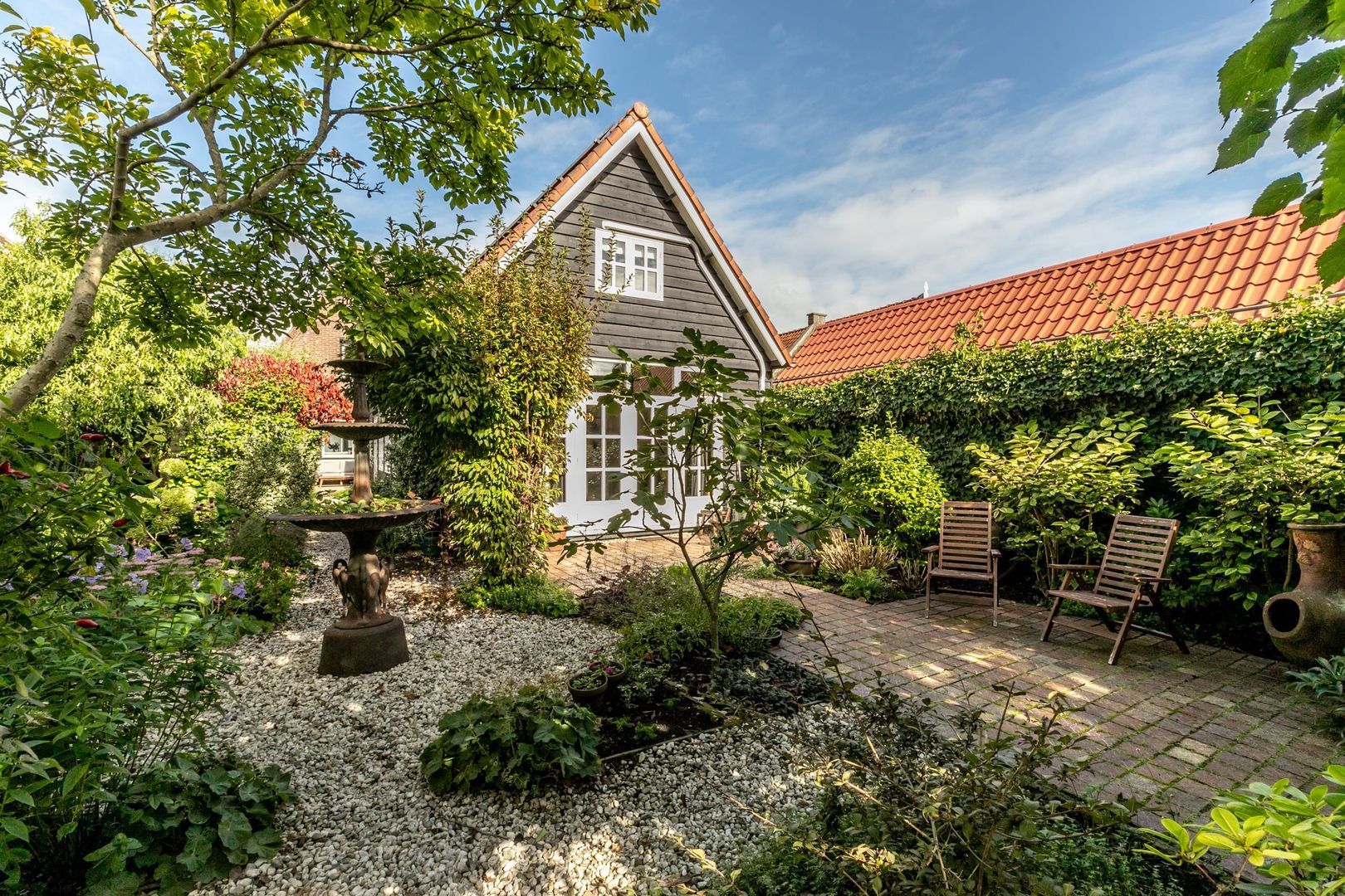 In de fraaie tuin zit heel veel liefde en aandacht, en dat voel je, net zoals in de rest van de woning. De tuin is weelderig ingericht met groen, is bijzonder sfeervol en heeft twee fijne terrassen. Er is een buitenkraan en een afsluitbaar achterom en naast de keuken is er nog een kleine, maar praktische bergkast.
