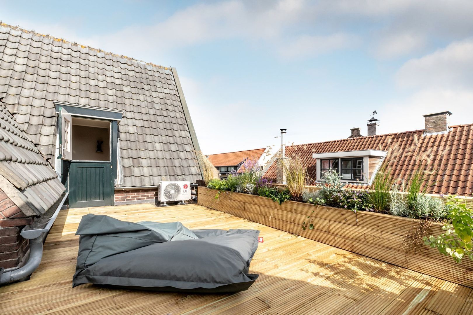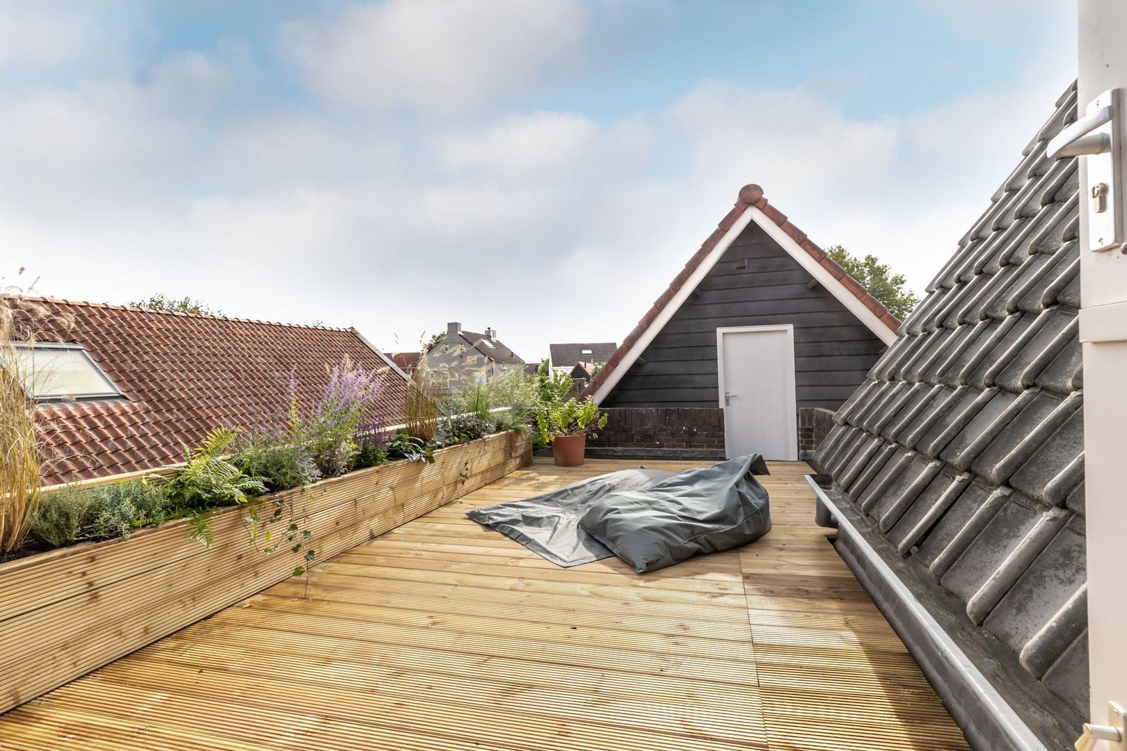 Het dakterras is voorzien van een sfeervolle vlonderpartij met beplanting en kijkt fraai weg over de omgeving. Vanuit hier is er ook toegang tot een ruime berging.