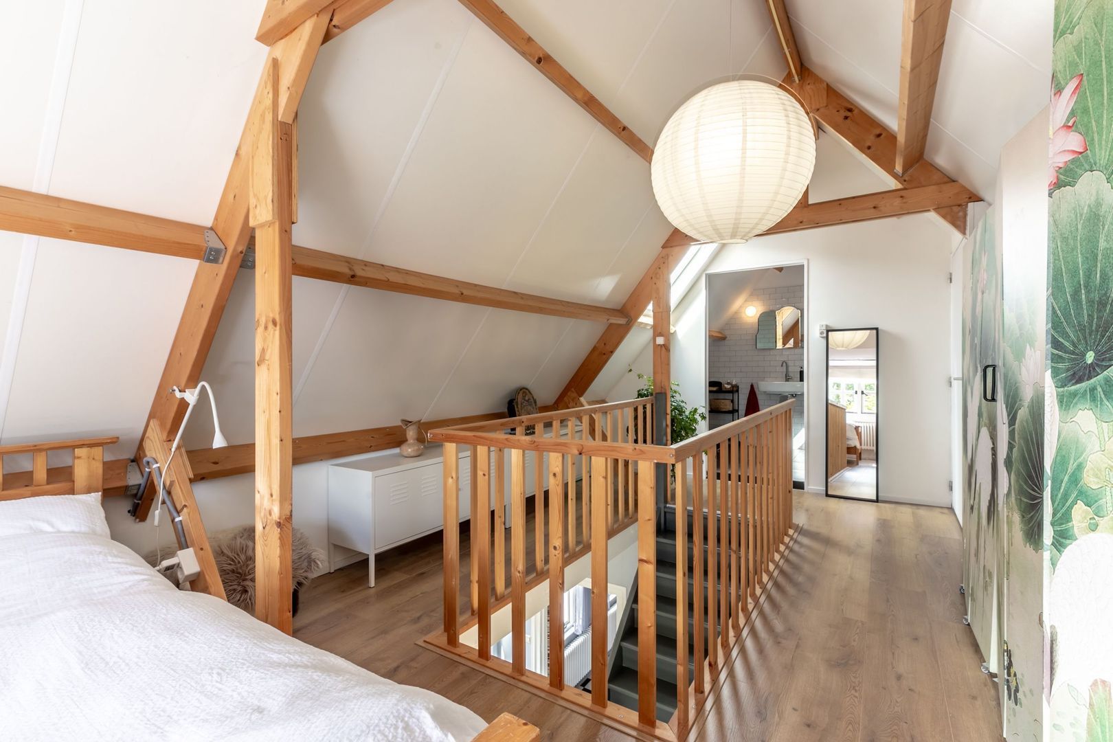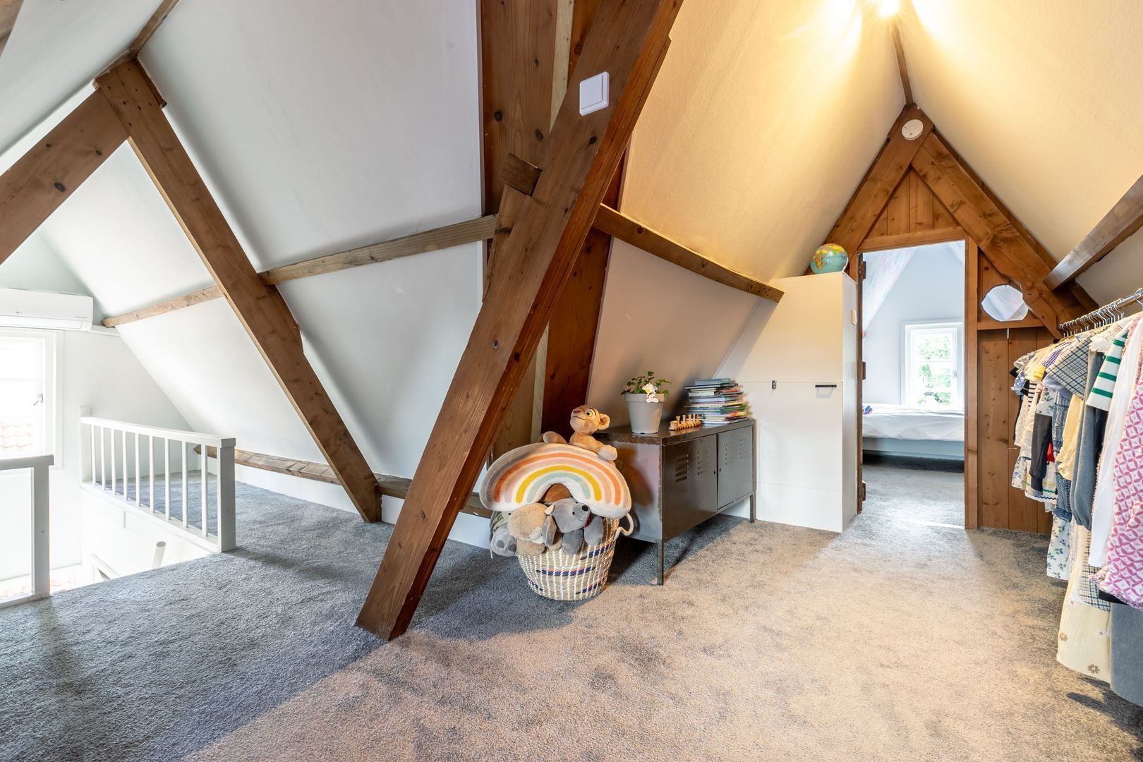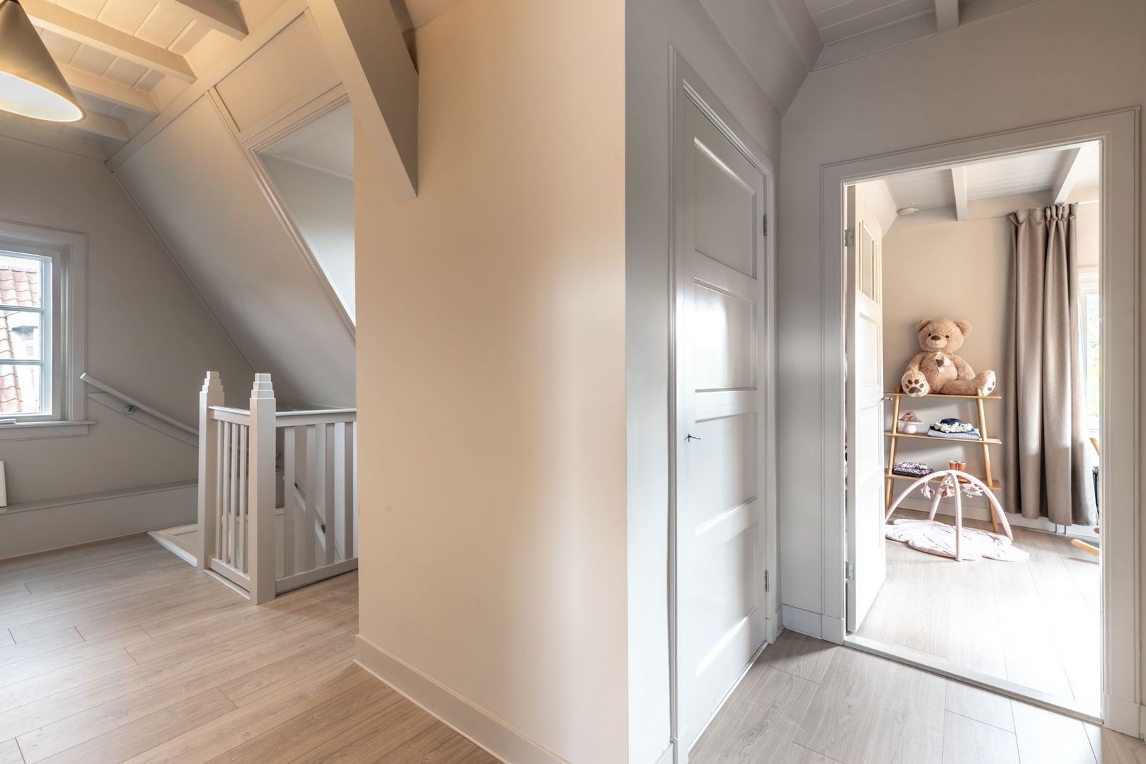 De trapopgang komt uit op de overloop die in verbinding staat met slaapkamers drie en vier. De nok meet hier maar liefst 2,48m en er zijn aan weerszijden ramen waardoor je optimaal van deze verdieping gebruikt kunt maken.