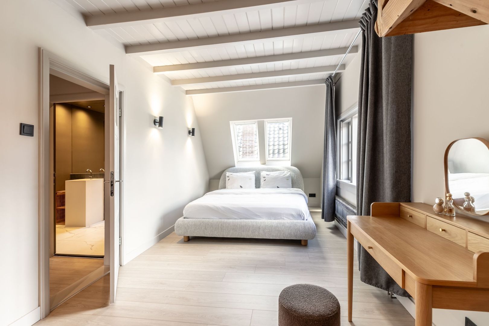 In het achterhuis bereik je via de open trapopgang de bijzonder sfeervolle slaapkamer met dakramen, open kastruimte, berging met opstelplek voor de wasmachine en er is toegang tot de badkamer. De moderne badkamer heeft een ruime inloopdouche en een wastafelmeubel.