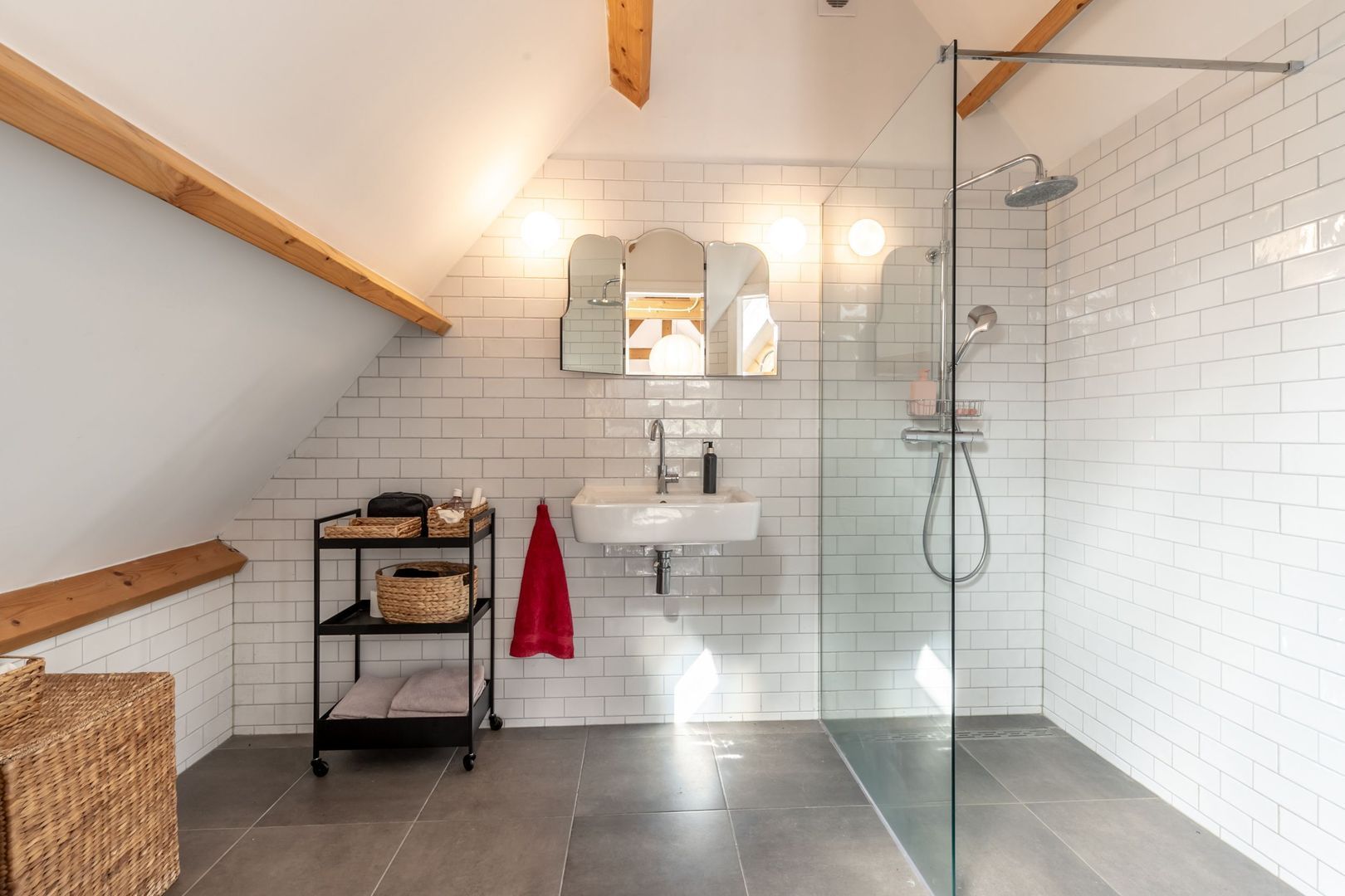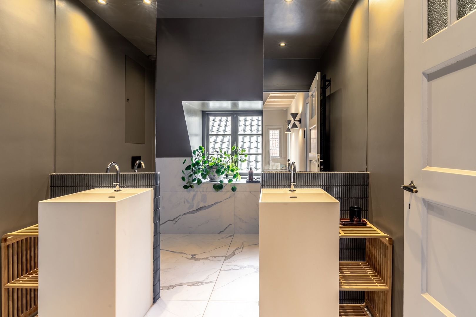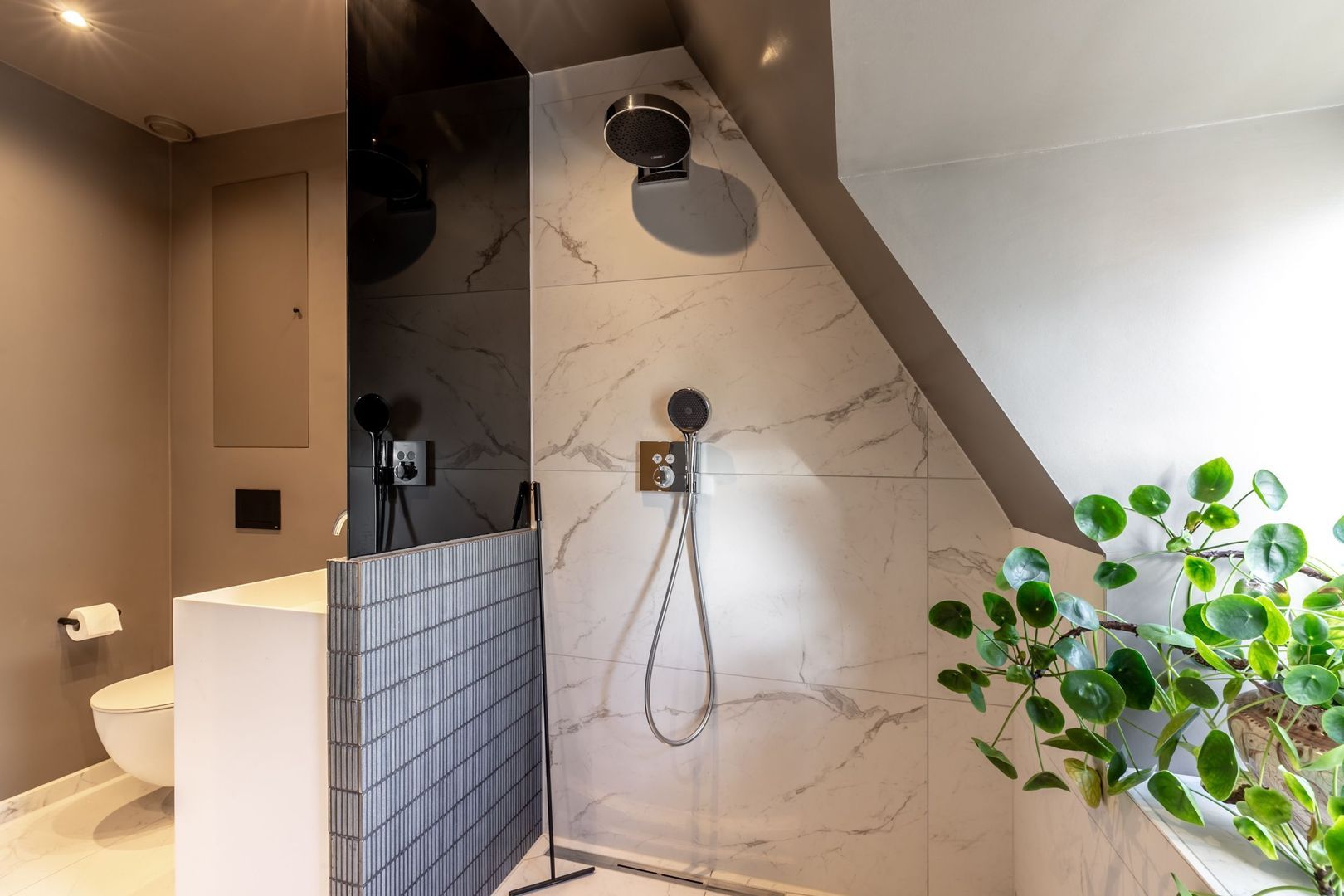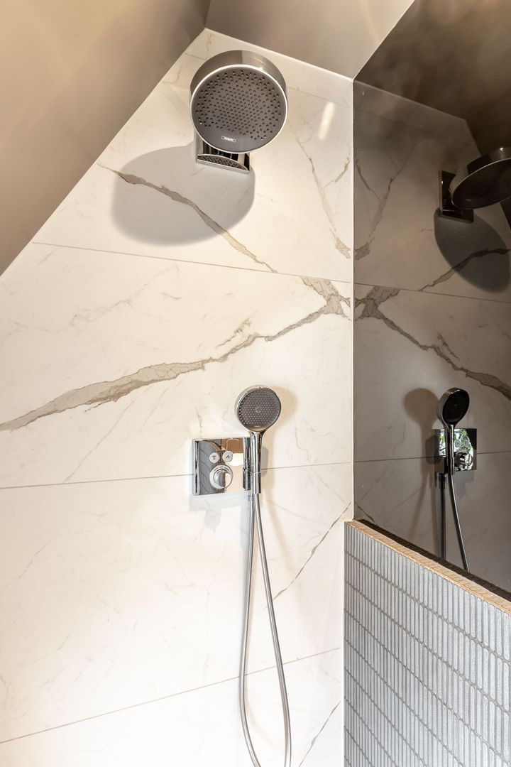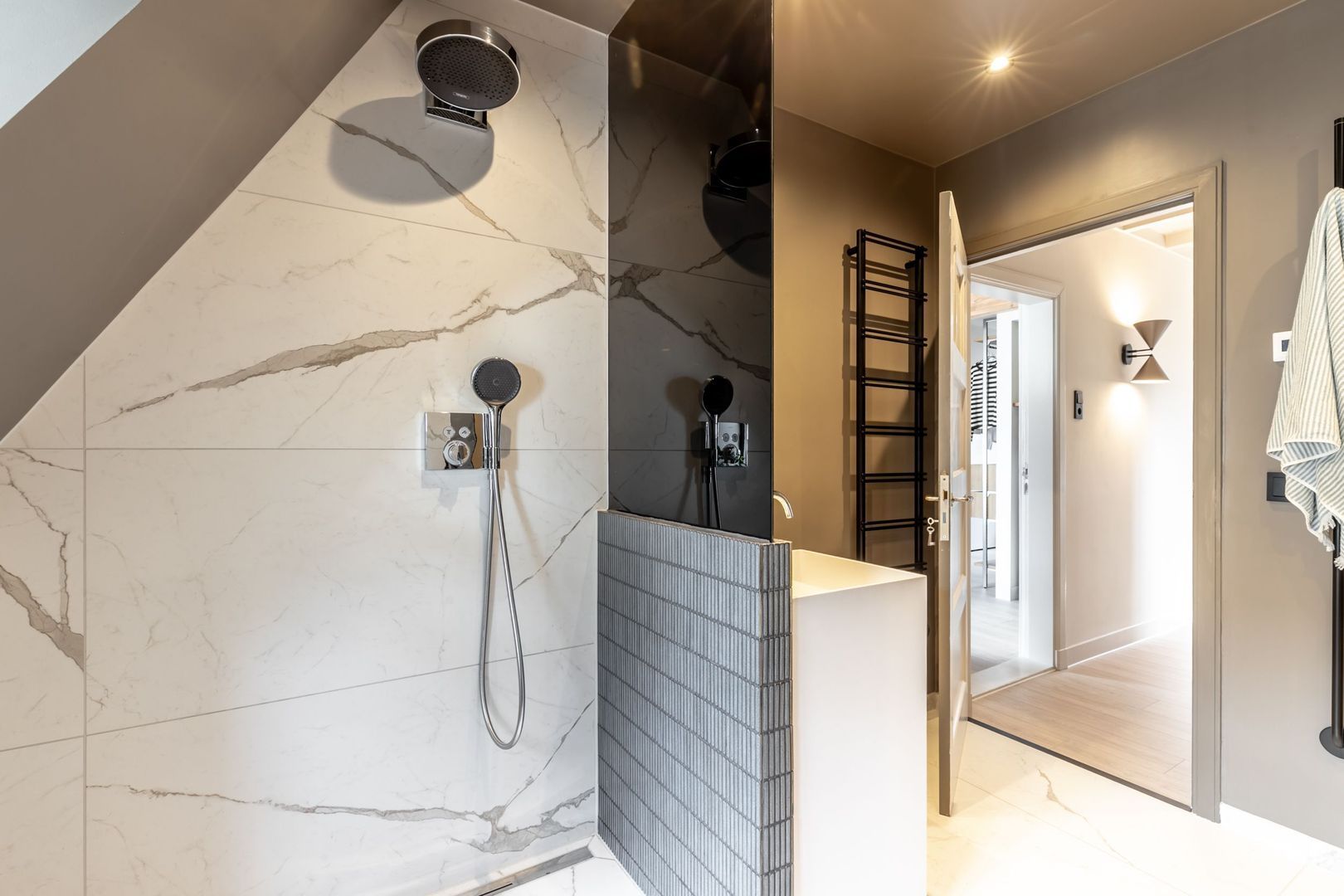 De badkamer is werkelijk een plaatje: twee wastafels met eigen spiegel, een toilet en niet één, maar een dubbele(!) inloopdouche!