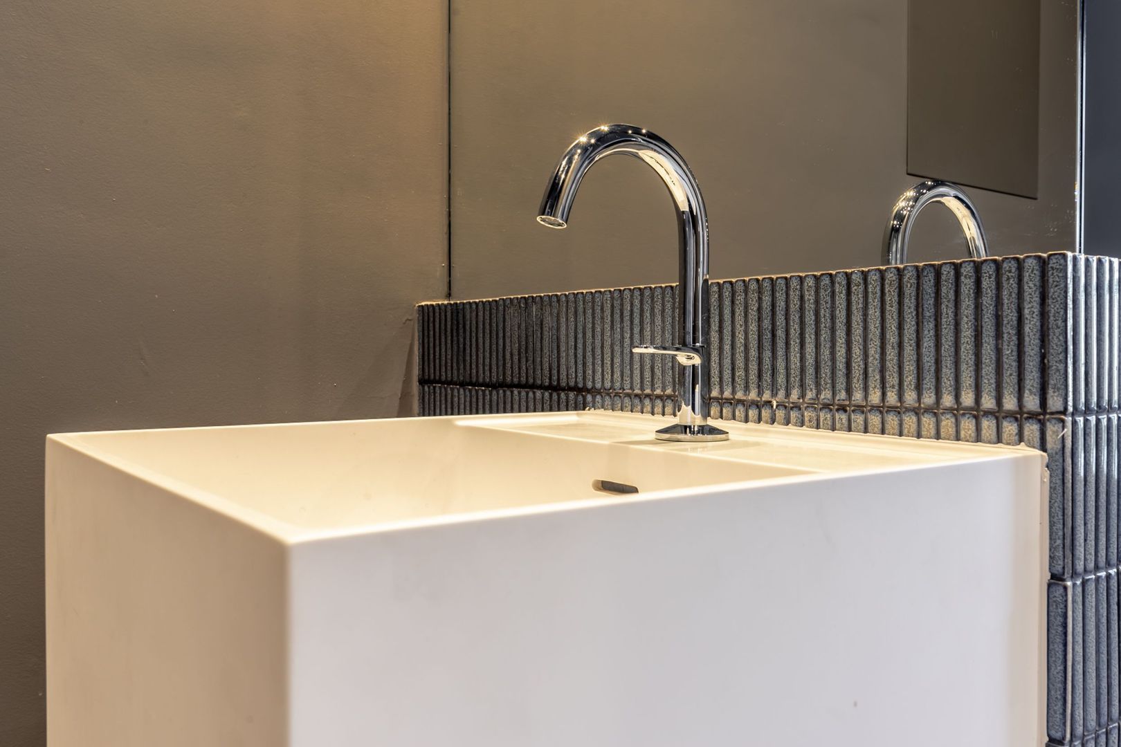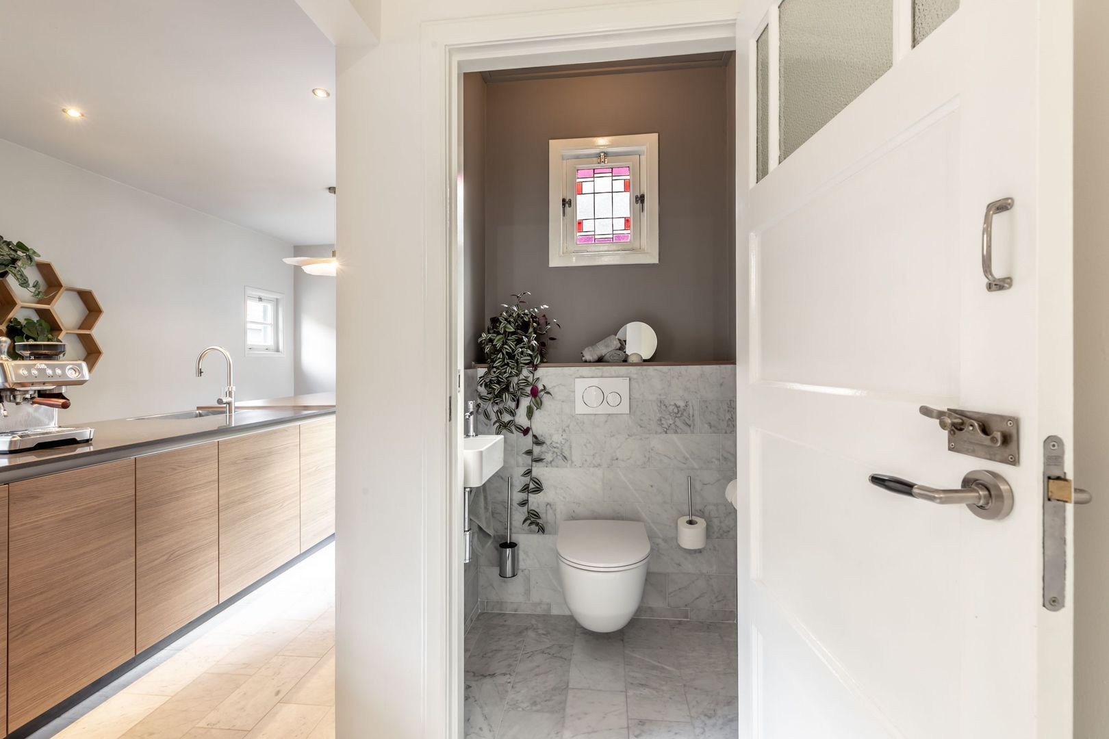 Het mooi afgewerkte toilet heeft een zwevend closet en wastafel.