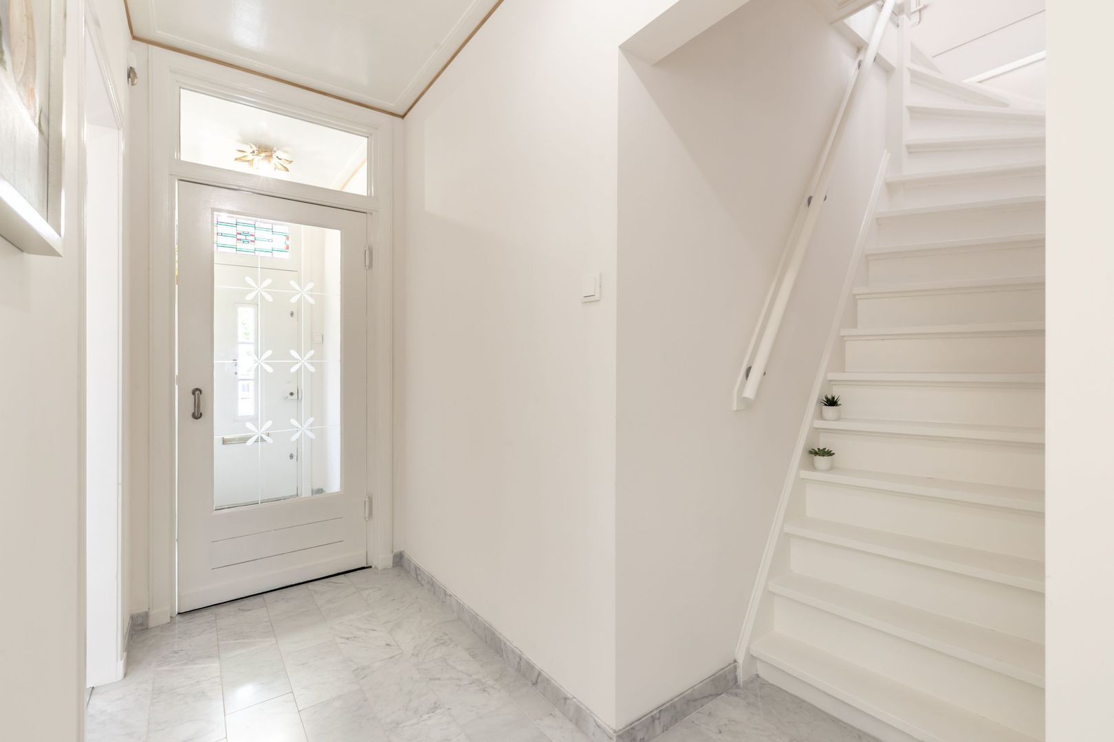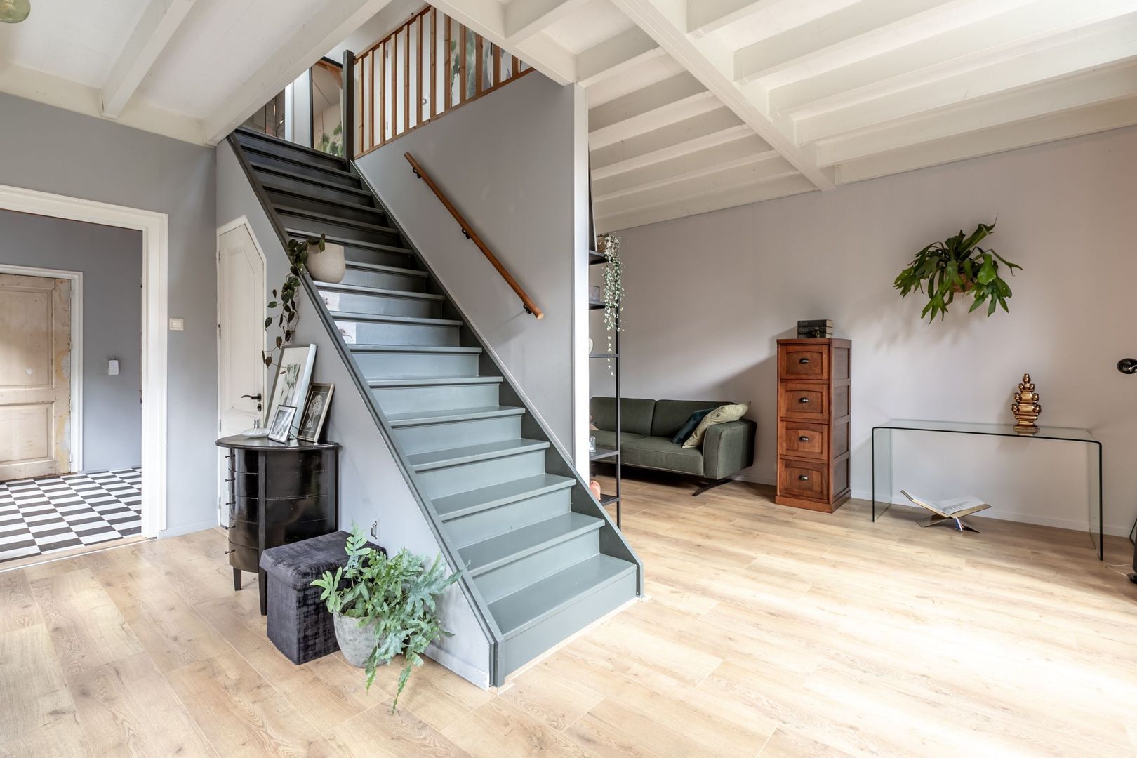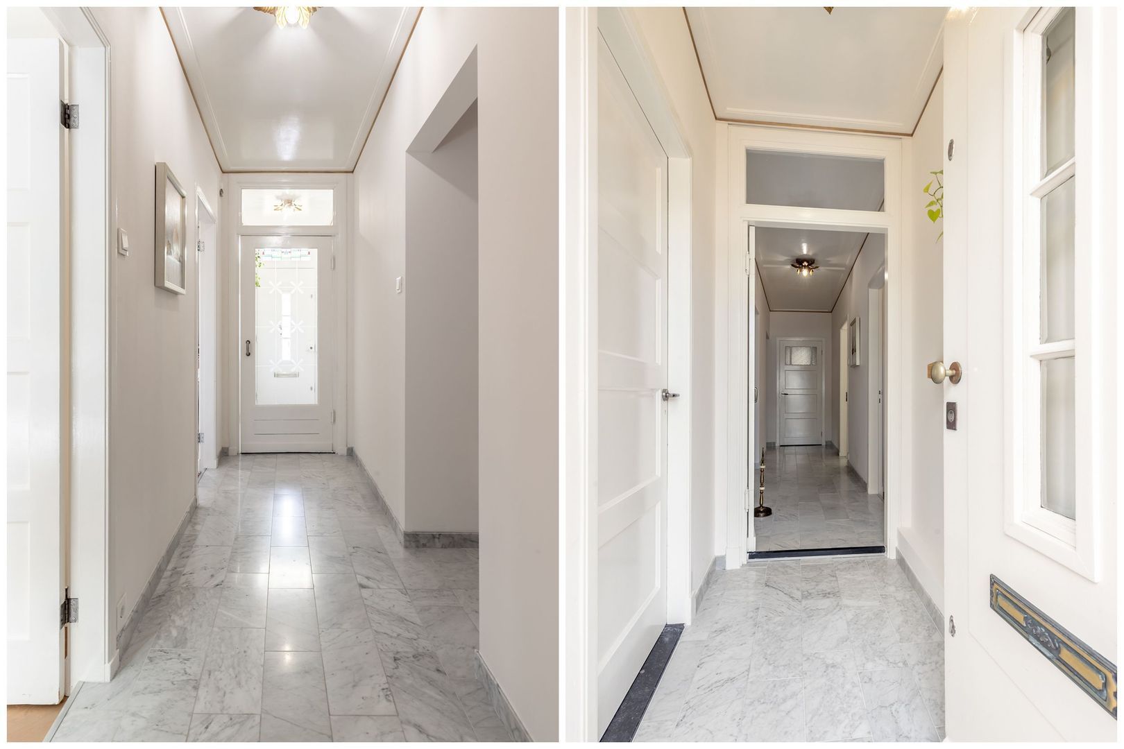 De beleving begint al wanneer je de woning via de fraaie hal betreedt; de vloer, het plafond, de binnendeuren; het past allemaal perfect in het plaatje. Vanuit hier is er toegang tot de woonkamer, werkkamer, trapopgang, toilet en keuken.