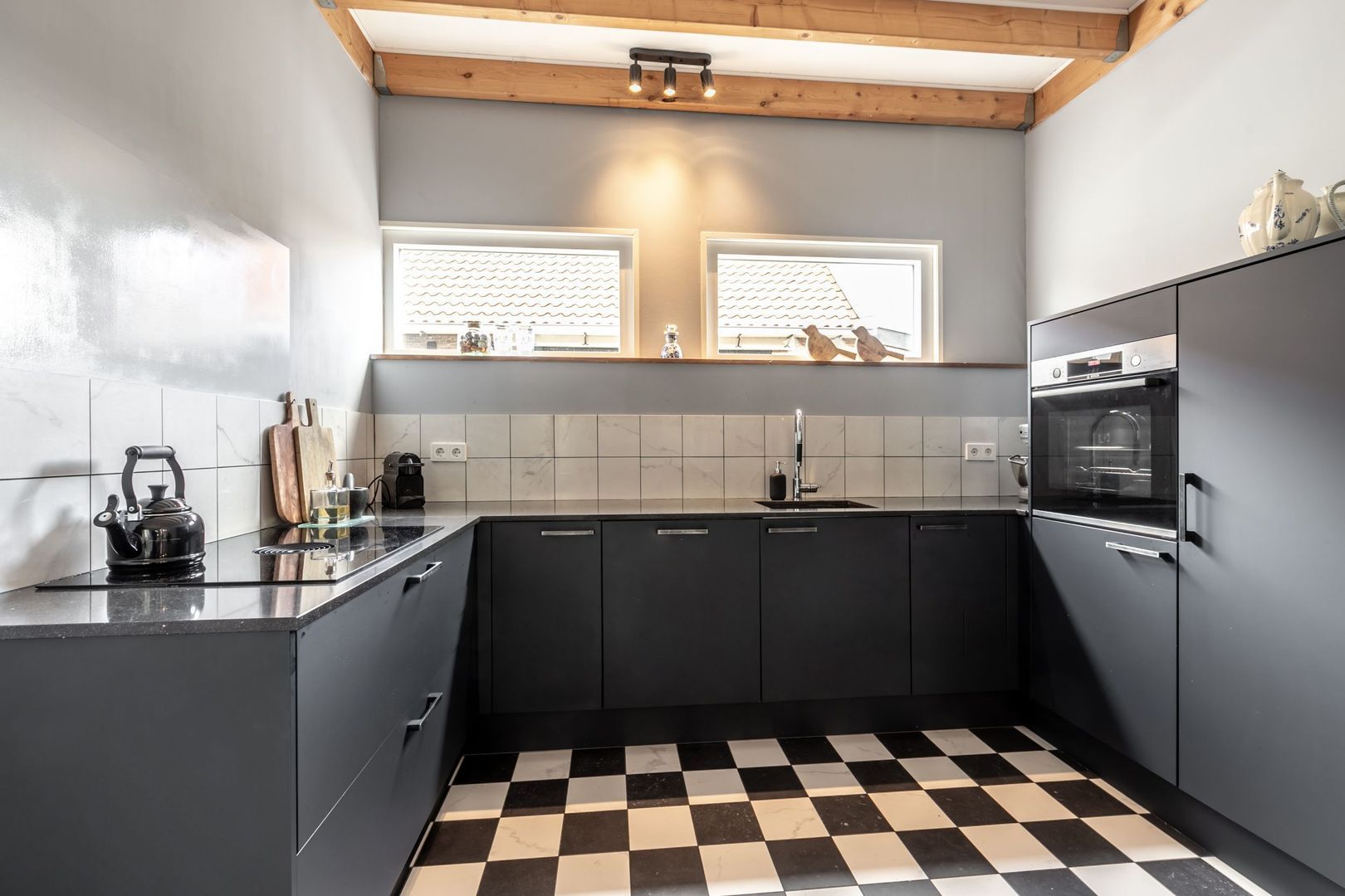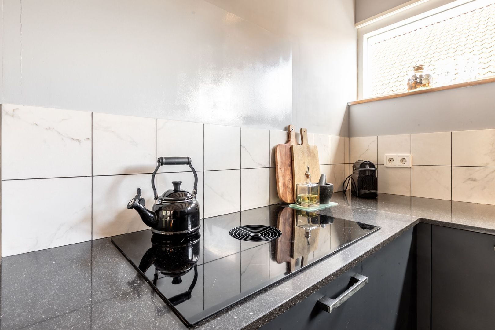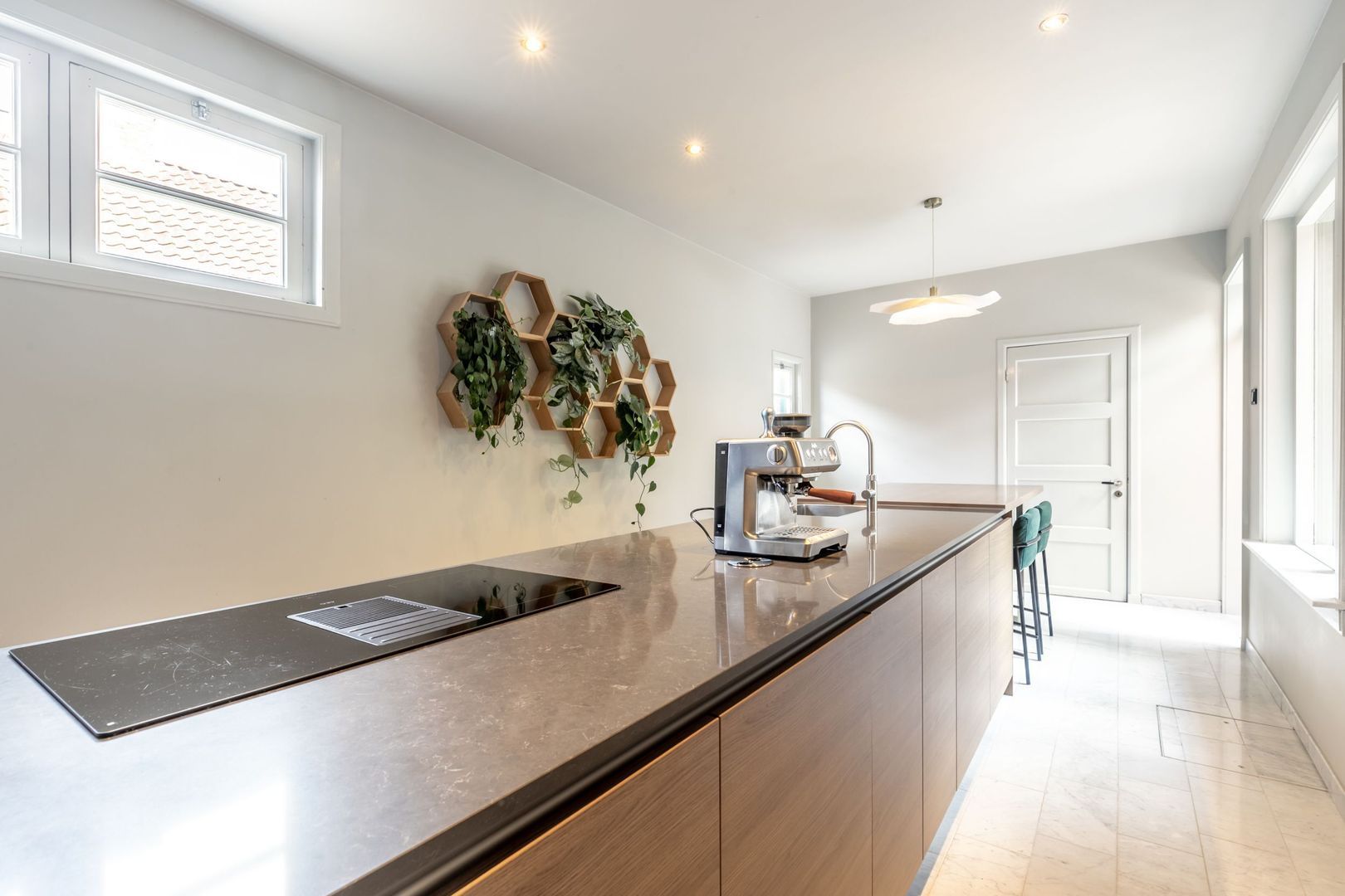 De moderne keuken is in U-opstelling en voorzien van inbouwapparatuur, zoals een inductiekookplaat met geïntegreerd afzuigsysteem, spoelbak, vaatwasser, oven en koelkast met vriesvak.