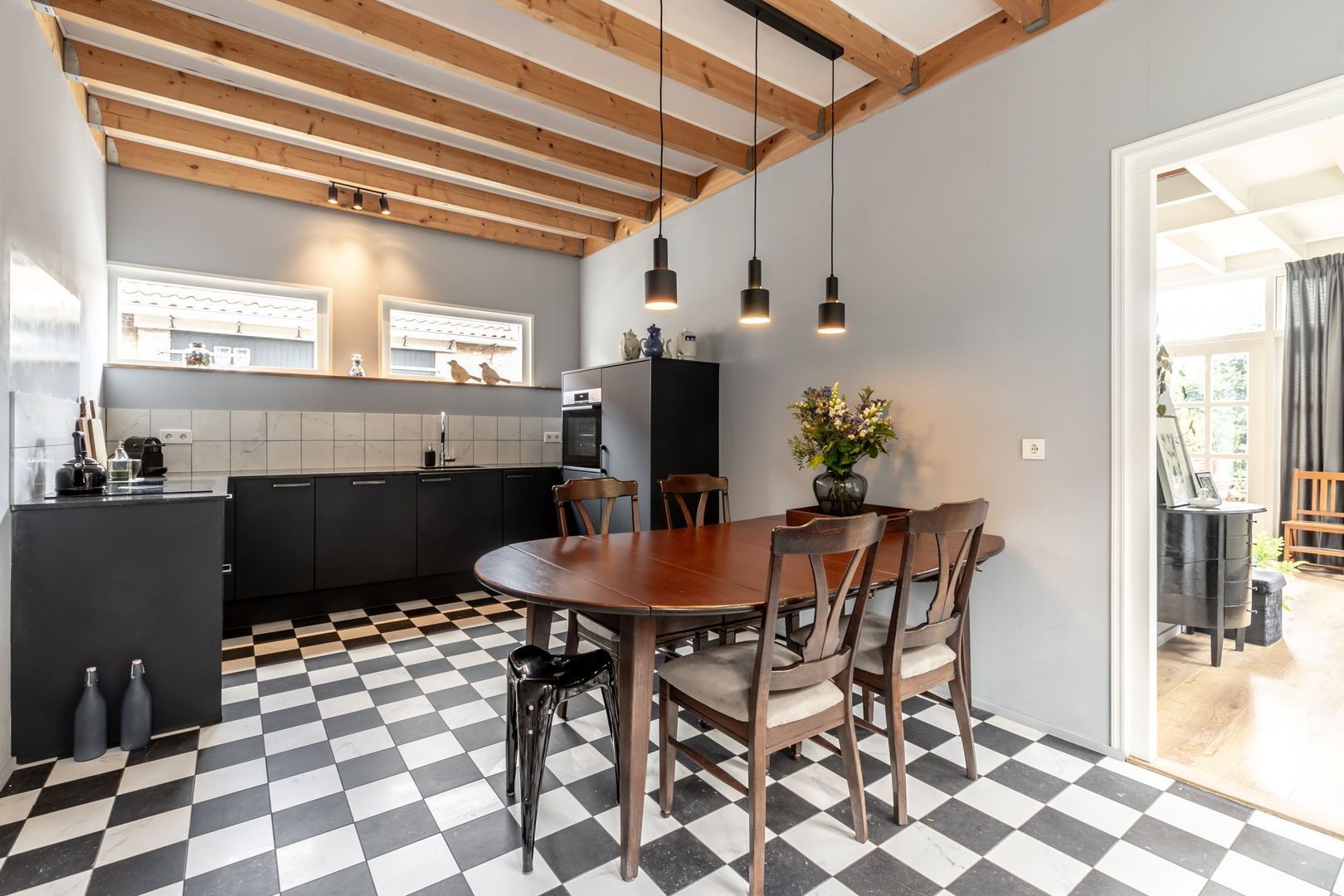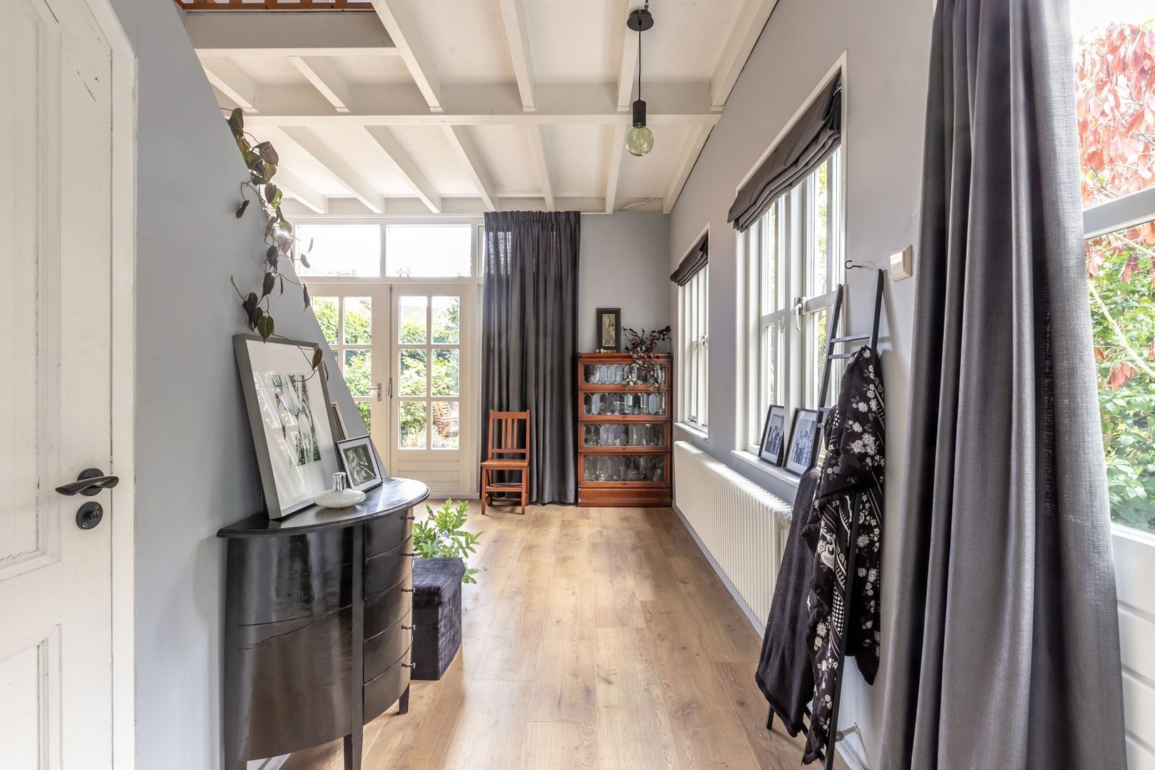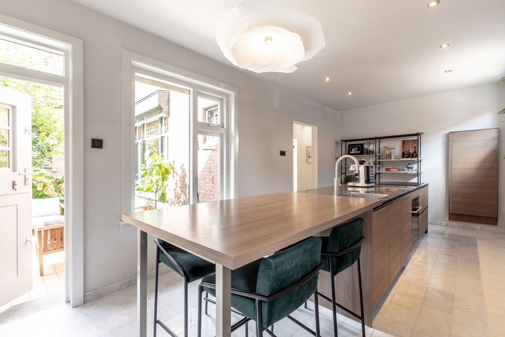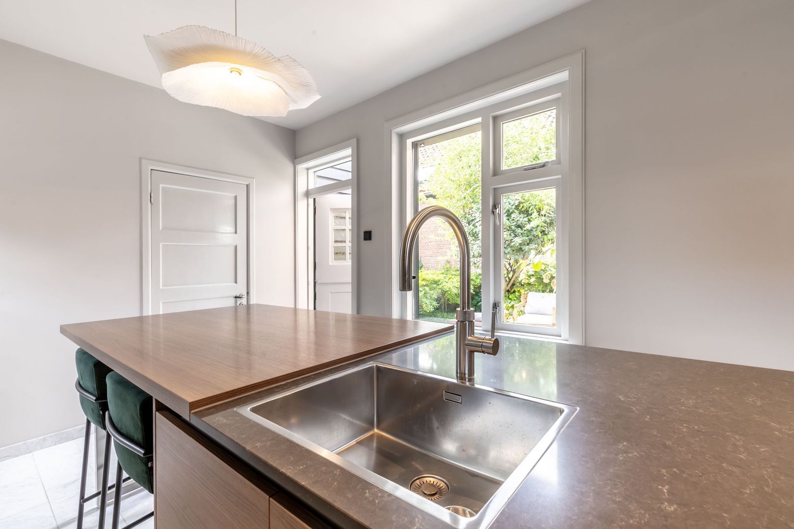 Vanuit deze ruimte is er niet alleen toegang tot de tuin maar stap je ook zo in de fraaie en ruime woonkeuken van het achterhuis dat net zo luxe en in detail is afgewerkt als de rest.