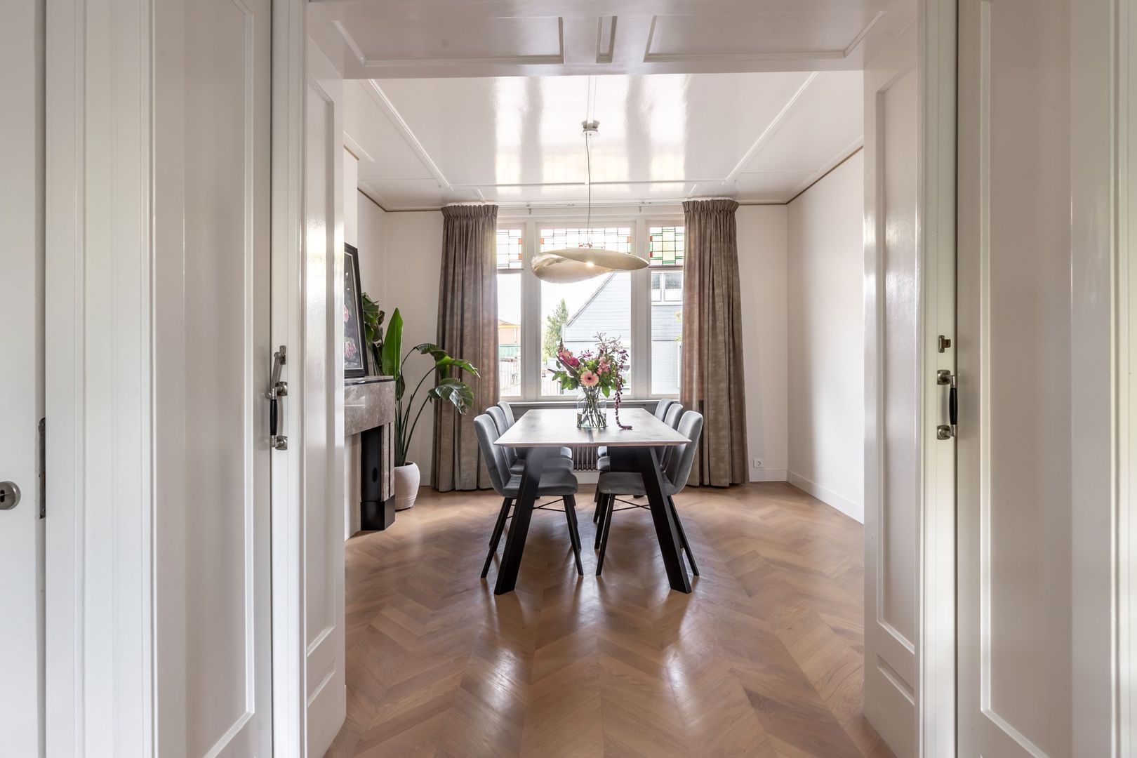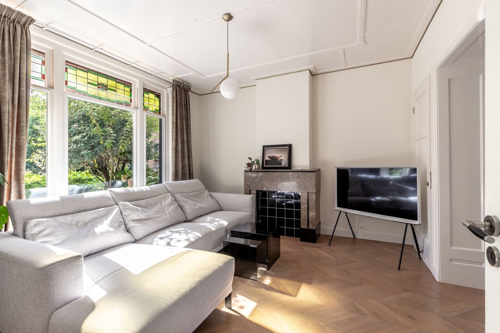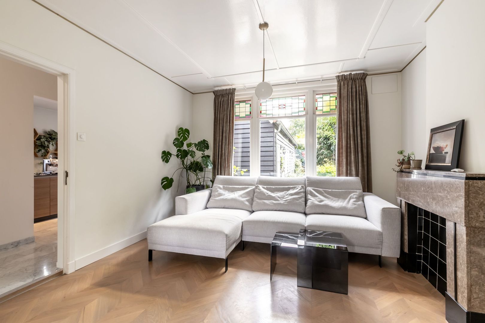 Laat je verrassen door de riante woonkamer met dubbele schouw, fraaie ensuite deuren en fijne lichtinval door de glas-in-loodramen.