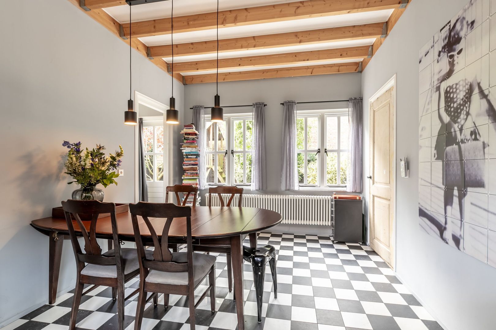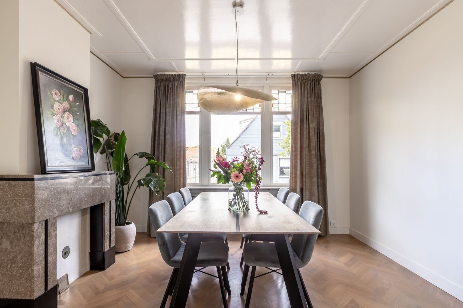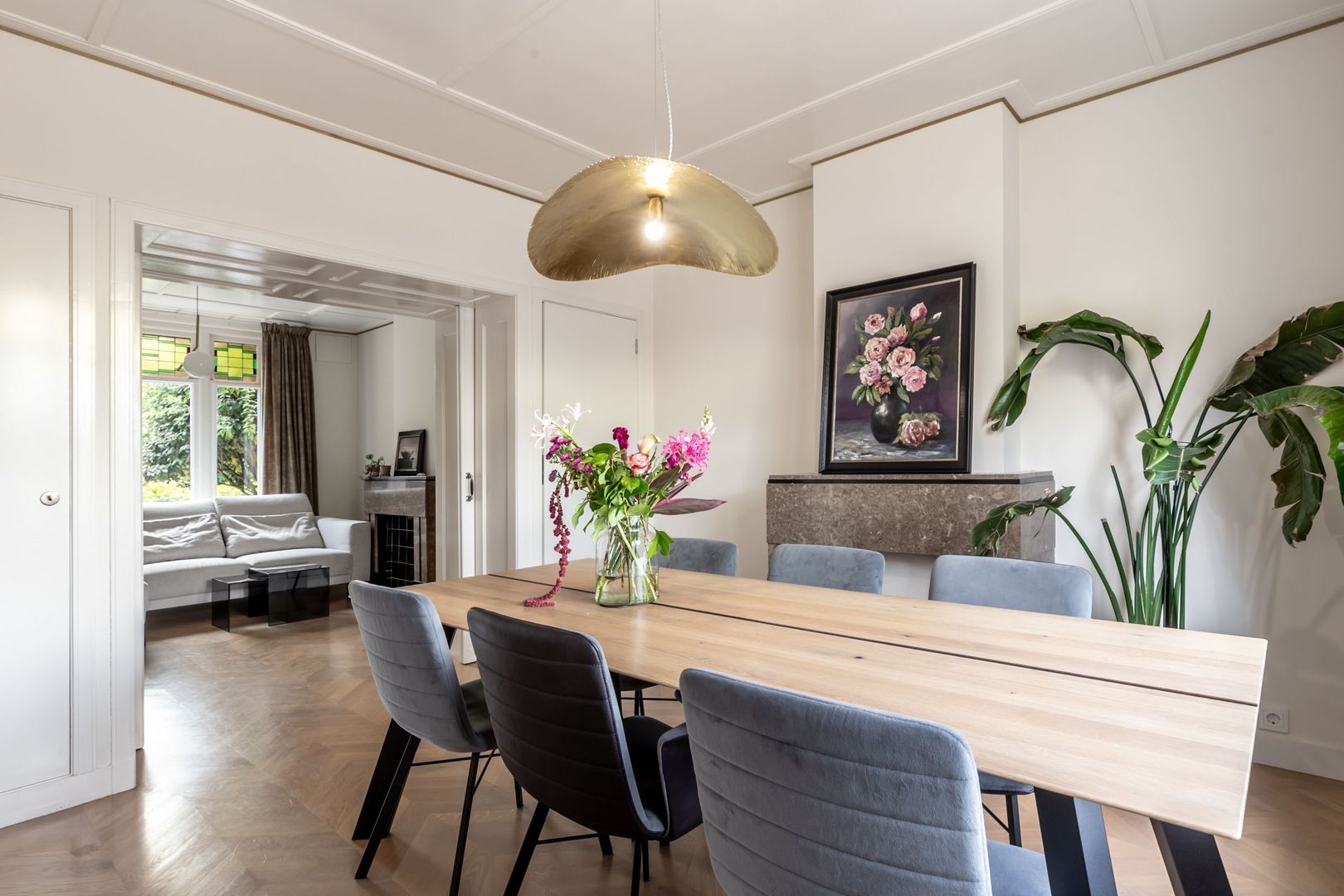 Laat je verrassen door de riante woonkamer met dubbele schouw, fraaie ensuite deuren en fijne lichtinval door de glas-in-loodramen.