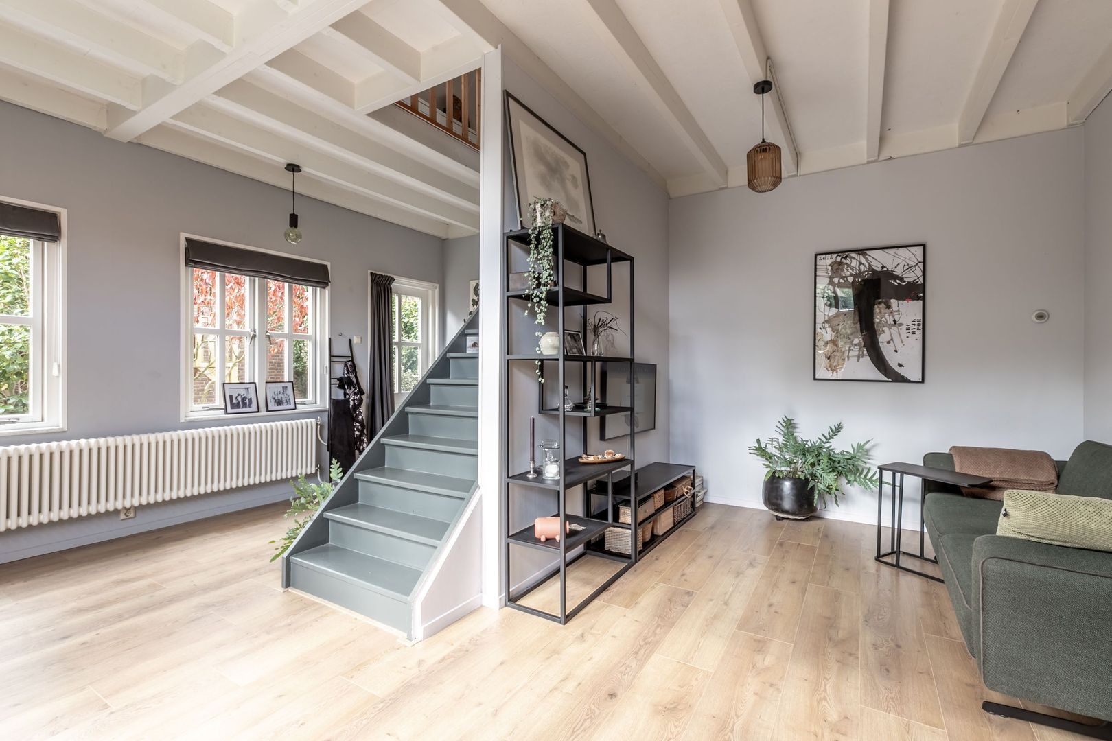 Vanuit de keuken stap je zo in de bijzonder sfeervolle woonkamer. De vele raampartijen en openslaande deuren richting het terras zorgen voor een fijne lichtinval. Er is een open trapopgang naar de verdieping en een toiletruimte met zwevend closet.