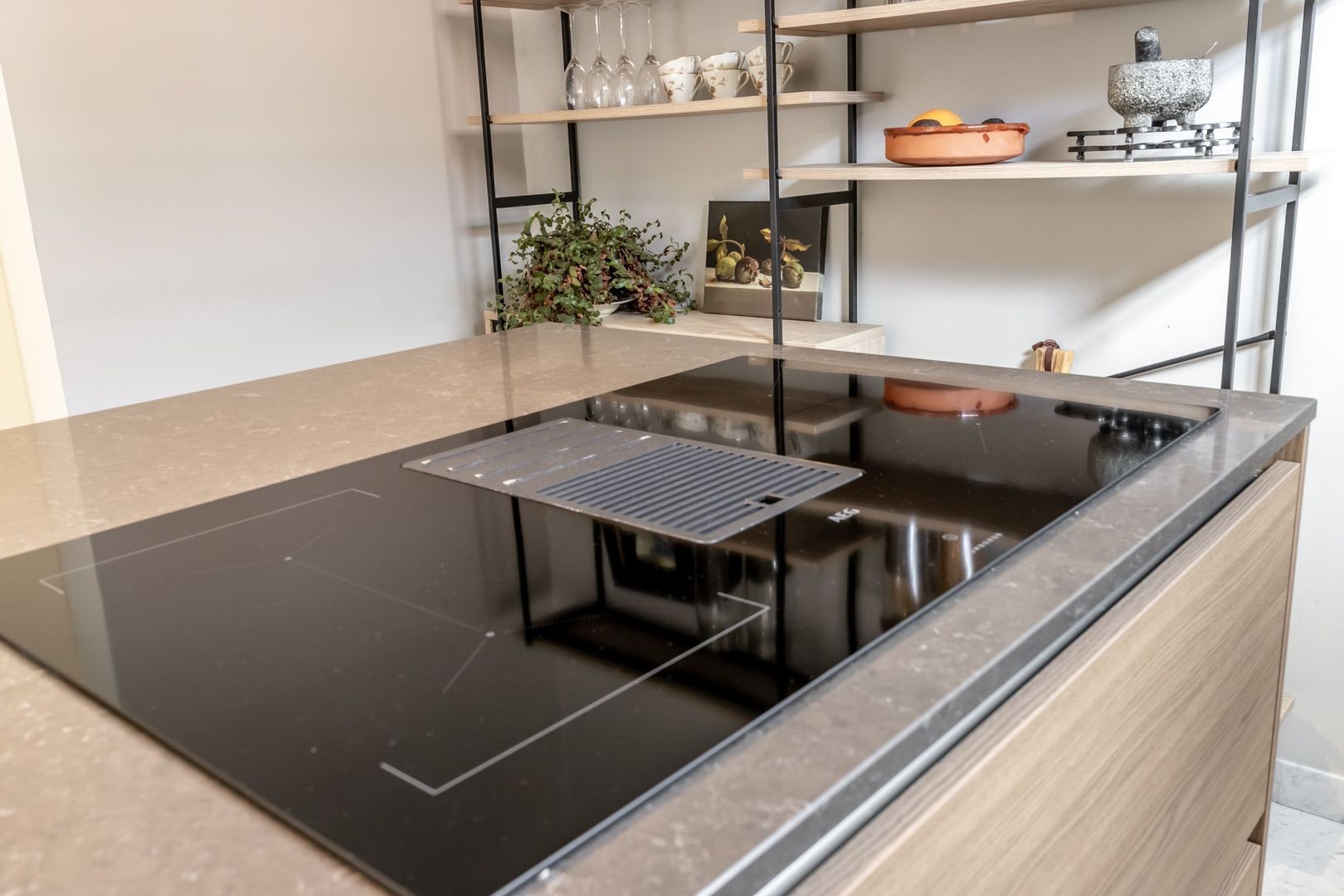 De moderne keuken is bijzonder ruim en sfeervol en is voorzien van een kookeiland met inbouwapparatuur zoals een inductiekookplaat met geïntegreerd afzuigsysteem, een spoelbak met Quooker kraan, vaatwasser en oven. De koelkast is fraai weggewerkt in een nis in de muur.