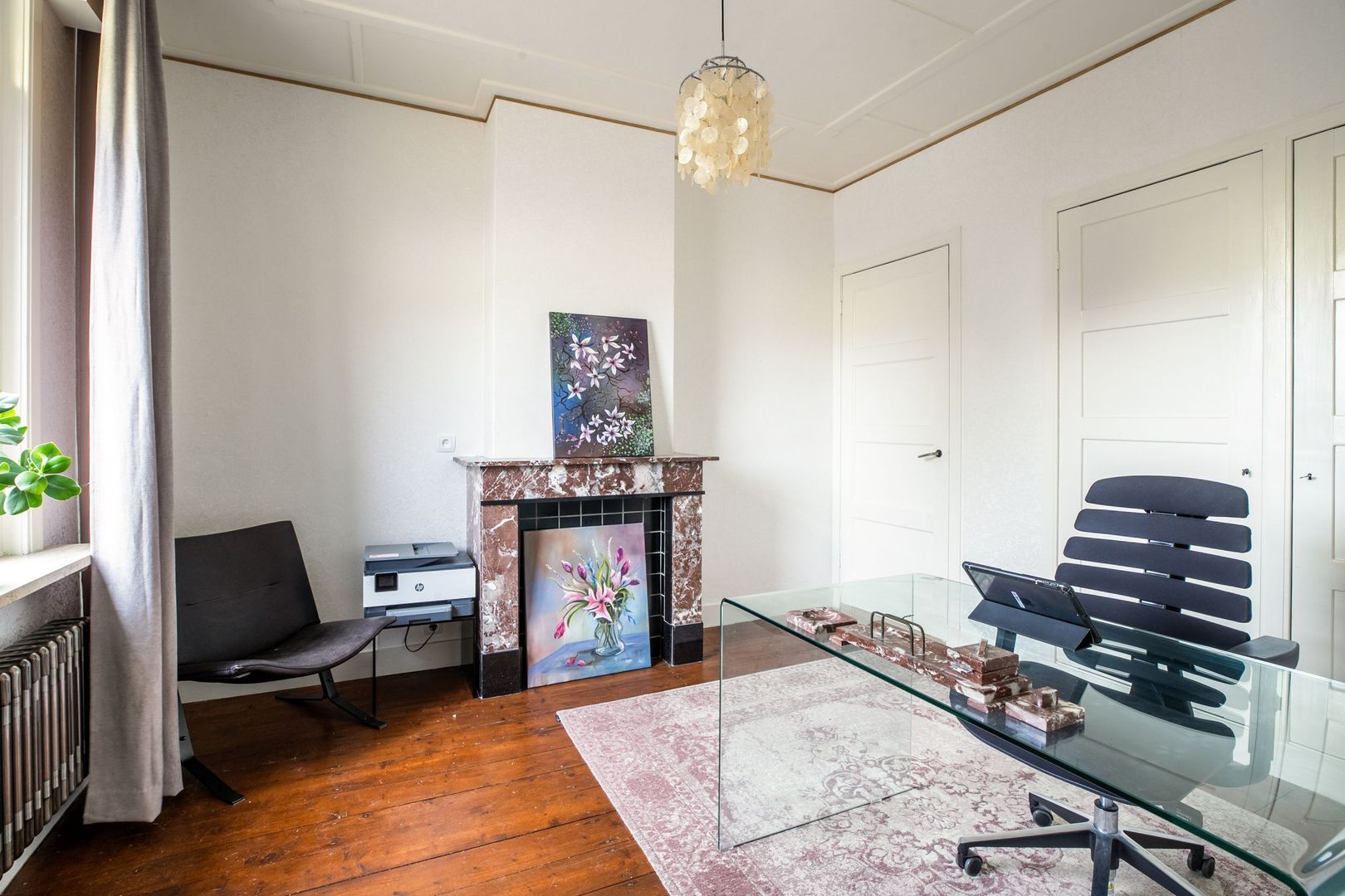 De werkkamer is gelegen aan de straatzijde, heeft een schouw in dezelfde stijl en twee vaste kasten.