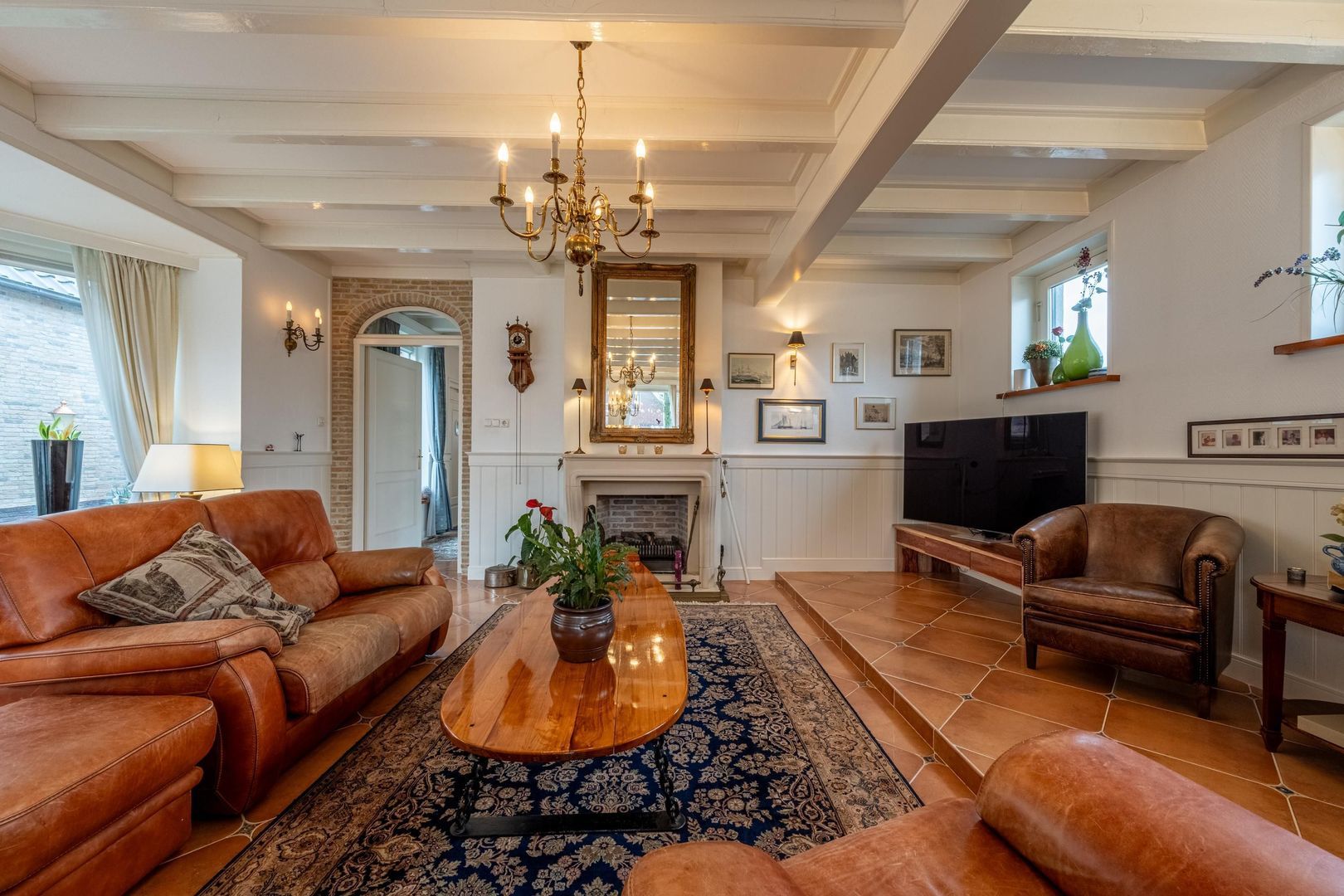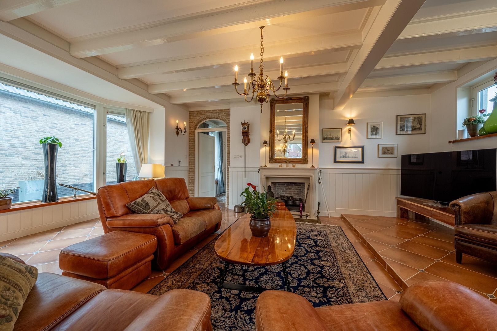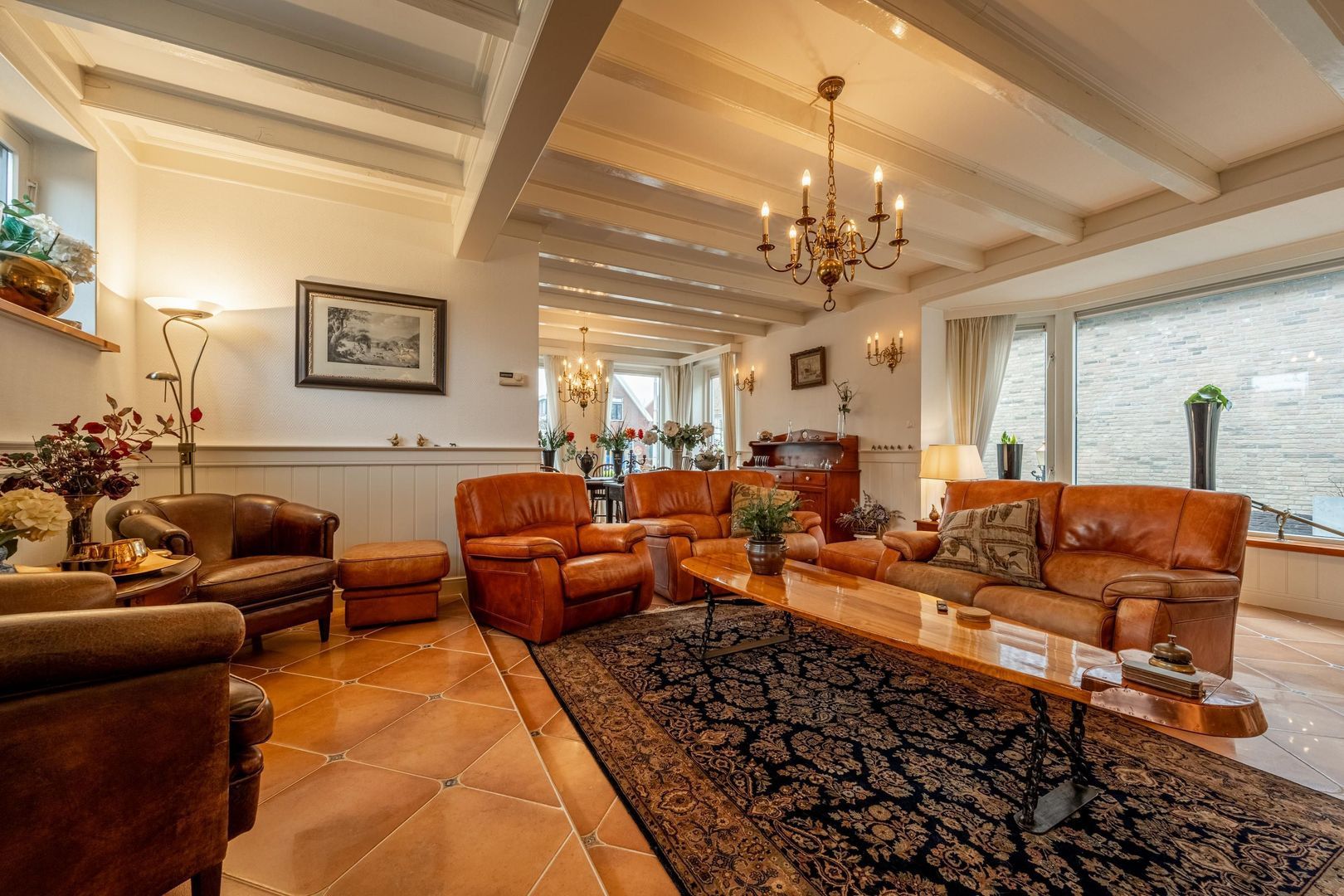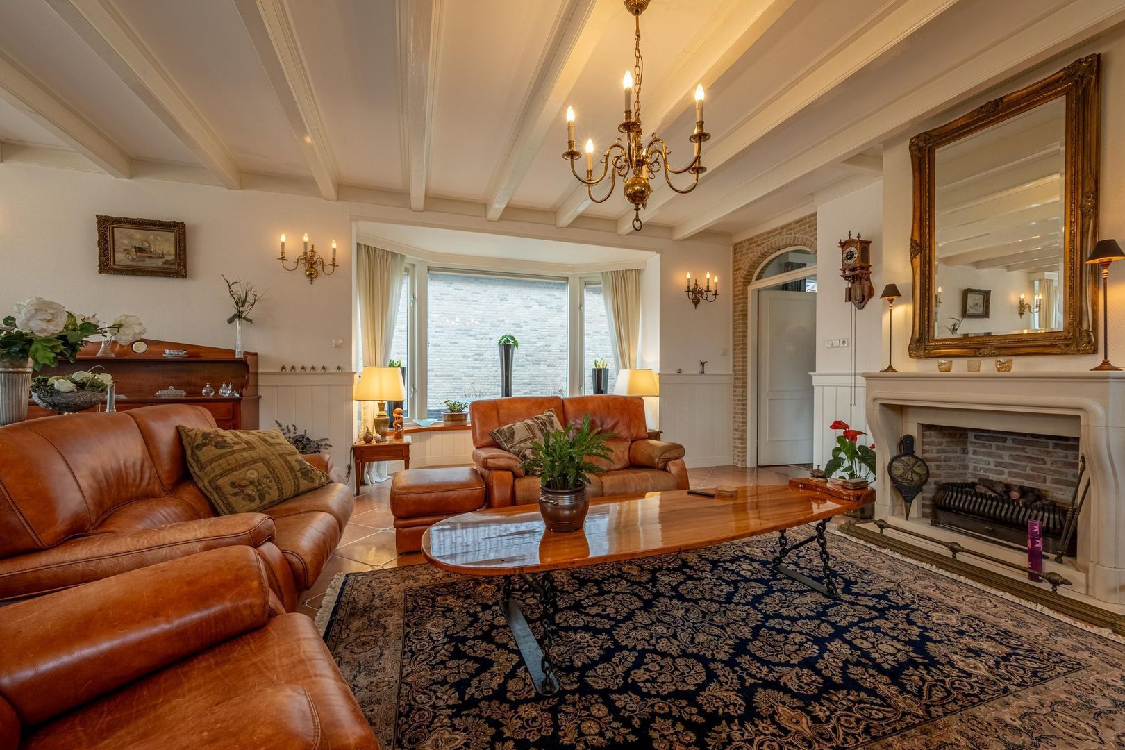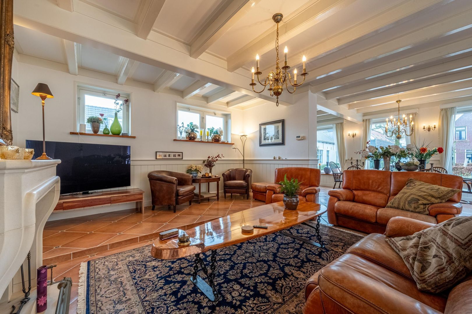 De woonkamer grenst aan de straat. Deze heeft een royaal formaat en beschikt over een mooie schouw met gashaard. De erker in de zijgevel zorgt voor veel extra licht en een prettige lichtinval.