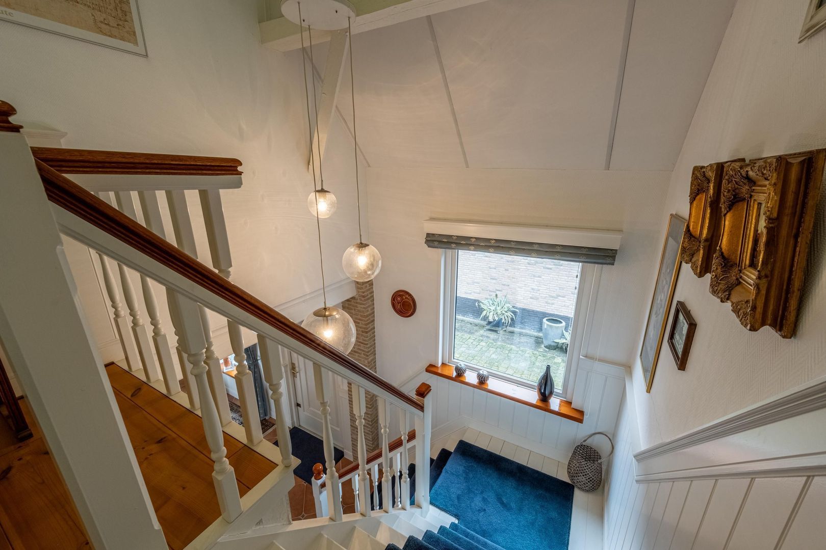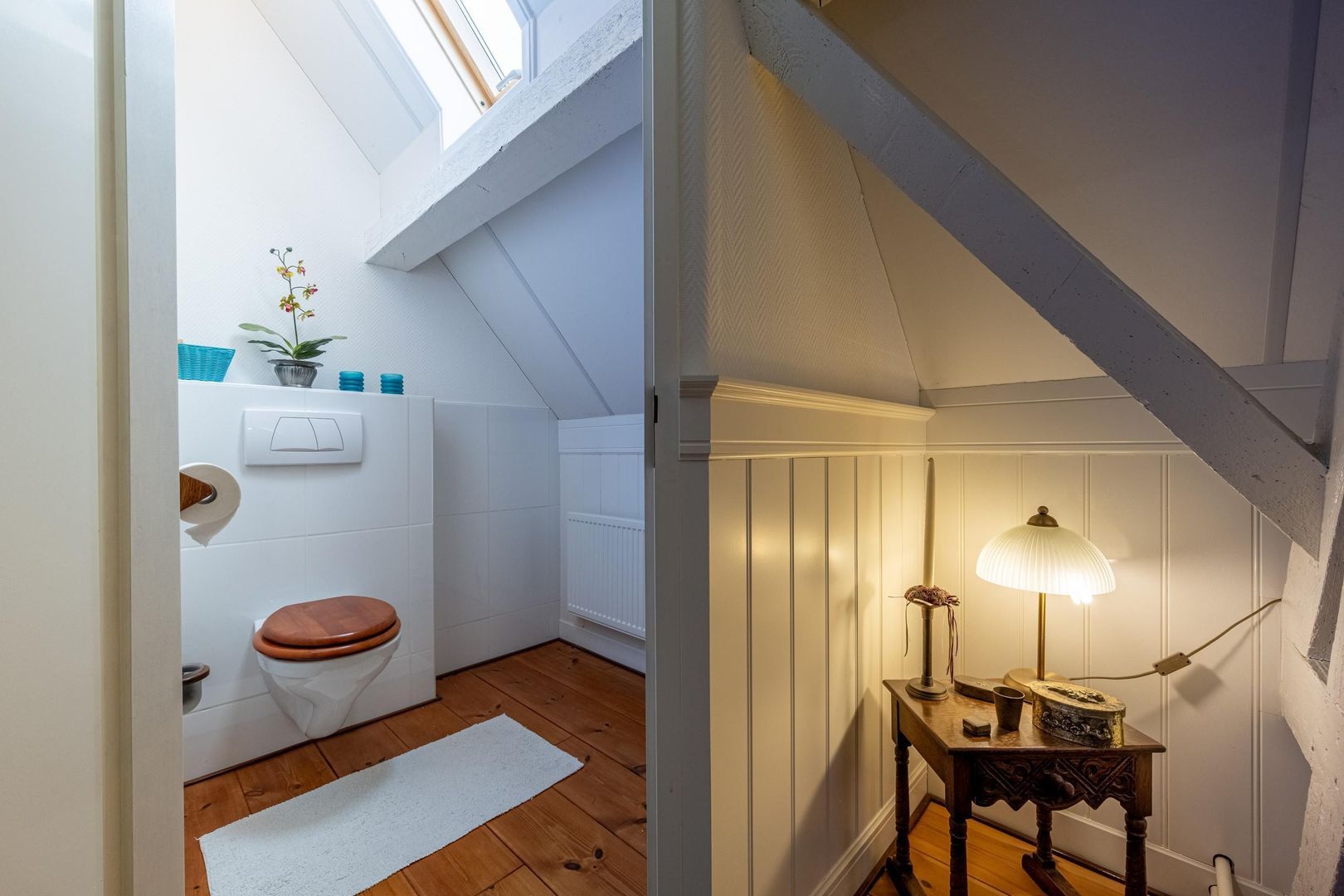 Op de verdieping zijn drie slaapkamers, een tweede badkamer en een aparte toiletruimte.