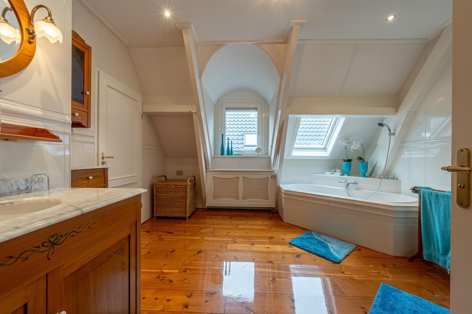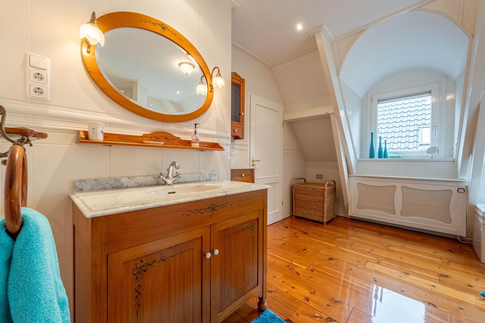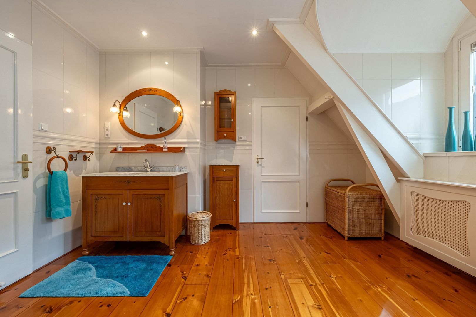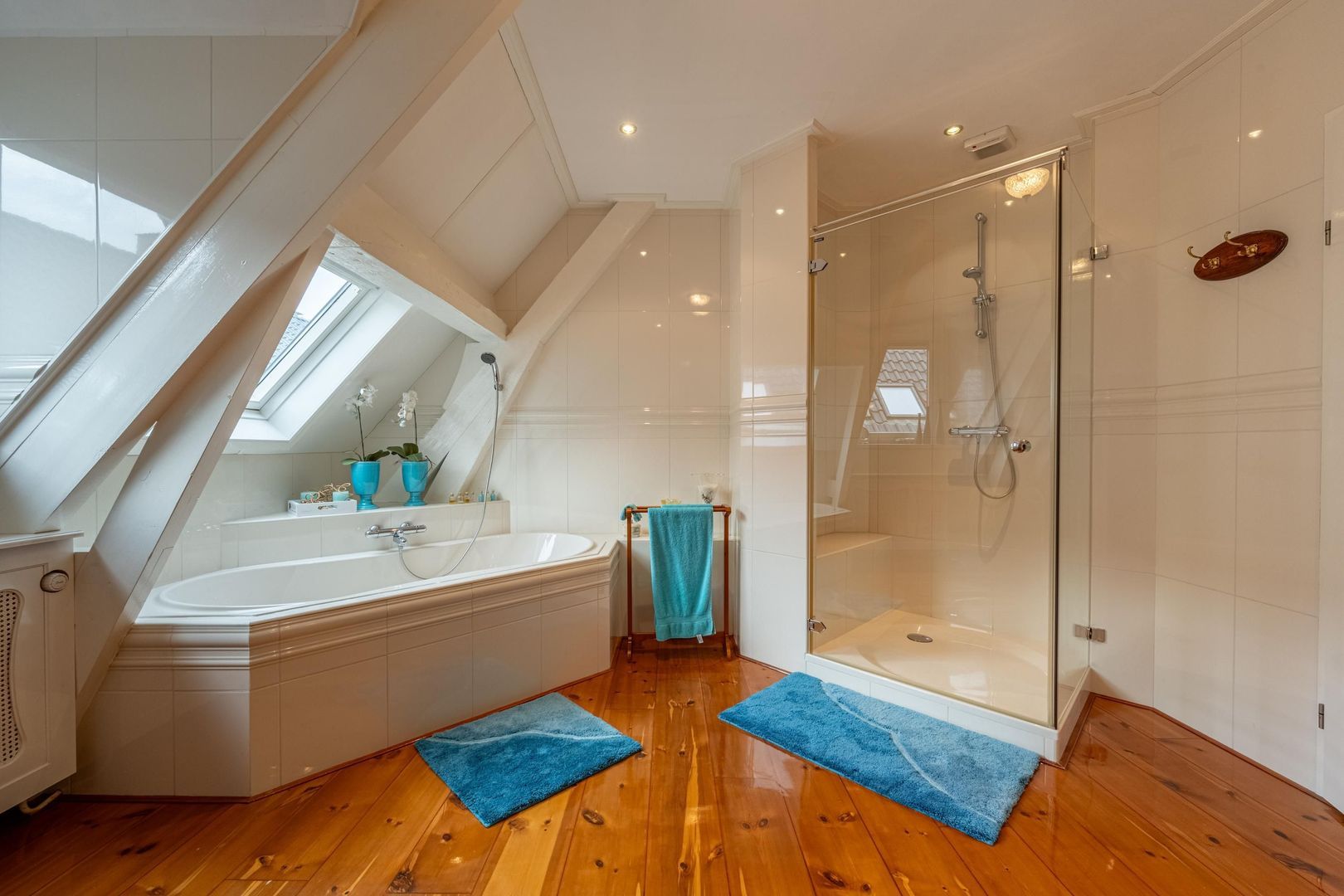 De prachtige badkamer is ingericht in een klassieke stijl met o.a. een douchegelegenheid, een ligbad, een wastafelmeubel met spiegel en een bijpassend houten opbergkastje. De halfrond afgewerkt dakkapel zorgt voor een leuk nisje. De houten vloer is afgewerkt met epoxy en is zodoende bestand tegen water. Praktisch is de vaste kast met veel extra bergruimte.