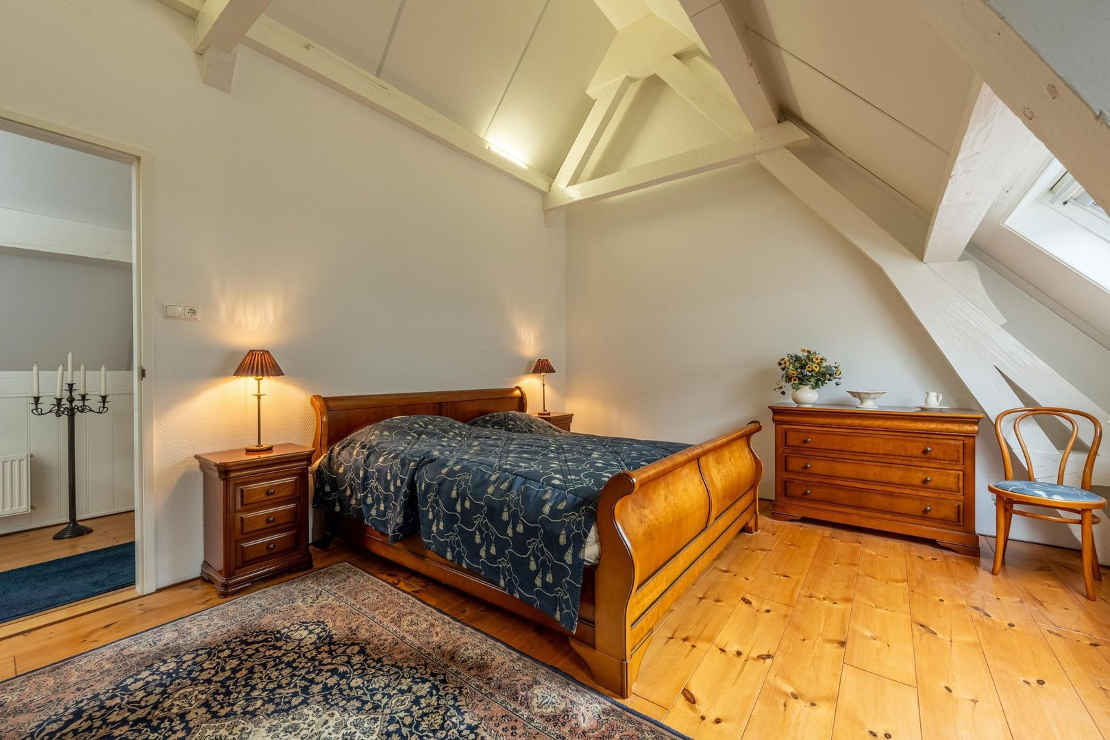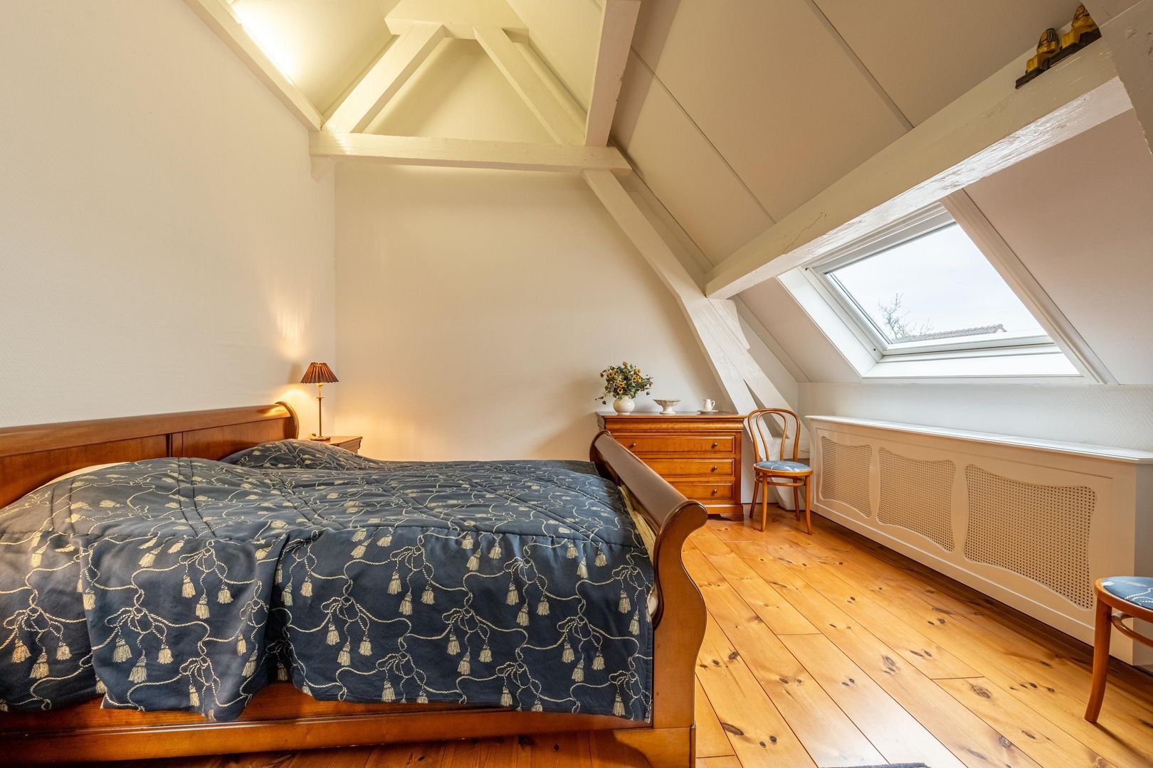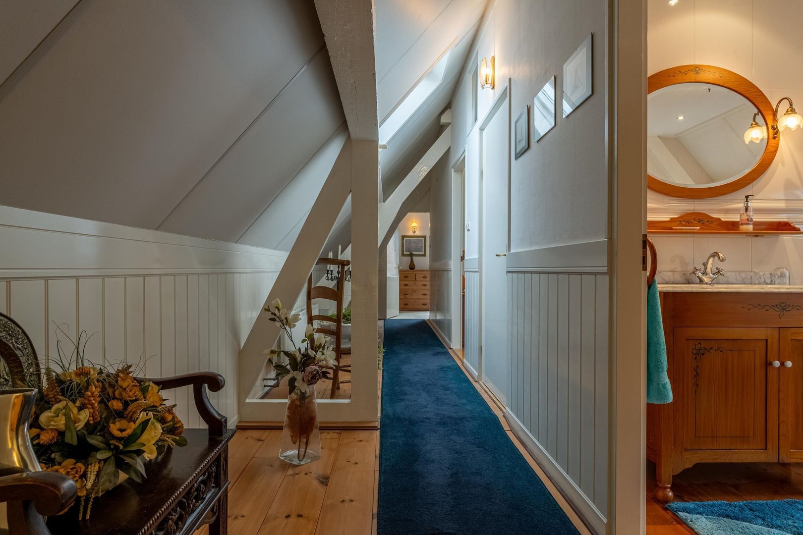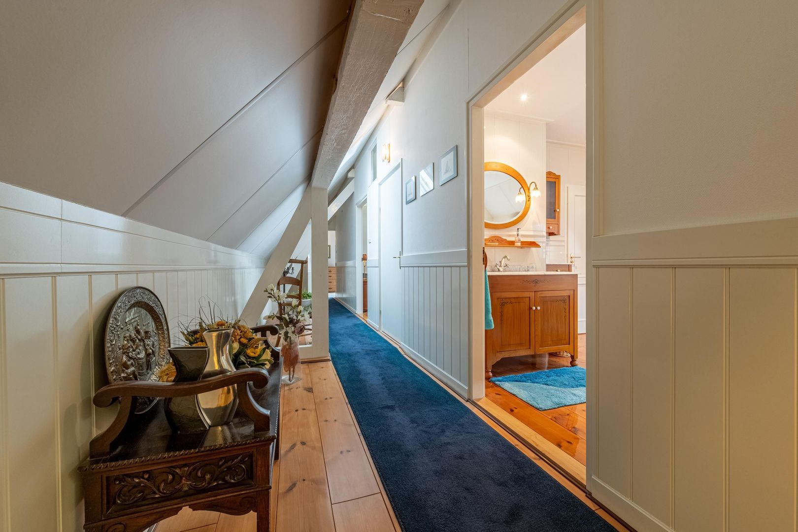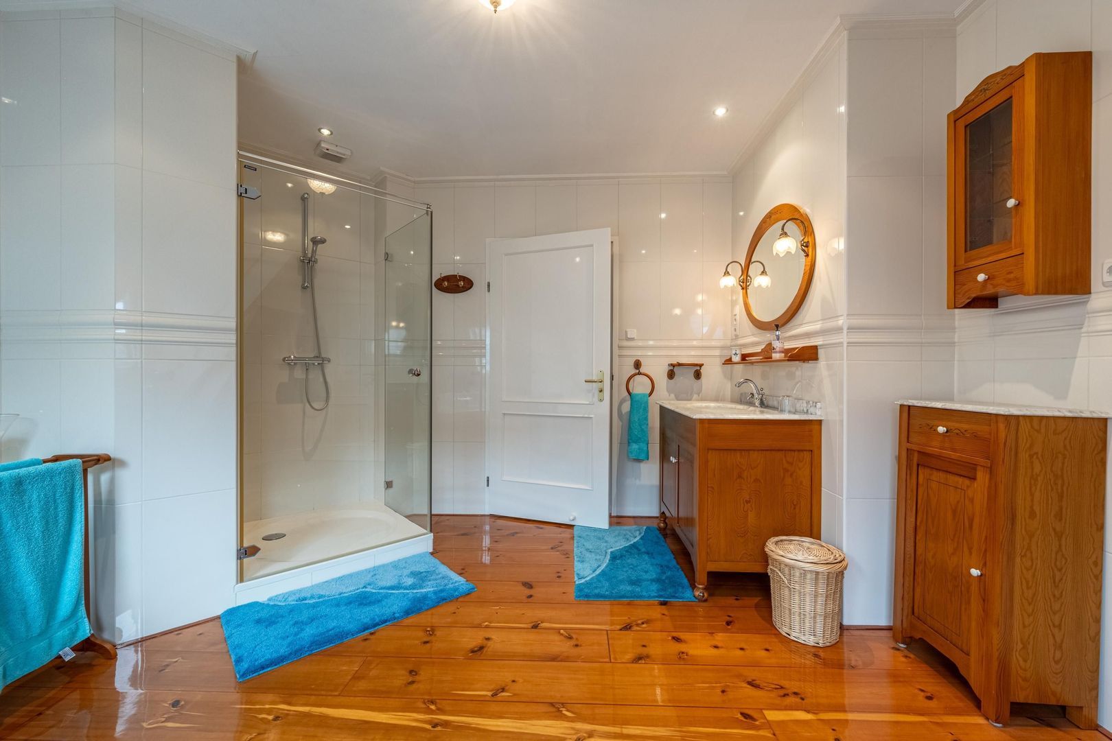 De prachtige badkamer is ingericht in een klassieke stijl met o.a. een douchegelegenheid, een ligbad, een wastafelmeubel met spiegel en een bijpassend houten opbergkastje. De halfrond afgewerkt dakkapel zorgt voor een leuk nisje. De houten vloer is afgewerkt met epoxy en is zodoende bestand tegen water. Praktisch is de vaste kast met veel extra bergruimte.