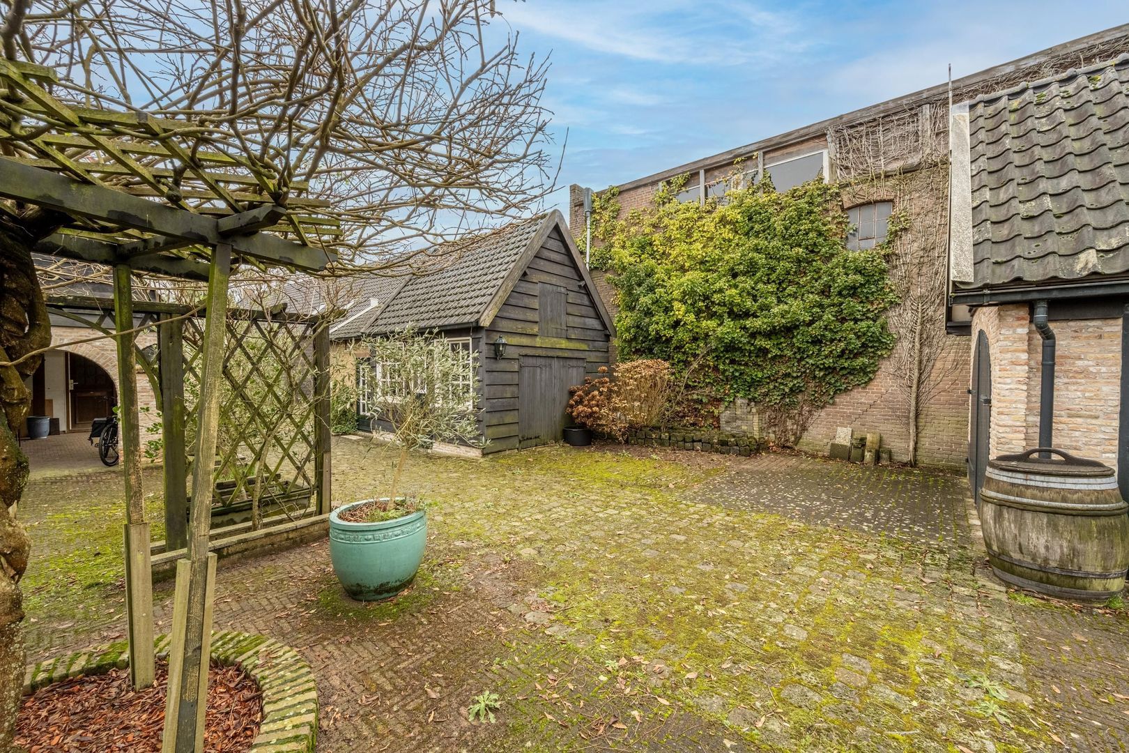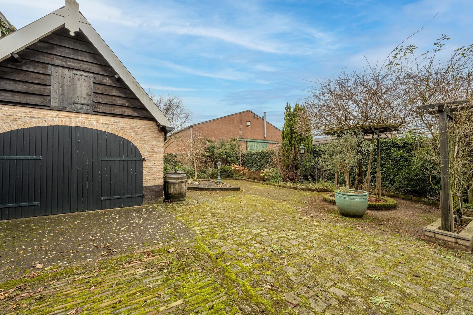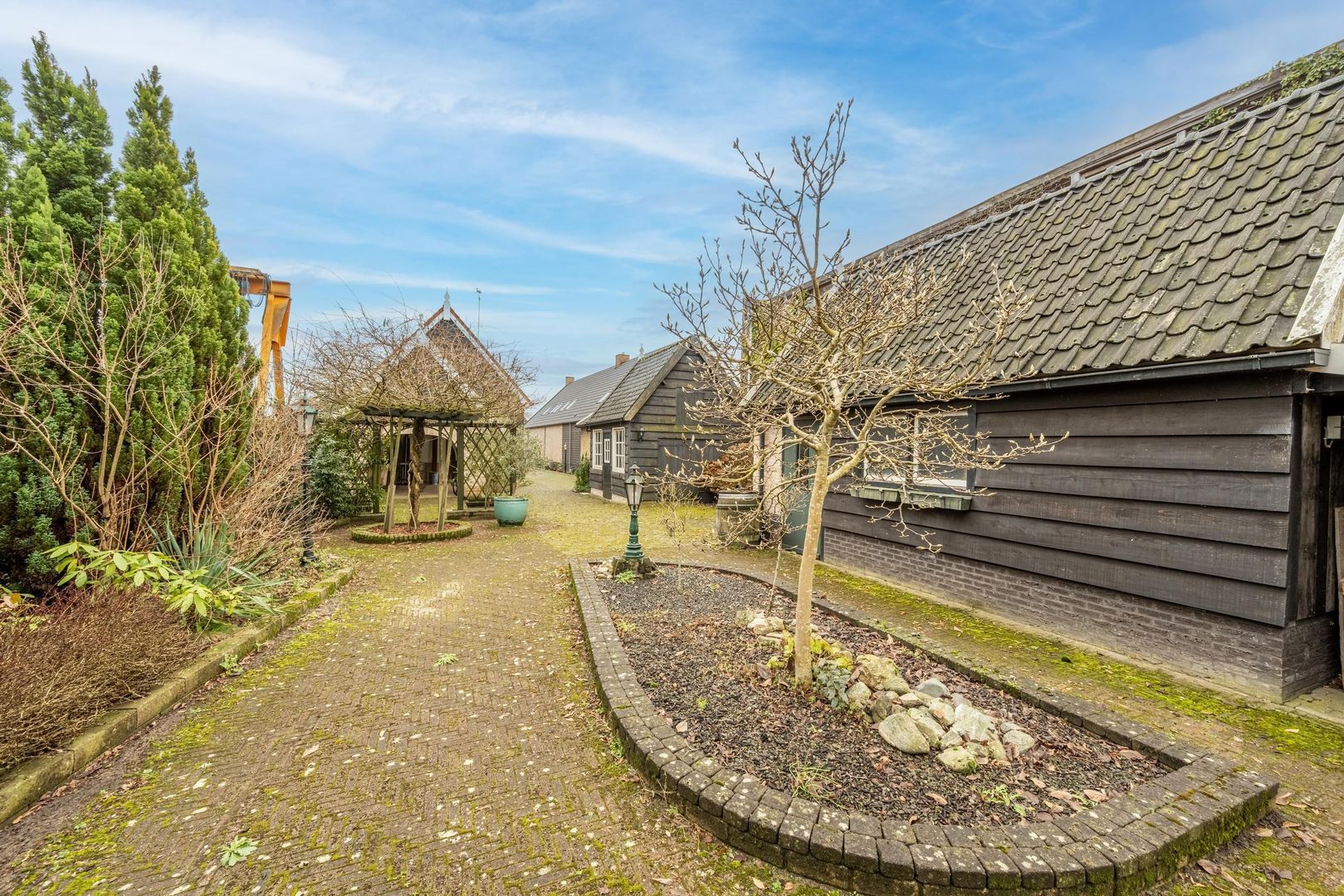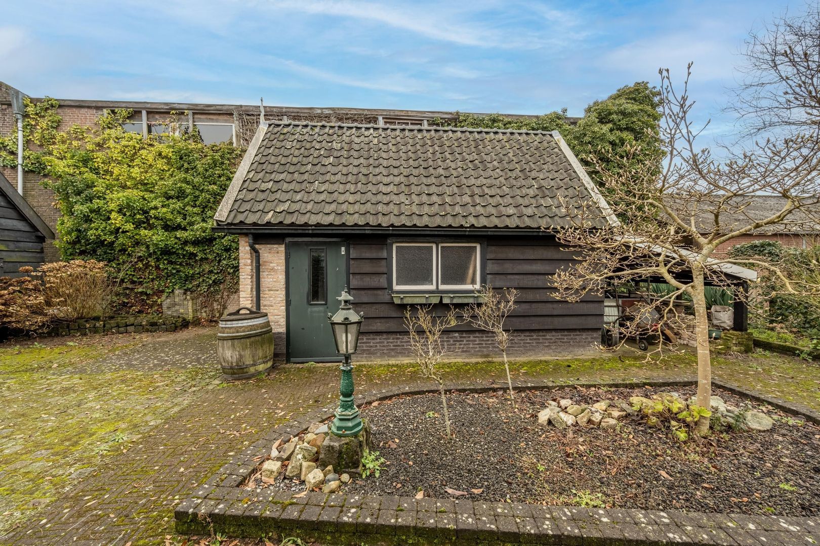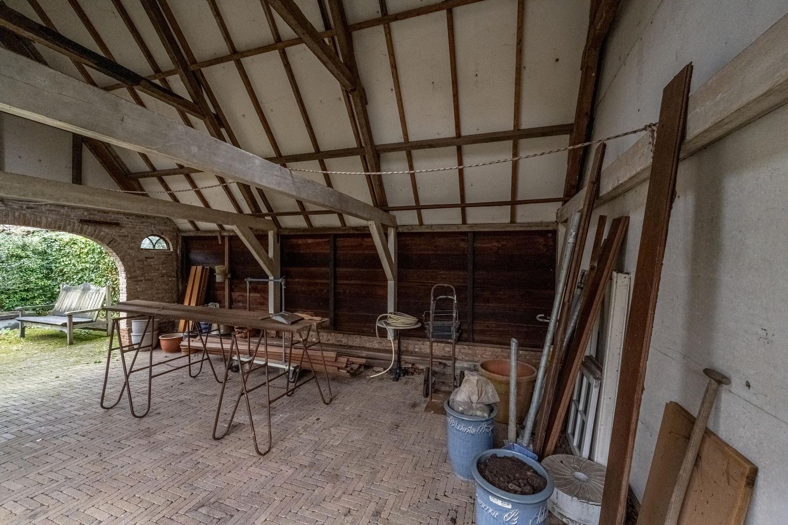 Achter het woonhuis bevinden zich diverse werkplaatsen/bergingen met aan het eind een overkapping die grenst aan de tuin.