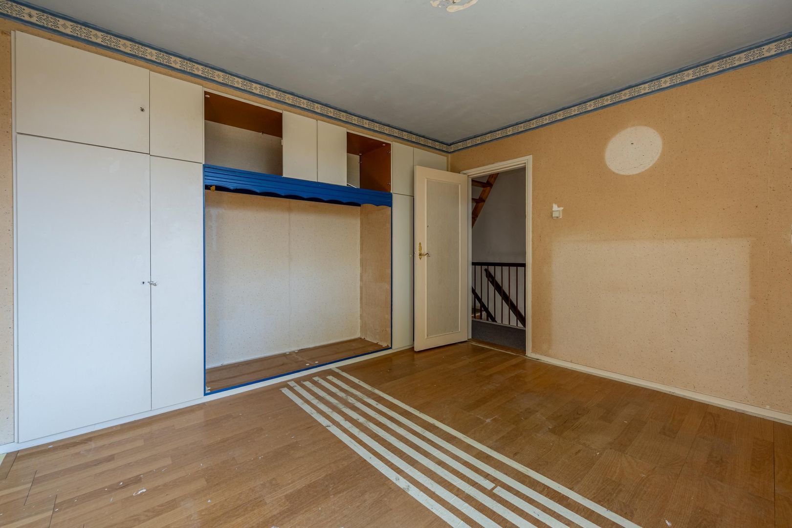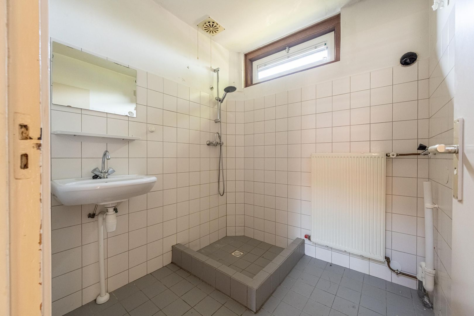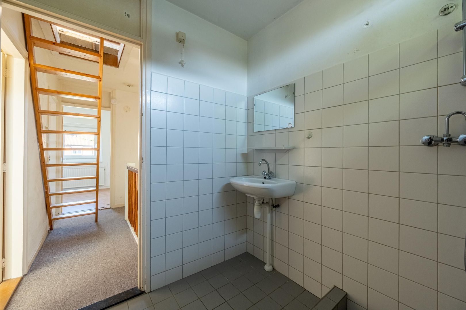 Op de eerste verdieping zijn drie slaapkamers. De badkamer is gedeeltelijk betegeld en is ingericht met een wastafel en een doucheruimte en heeft een aansluiting voor de wasmachine. Het raam kan open, zodat met frisse lucht geventileerd kan worden.