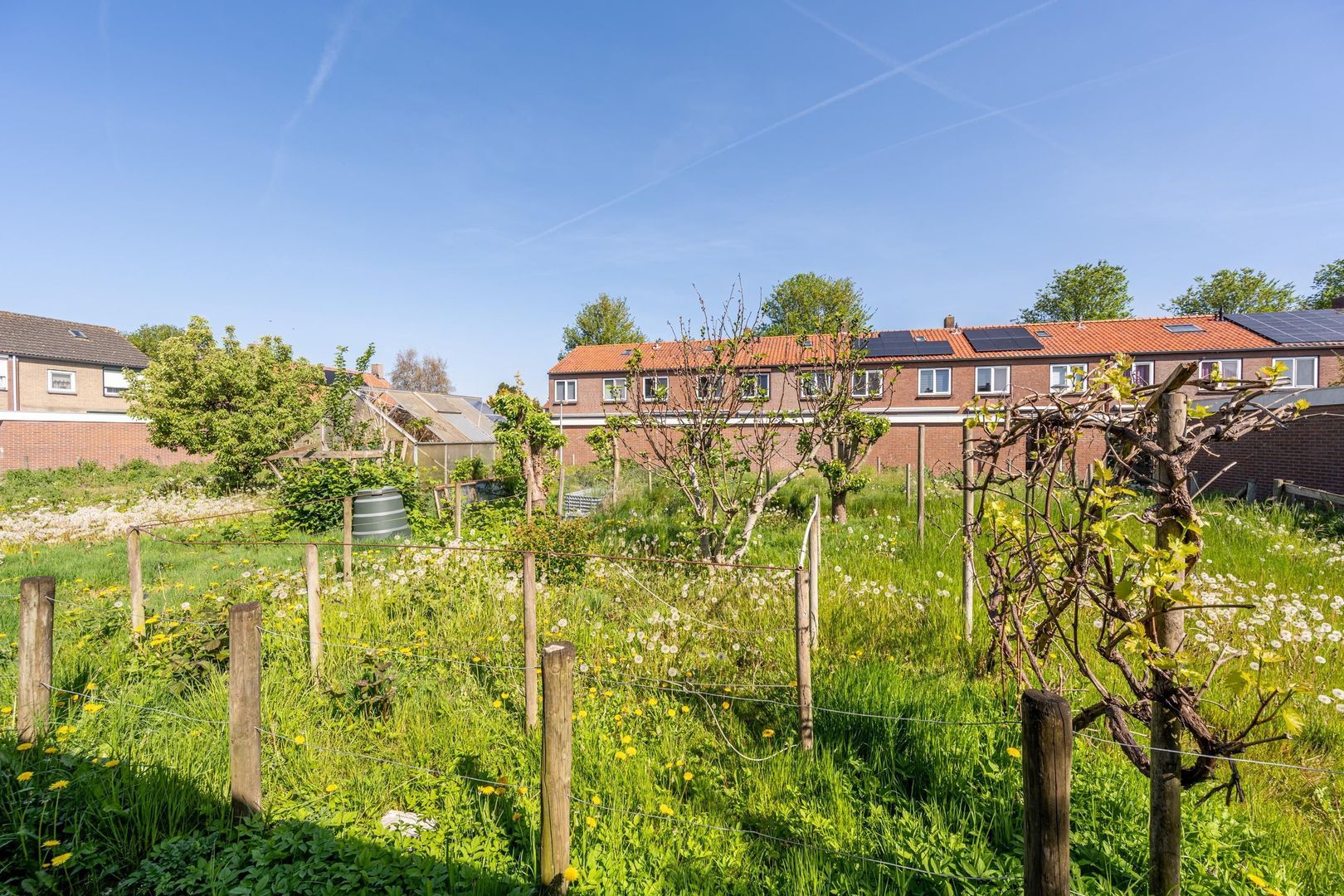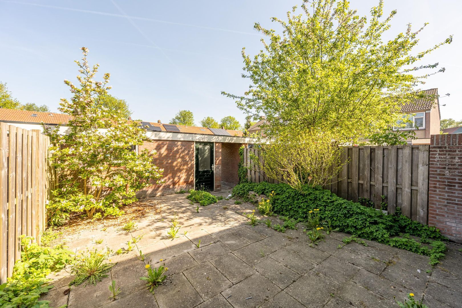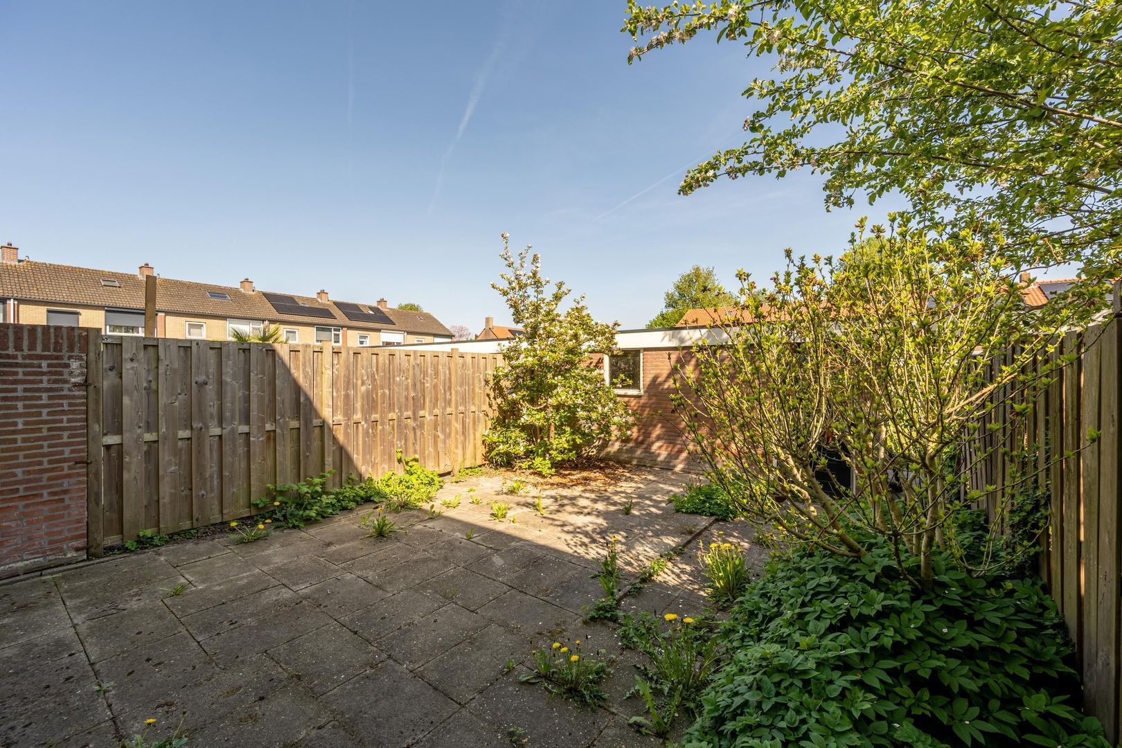 De achtertuin ligt op het noorden. Hierin staat een stenen berging.