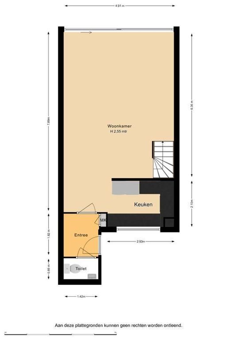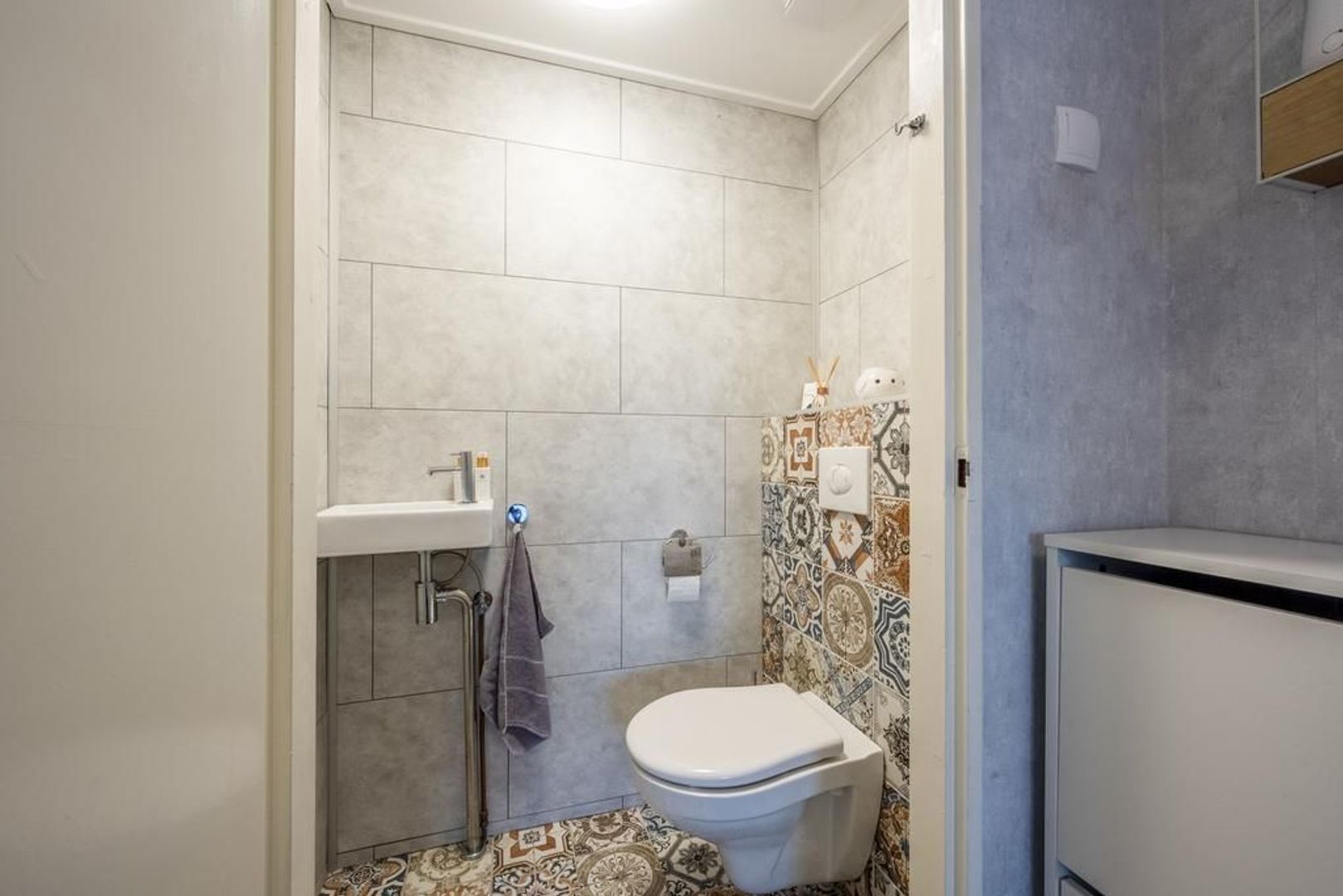 De indeling is als volgt: entree, portaal met meterkast en toegang tot de moderne toiletruimte met wandcloset, wasbakje en vrolijk tegelwerk.