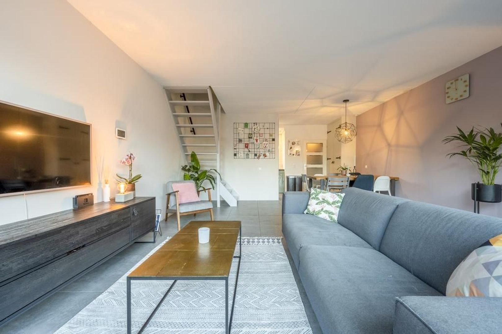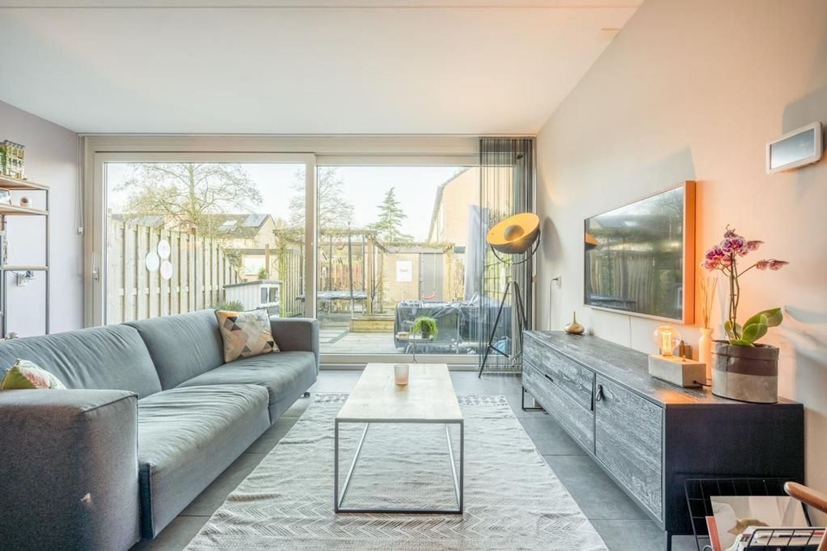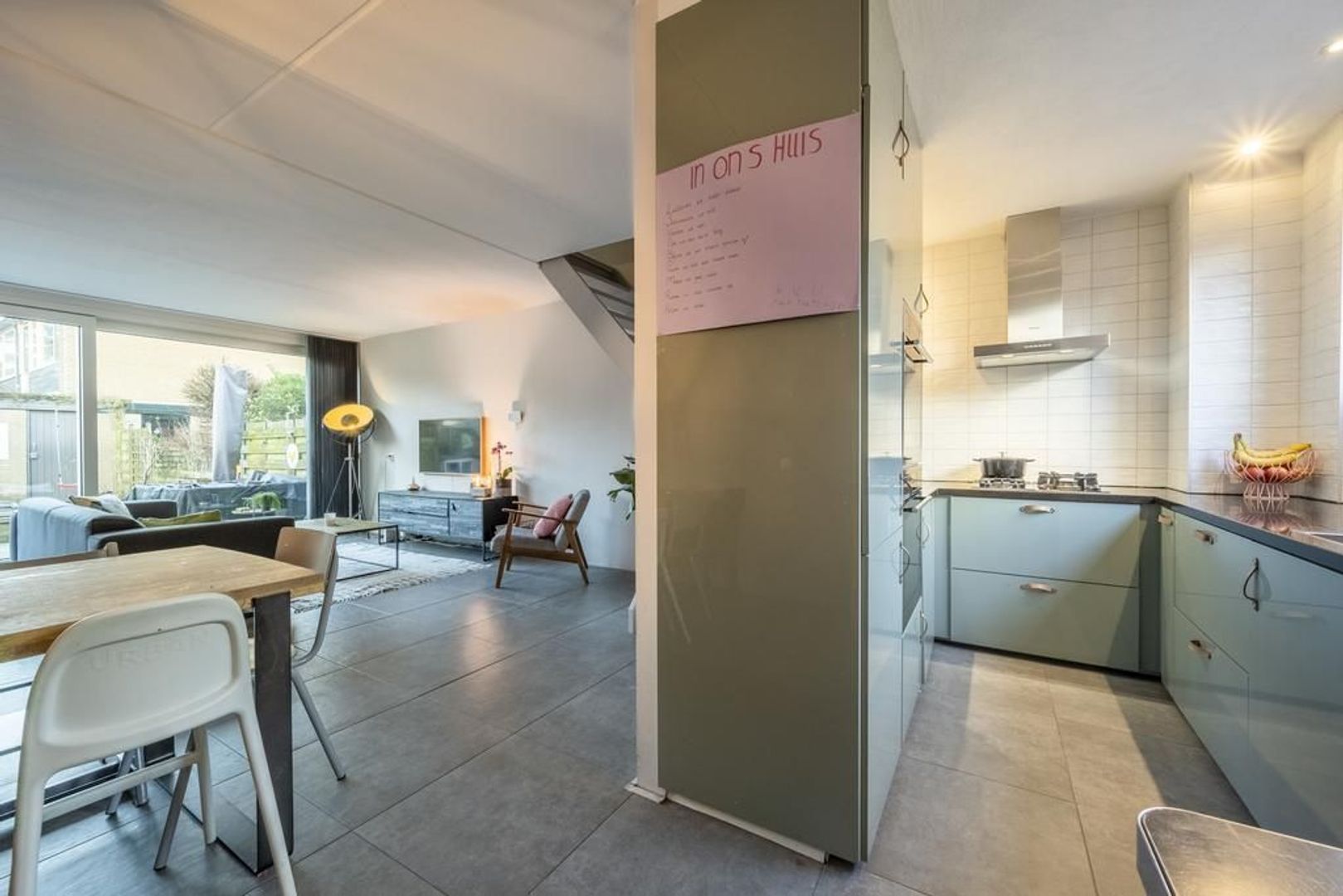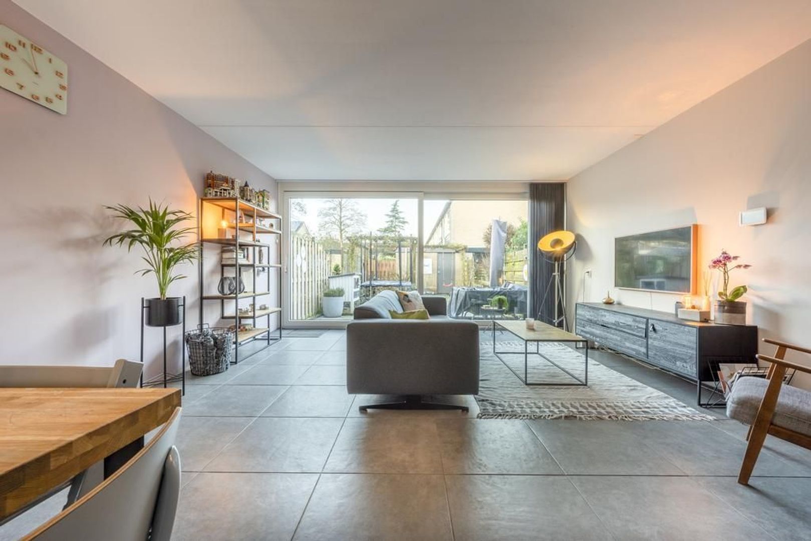 Ruime leefruimte, bestaande uit de halfopen keuken aan de voorkant van de woning en de woonkamer met schuifpui naar de tuin.