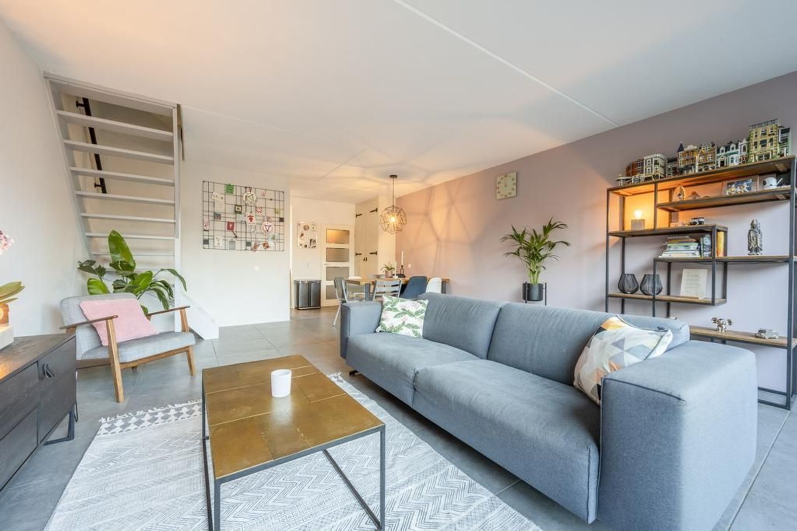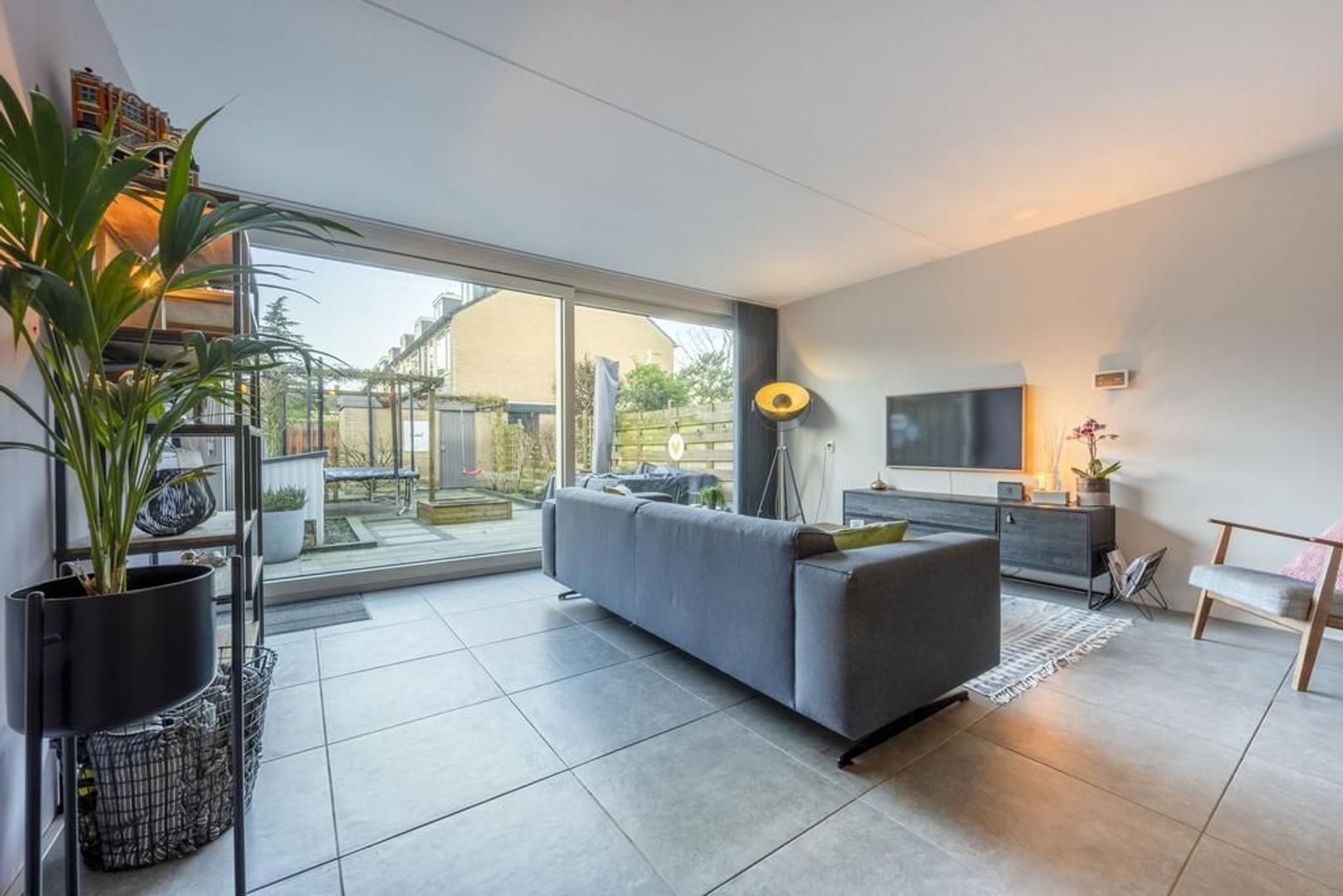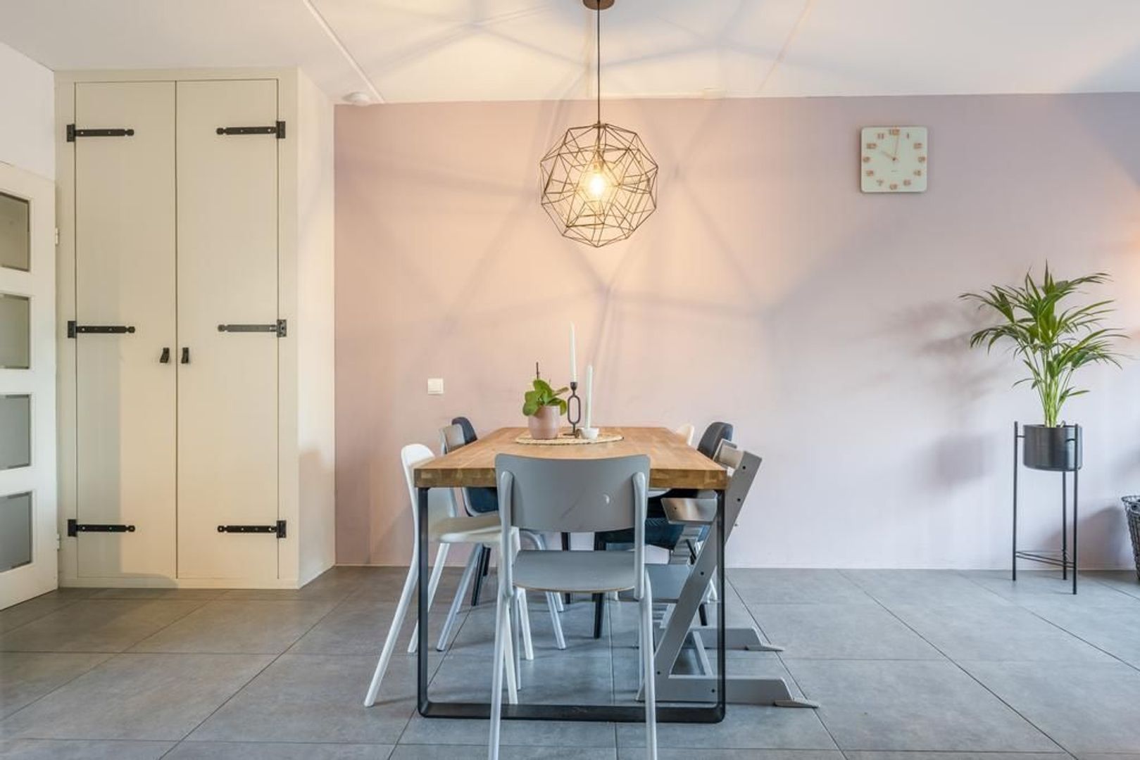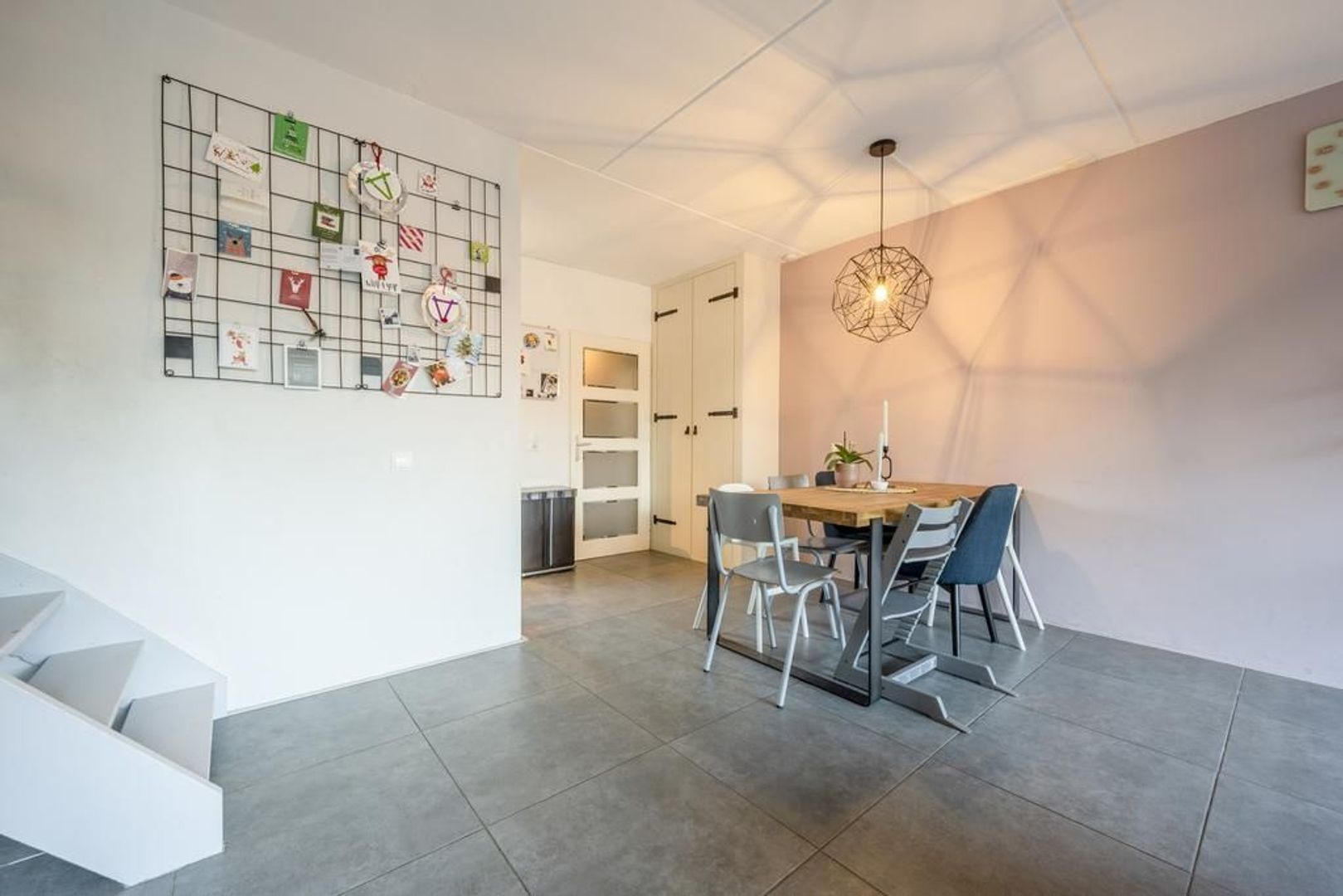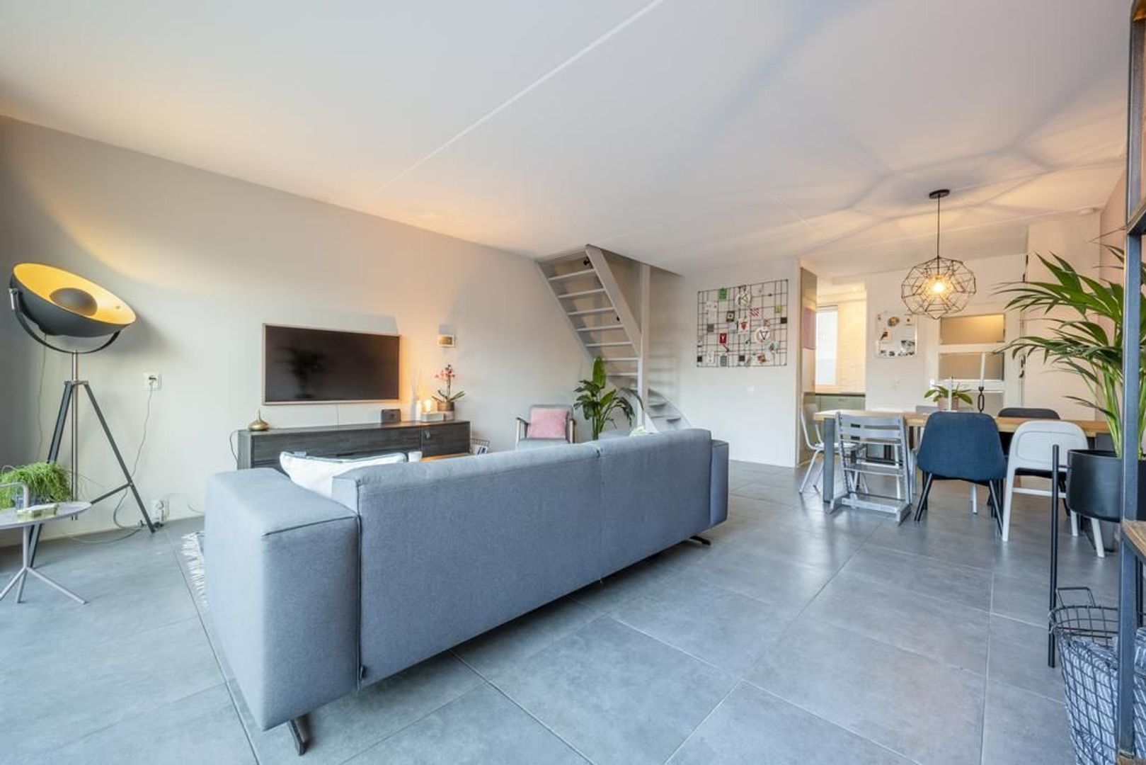 Ruime leefruimte, bestaande uit de halfopen keuken aan de voorkant van de woning en de woonkamer met schuifpui naar de tuin.