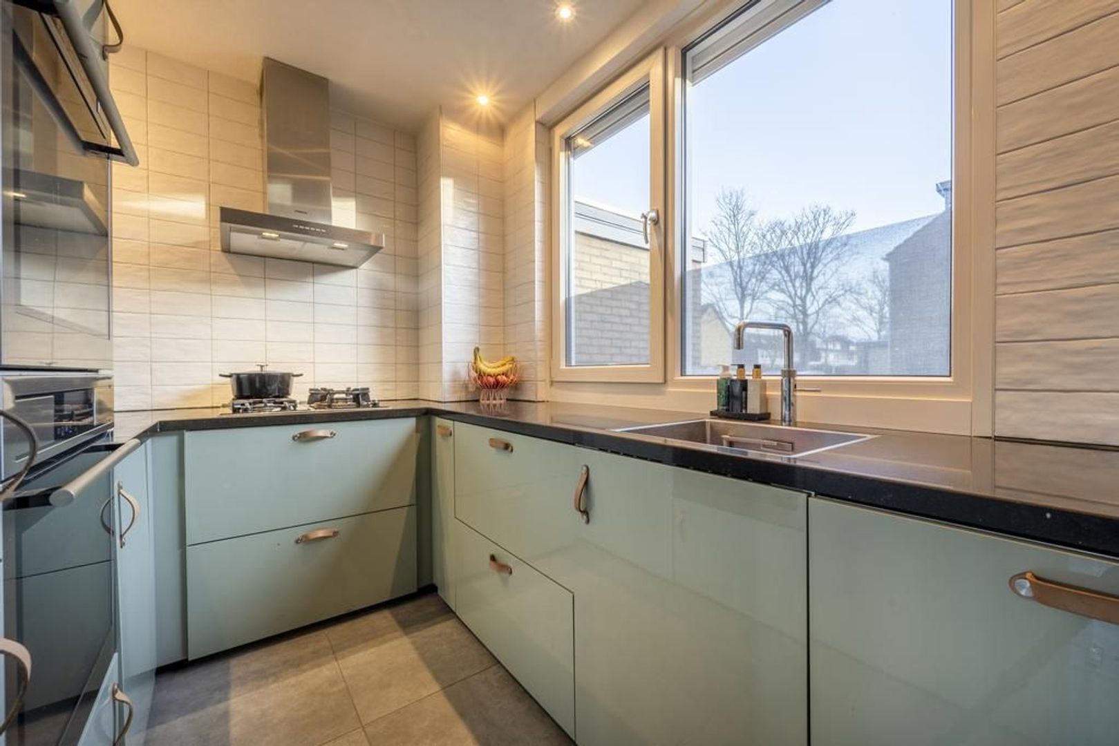 De uitgebreide keuken is uitgevoerd als U-vormige opstelling en voorzien van een natuurstenen aanrechtblad en uitgebreide apparatuur, te weten: een Quooker, gaskookplaat, afzuigkap, oven, stoomoven, koel-vriescombinatie en vaatwasser.