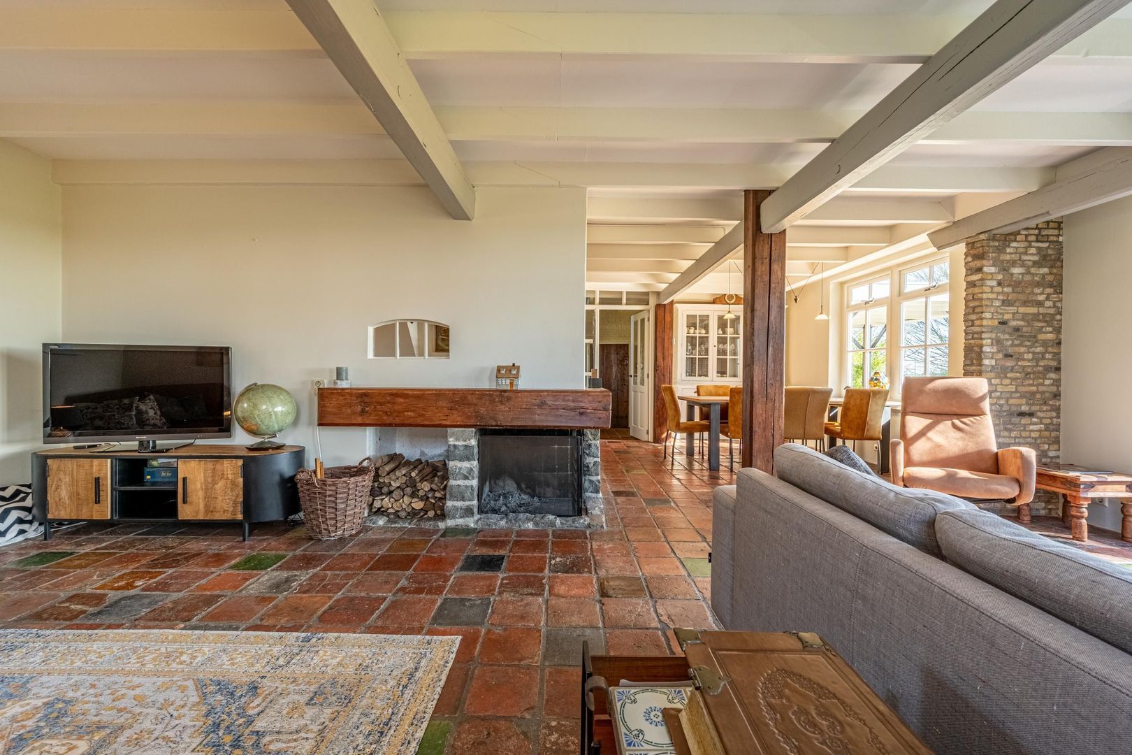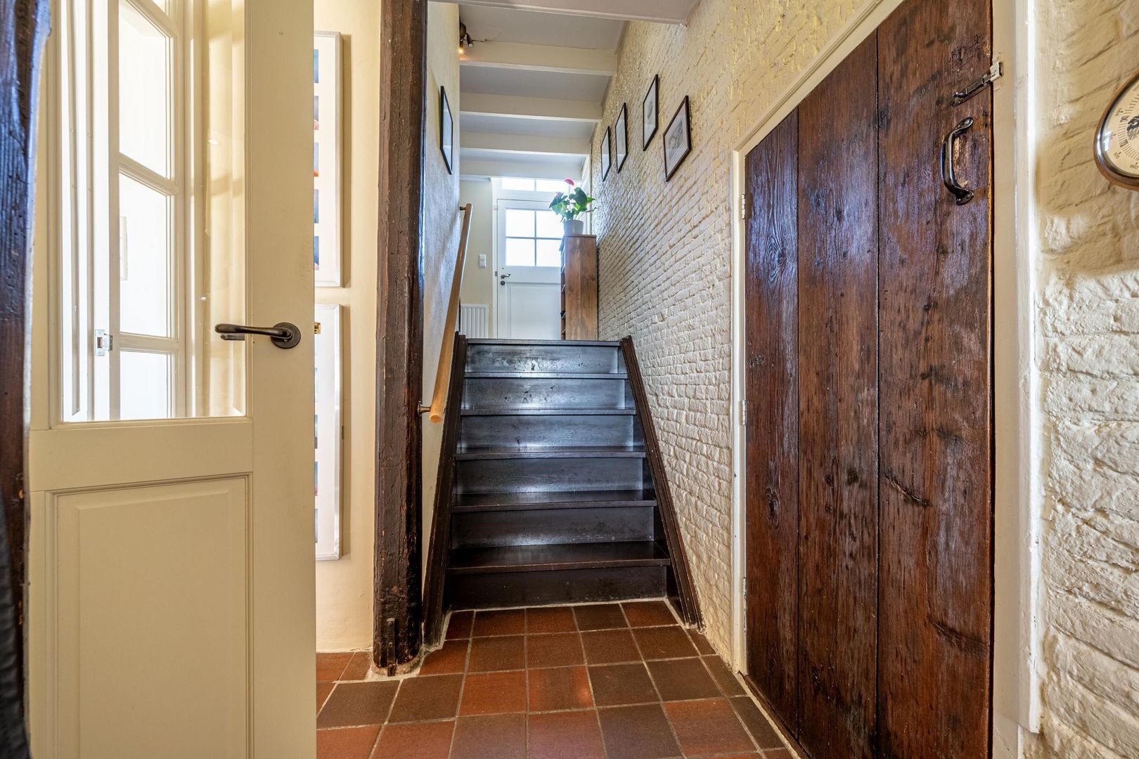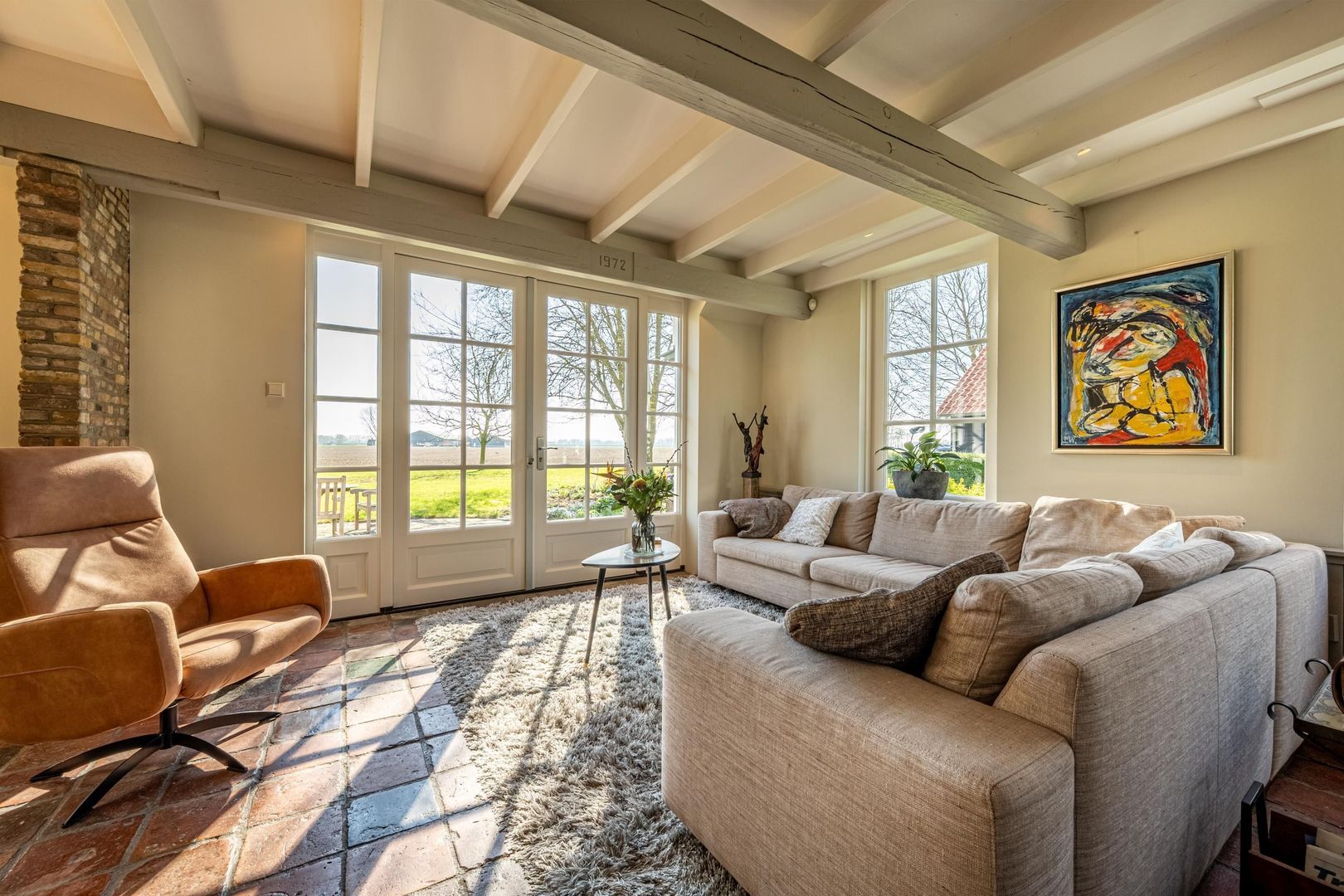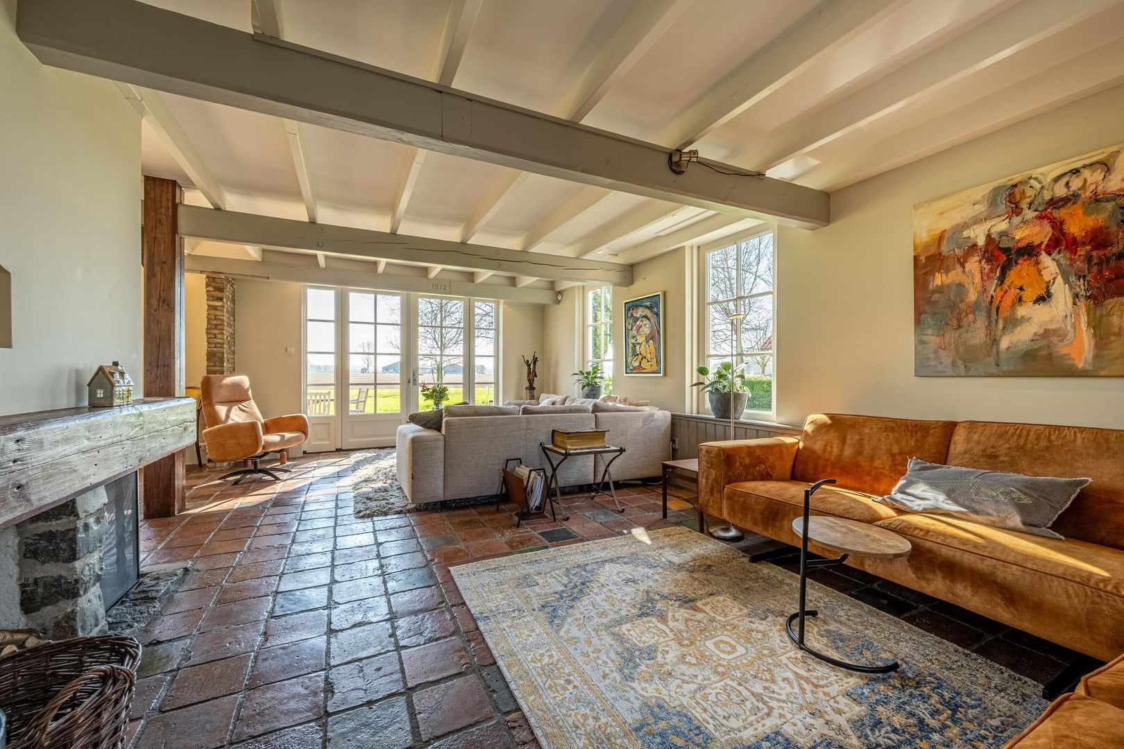 entree op dijkniveau met toegang tot twee mooie werkkamers en een berging. Met een klein trapje naar beneden wordt het woongedeelte bereikt. De hal geeft toegang tot het toilet, de bijkeuken met berging én aan de living. Deze bestaat uit een gezellige woonkamer met open keuken, waarin authentieke details gespaard zijn gebleven. De landelijke sfeer wordt versterkt door het balken plafond, de antieke plavuizen, openslaande deuren en ramen met vlakverdeling en een robuuste open haard. Het terras is een verlenging van het zitgedeelte en biedt een geweldig weids uitzicht en veel privacy.