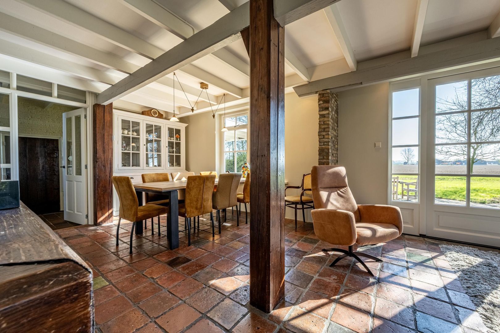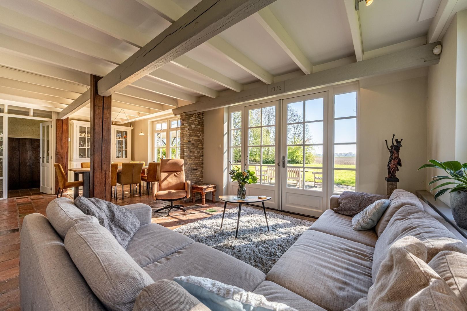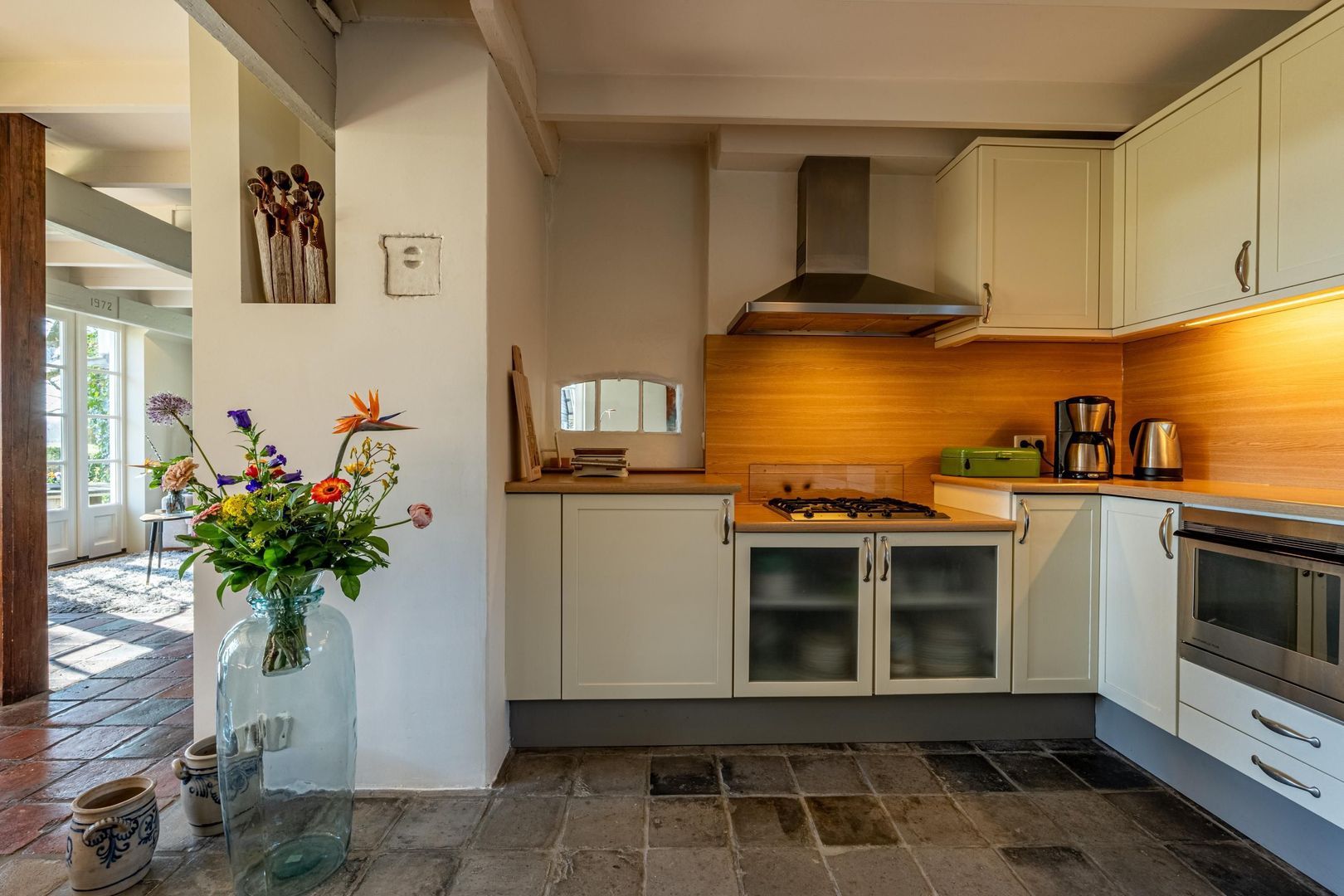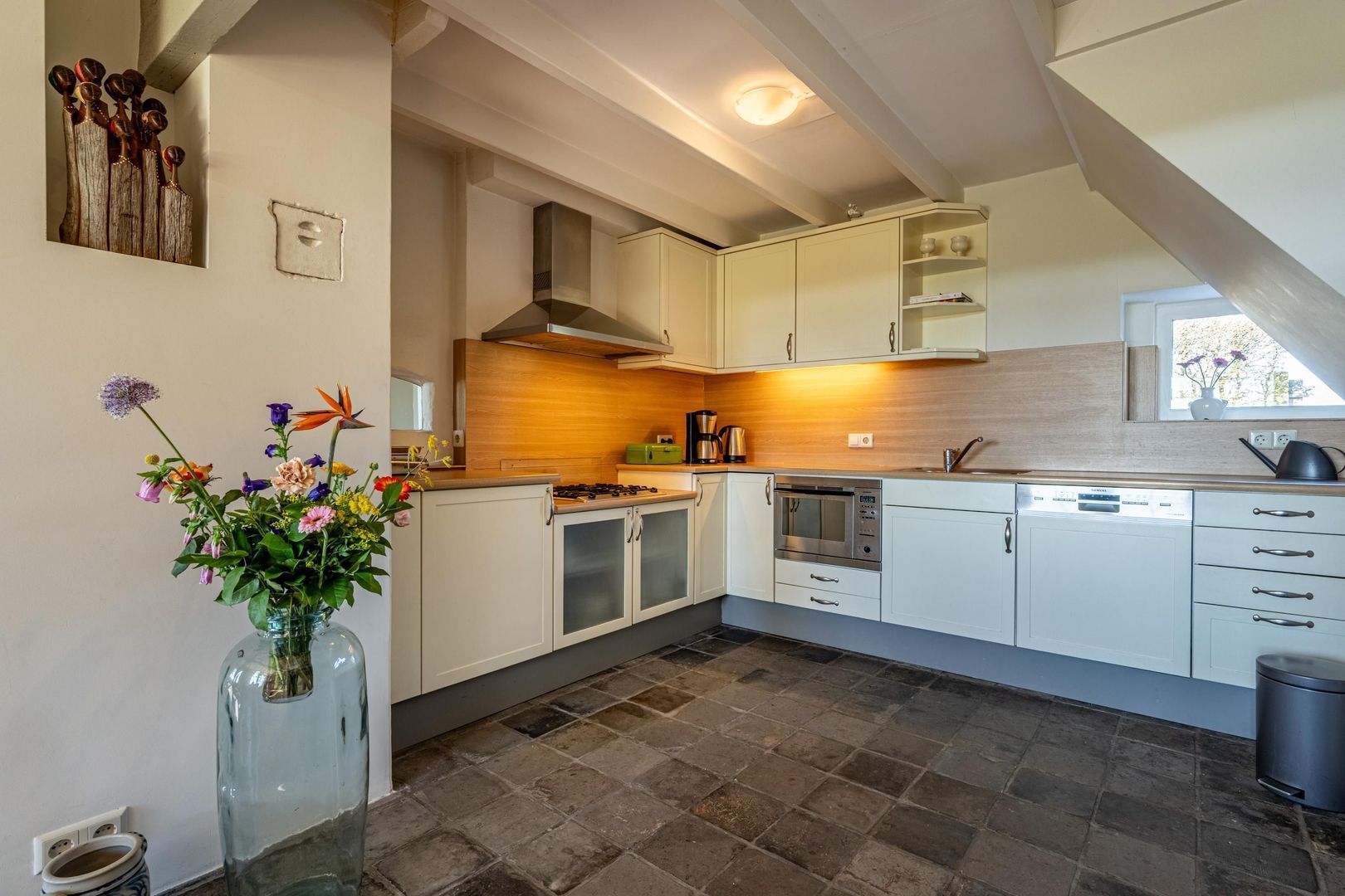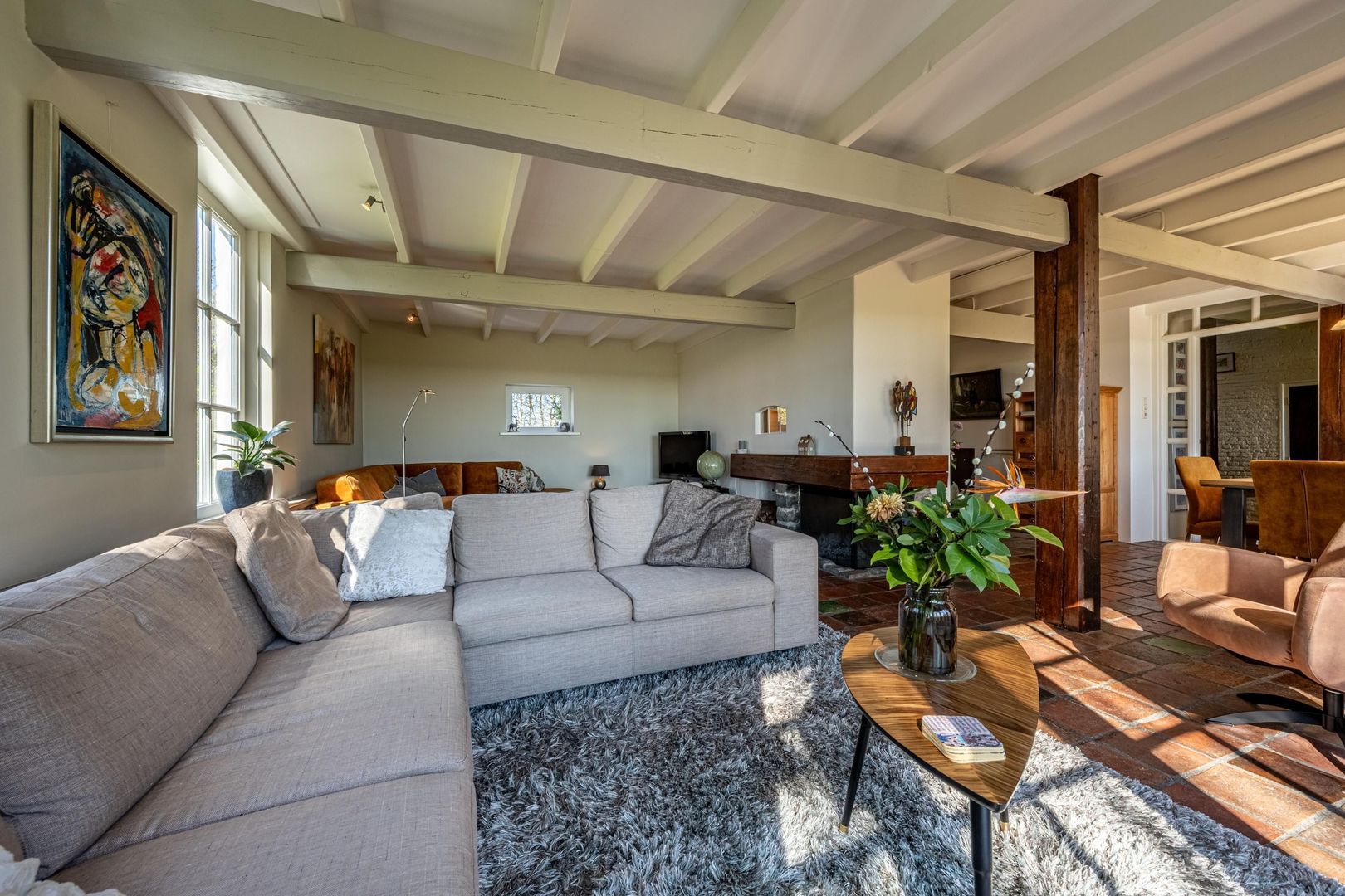 entree op dijkniveau met toegang tot twee mooie werkkamers en een berging. Met een klein trapje naar beneden wordt het woongedeelte bereikt. De hal geeft toegang tot het toilet, de bijkeuken met berging én aan de living. Deze bestaat uit een gezellige woonkamer met open keuken, waarin authentieke details gespaard zijn gebleven. De landelijke sfeer wordt versterkt door het balken plafond, de antieke plavuizen, openslaande deuren en ramen met vlakverdeling en een robuuste open haard. Het terras is een verlenging van het zitgedeelte en biedt een geweldig weids uitzicht en veel privacy.