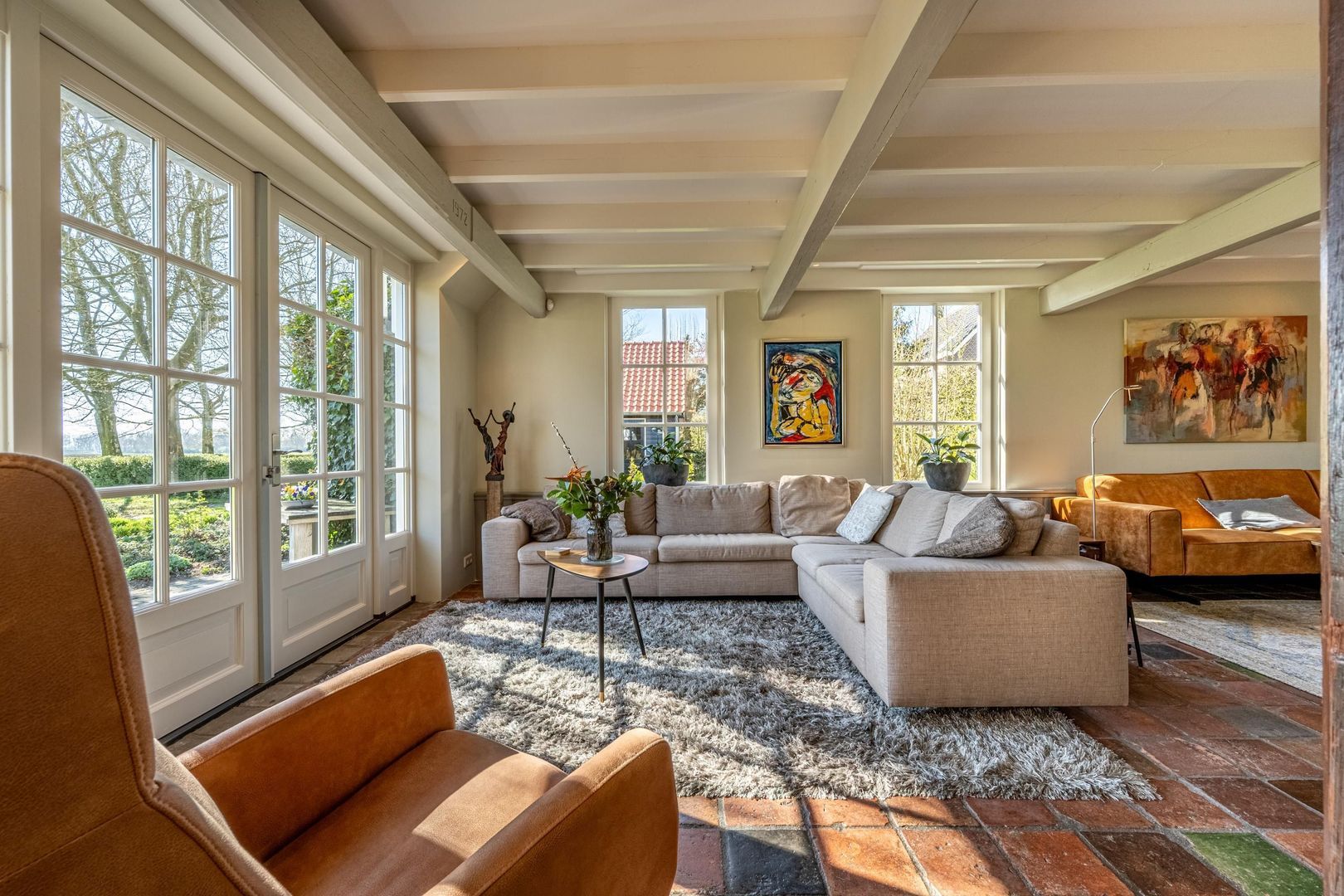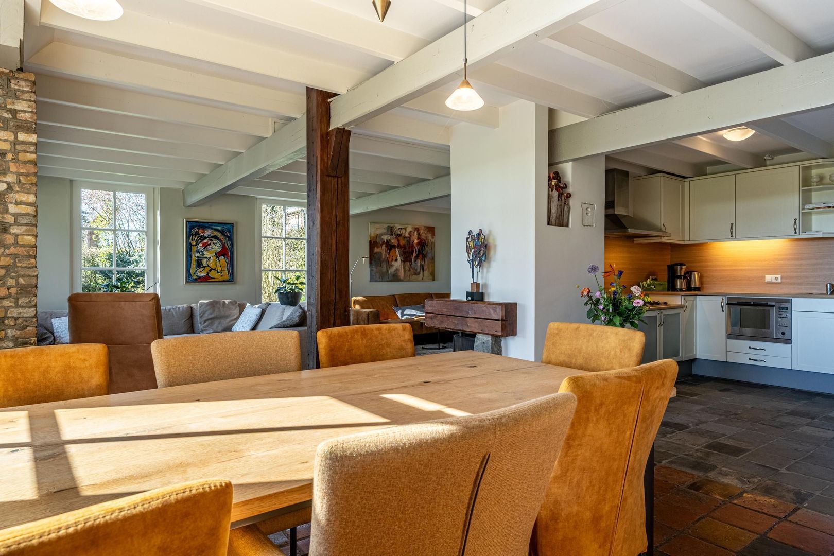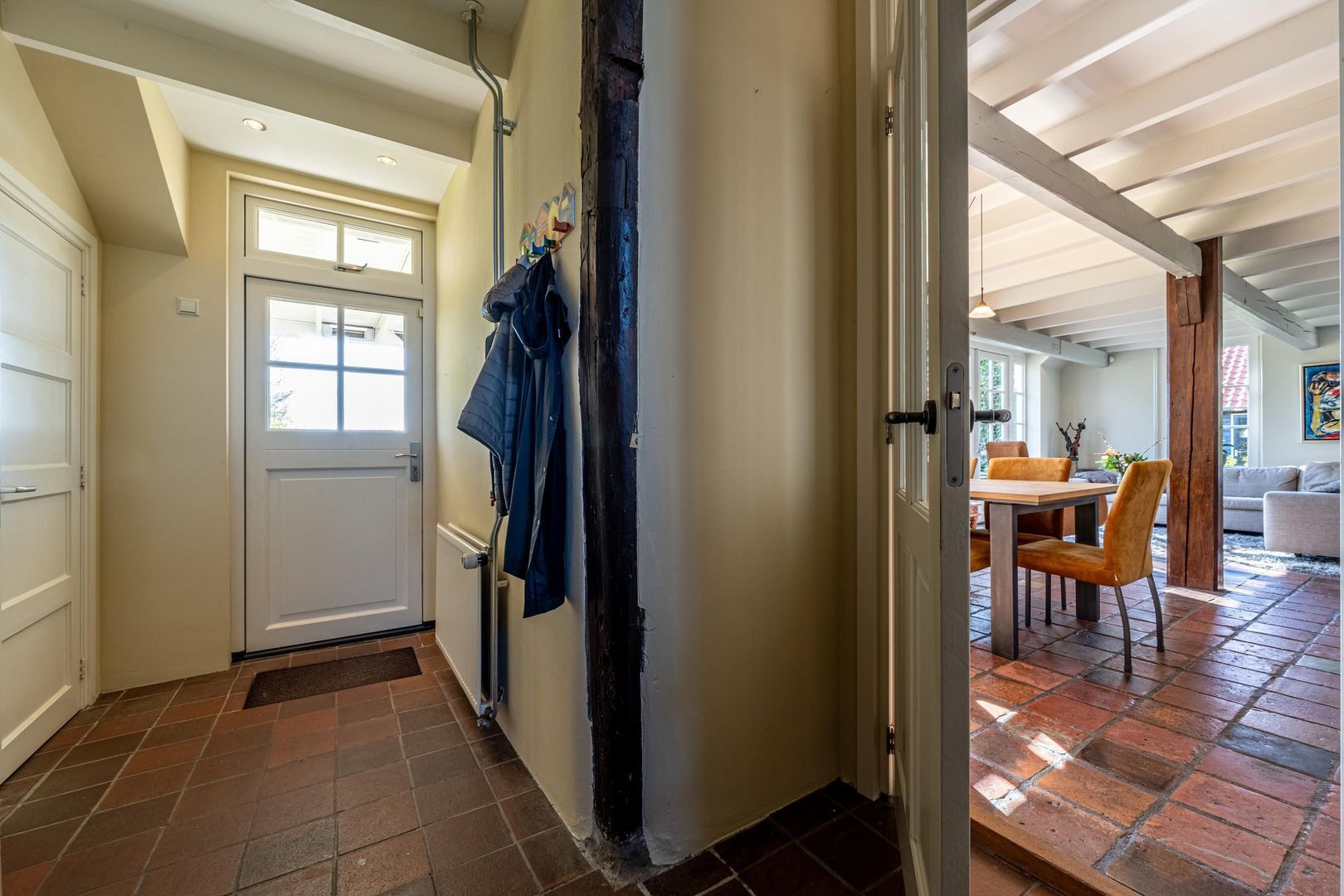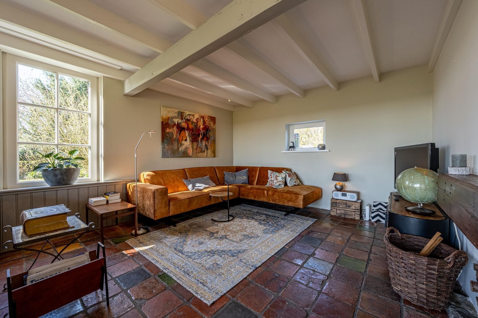 entree op dijkniveau met toegang tot twee mooie werkkamers en een berging. Met een klein trapje naar beneden wordt het woongedeelte bereikt. De hal geeft toegang tot het toilet, de bijkeuken met berging én aan de living. Deze bestaat uit een gezellige woonkamer met open keuken, waarin authentieke details gespaard zijn gebleven. De landelijke sfeer wordt versterkt door het balken plafond, de antieke plavuizen, openslaande deuren en ramen met vlakverdeling en een robuuste open haard. Het terras is een verlenging van het zitgedeelte en biedt een geweldig weids uitzicht en veel privacy.