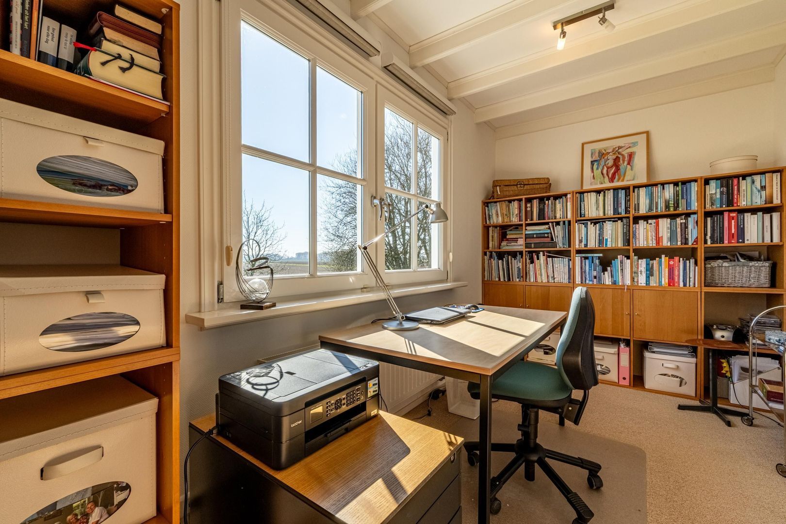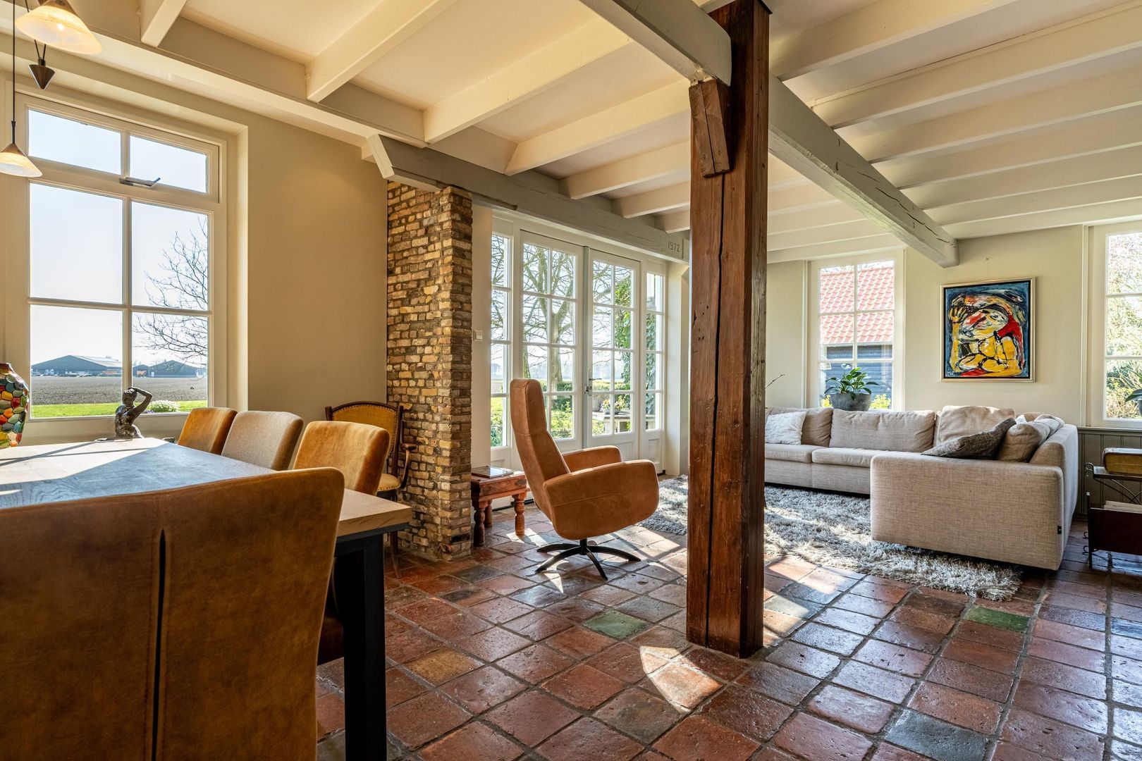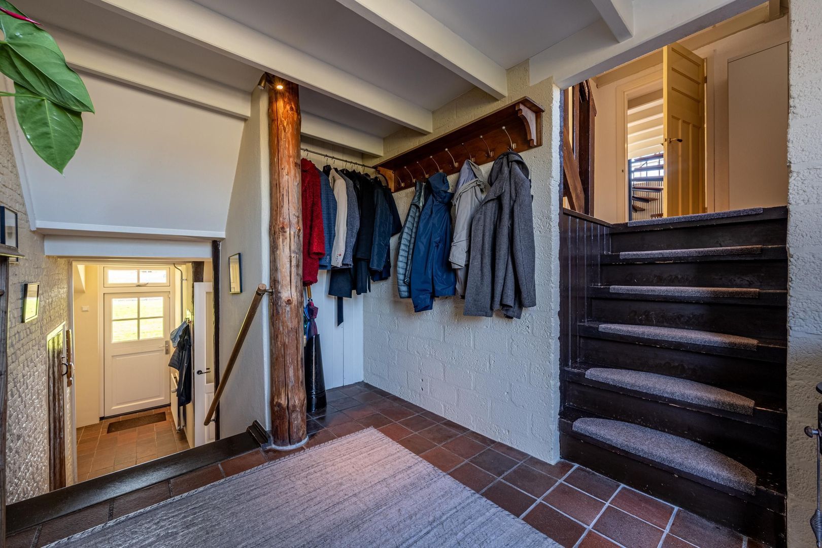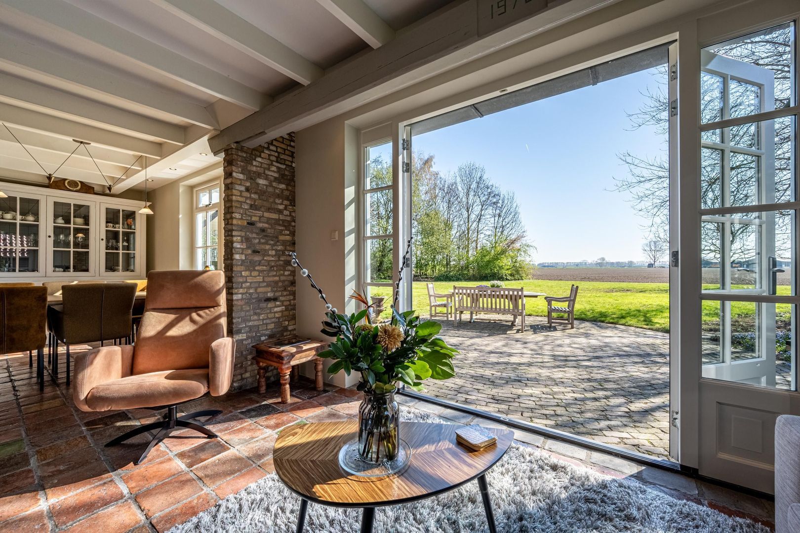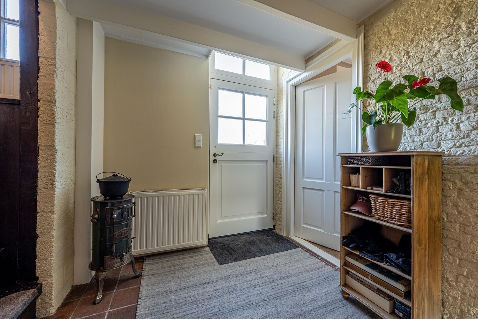 entree op dijkniveau met toegang tot twee mooie werkkamers en een berging. Met een klein trapje naar beneden wordt het woongedeelte bereikt. De hal geeft toegang tot het toilet, de bijkeuken met berging én aan de living. Deze bestaat uit een gezellige woonkamer met open keuken, waarin authentieke details gespaard zijn gebleven. De landelijke sfeer wordt versterkt door het balken plafond, de antieke plavuizen, openslaande deuren en ramen met vlakverdeling en een robuuste open haard. Het terras is een verlenging van het zitgedeelte en biedt een geweldig weids uitzicht en veel privacy.