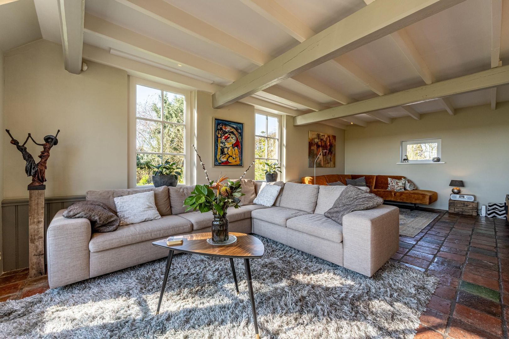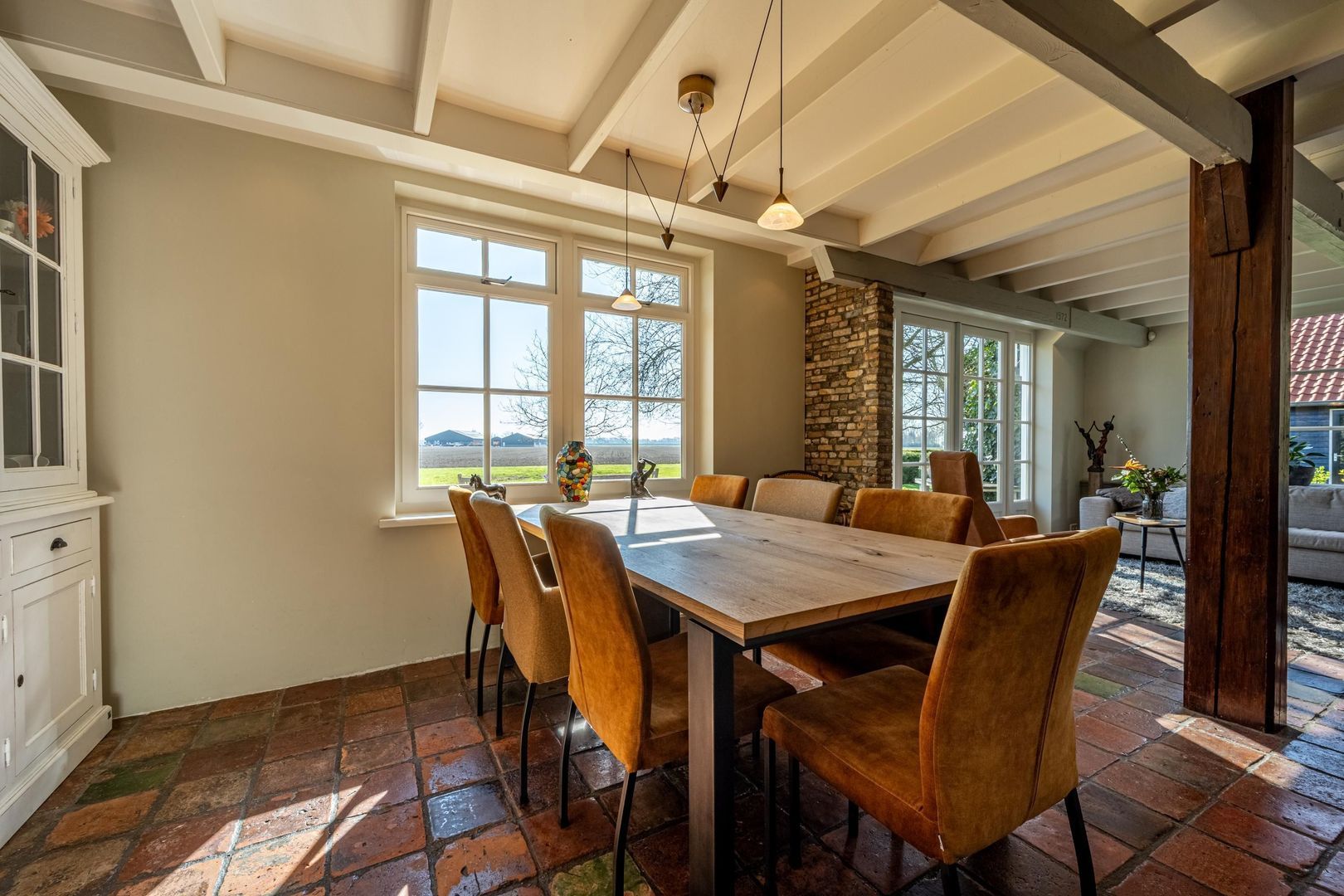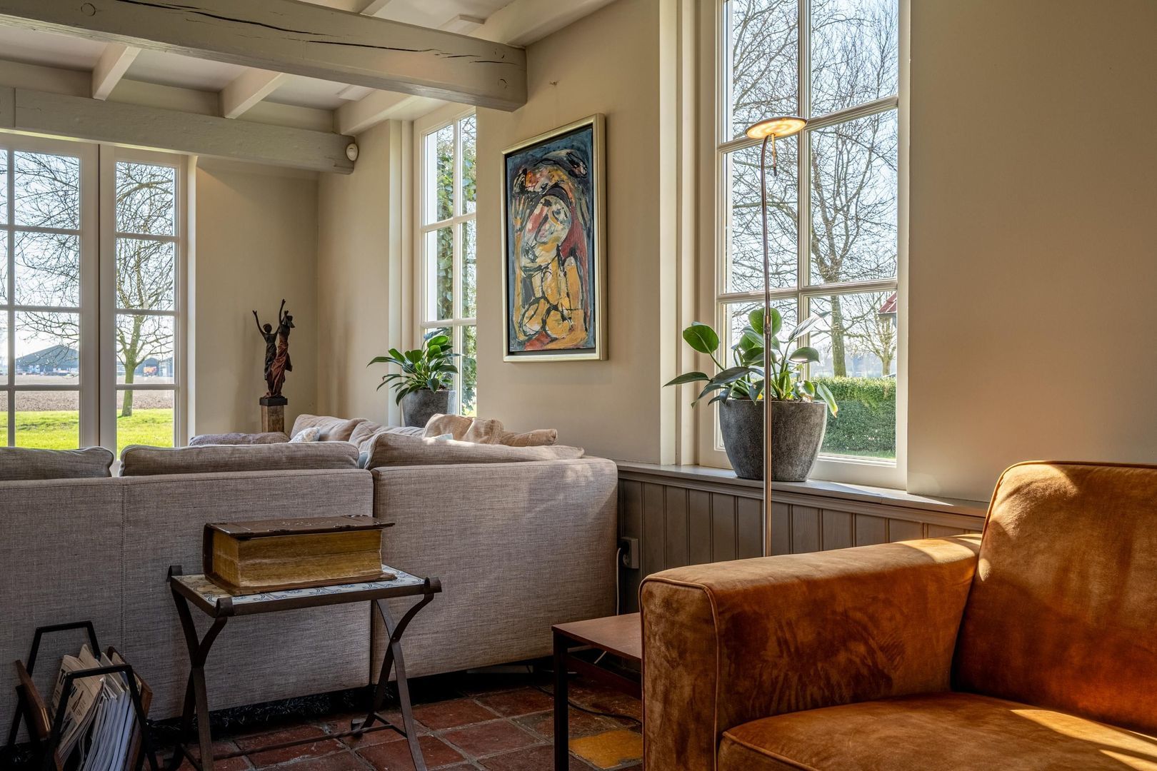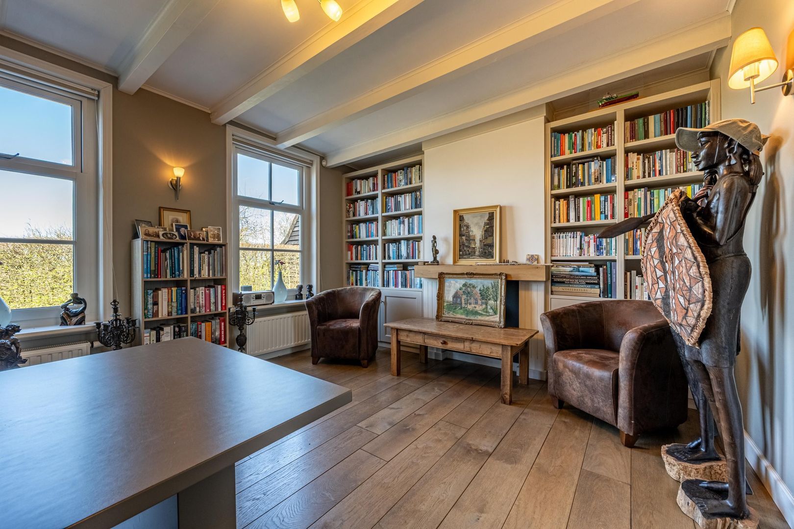 entree op dijkniveau met toegang tot twee mooie werkkamers en een berging. Met een klein trapje naar beneden wordt het woongedeelte bereikt. De hal geeft toegang tot het toilet, de bijkeuken met berging én aan de living. Deze bestaat uit een gezellige woonkamer met open keuken, waarin authentieke details gespaard zijn gebleven. De landelijke sfeer wordt versterkt door het balken plafond, de antieke plavuizen, openslaande deuren en ramen met vlakverdeling en een robuuste open haard. Het terras is een verlenging van het zitgedeelte en biedt een geweldig weids uitzicht en veel privacy.