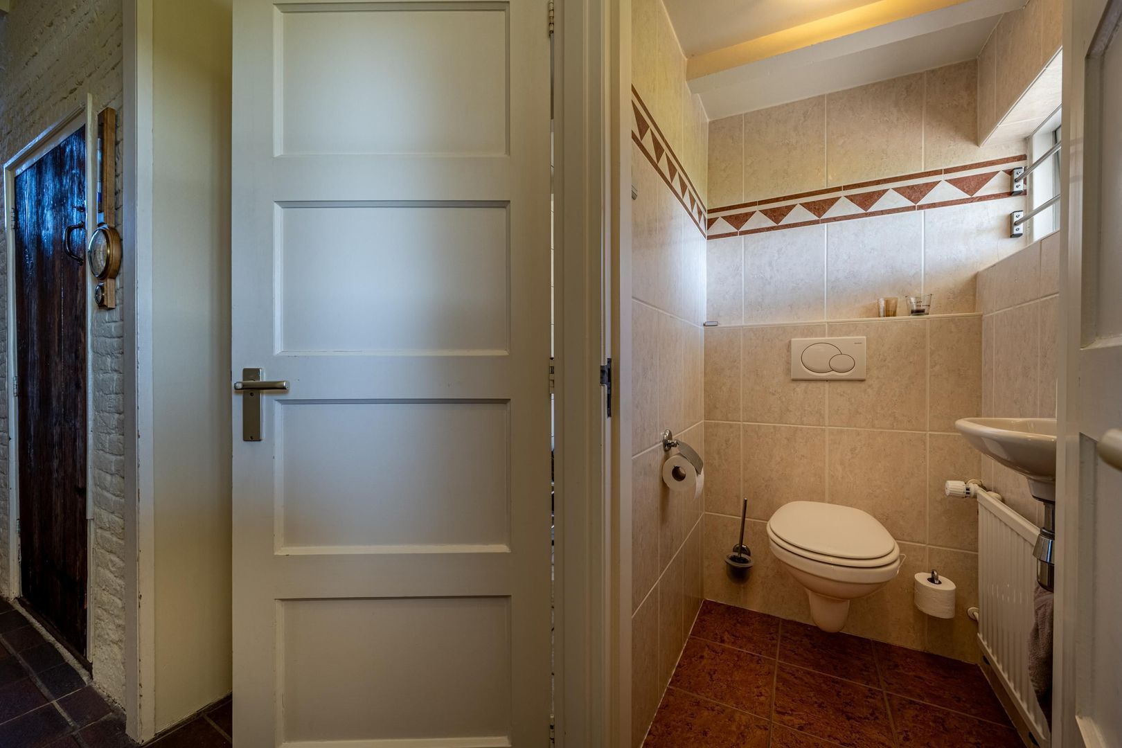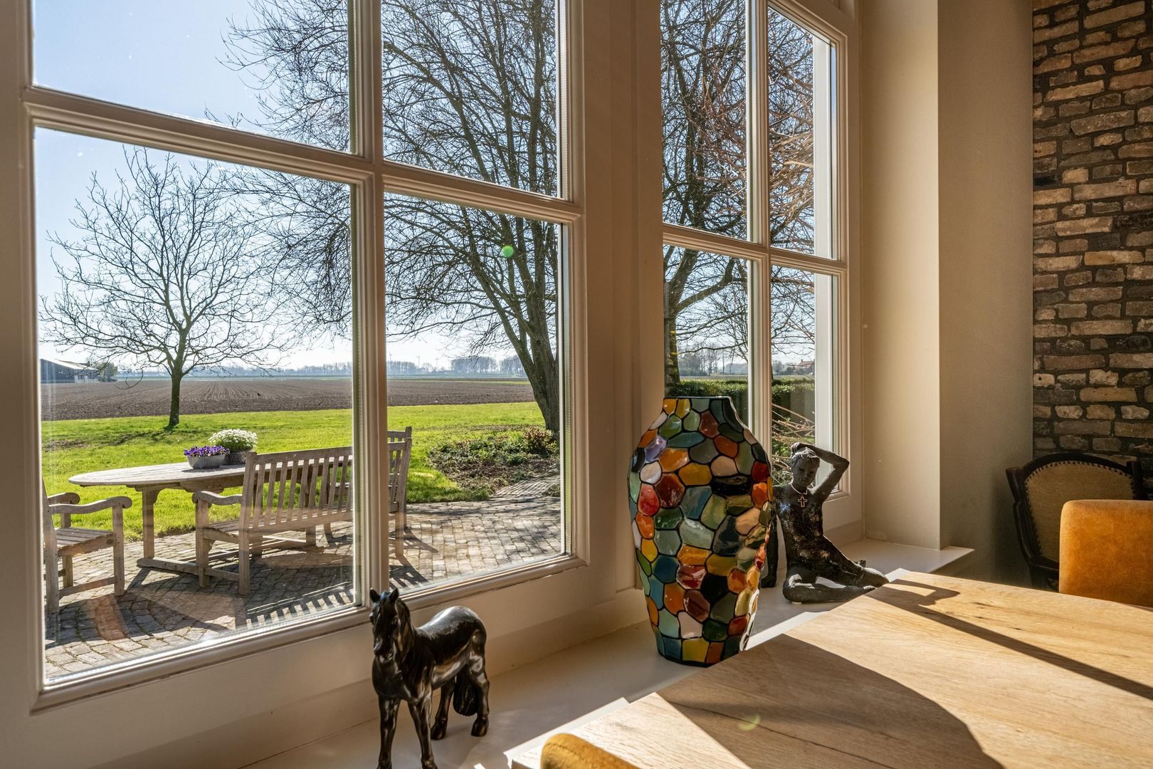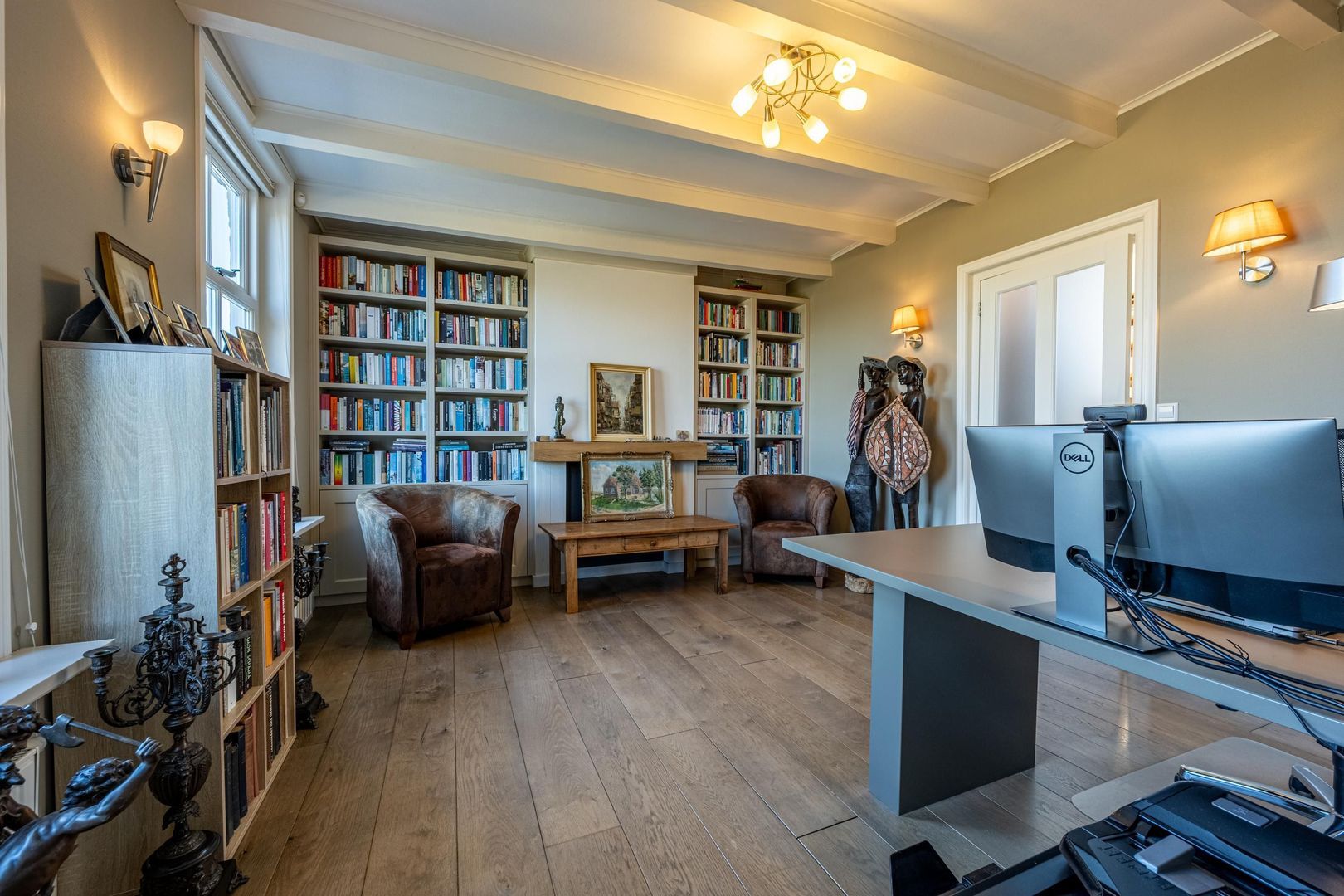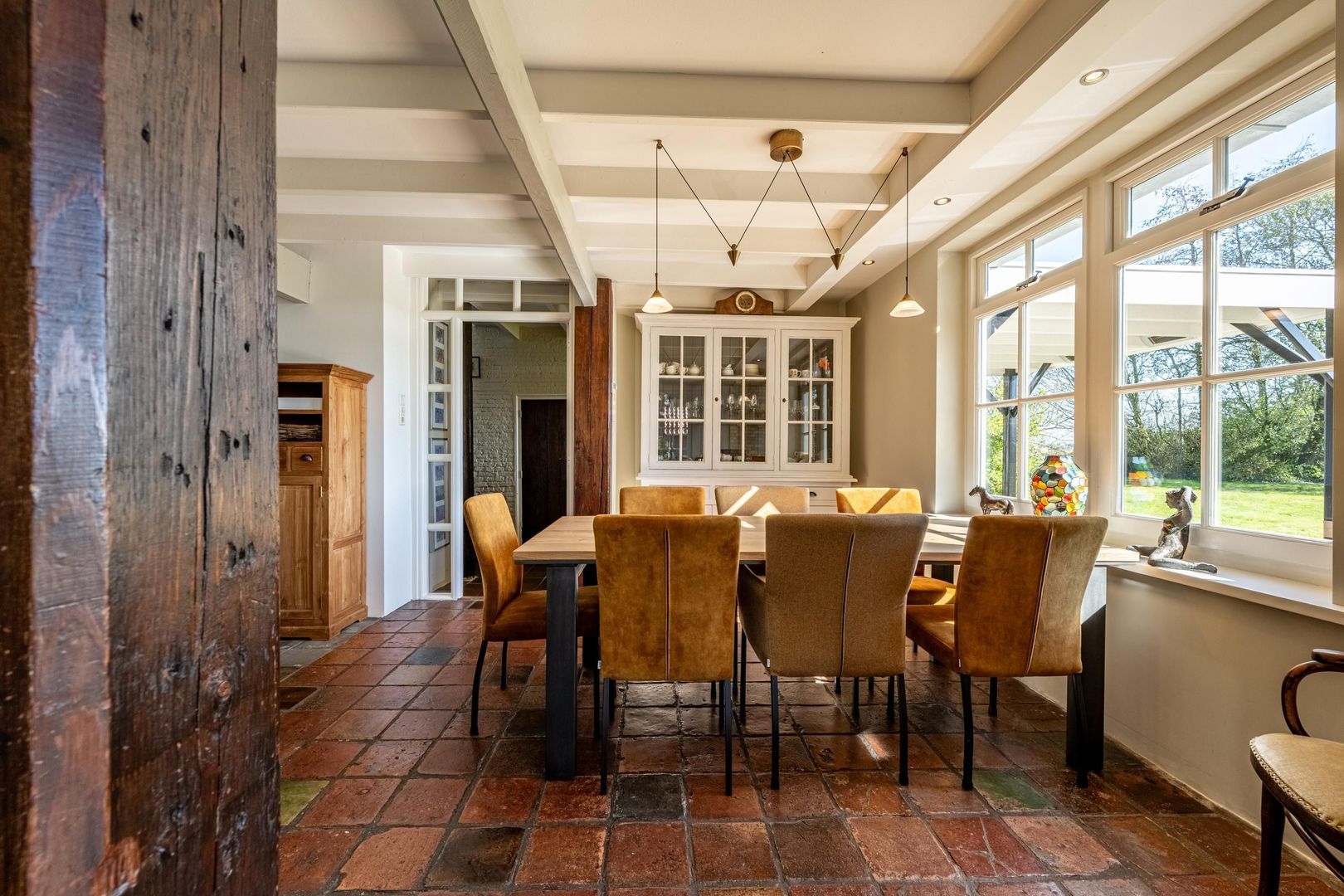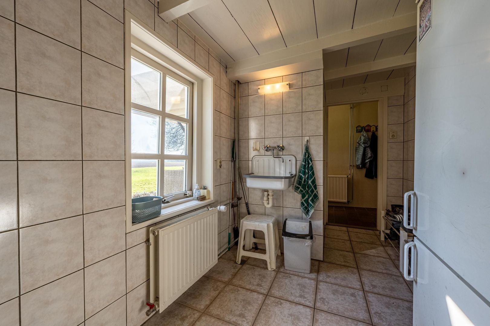entree op dijkniveau met toegang tot twee mooie werkkamers en een berging. Met een klein trapje naar beneden wordt het woongedeelte bereikt. De hal geeft toegang tot het toilet, de bijkeuken met berging én aan de living. Deze bestaat uit een gezellige woonkamer met open keuken, waarin authentieke details gespaard zijn gebleven. De landelijke sfeer wordt versterkt door het balken plafond, de antieke plavuizen, openslaande deuren en ramen met vlakverdeling en een robuuste open haard. Het terras is een verlenging van het zitgedeelte en biedt een geweldig weids uitzicht en veel privacy.