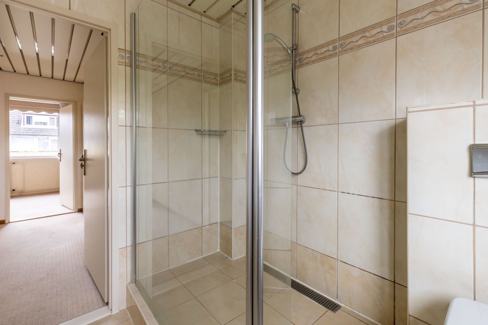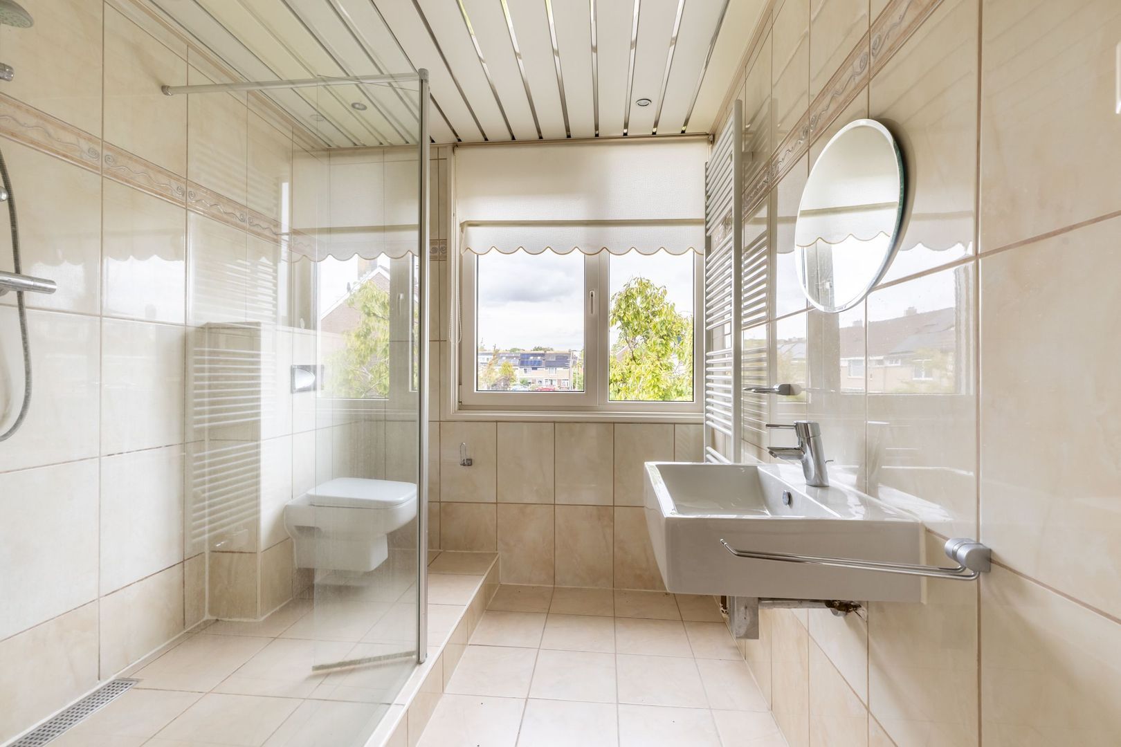 De badkamer is ingericht met een inloopdouche, een wandtoilet en een vaste wastafel. Het raam maakt ventileren met frisse buitenlucht mogelijk.