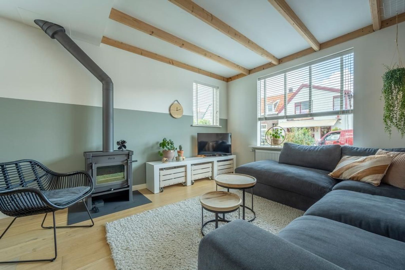 Gezellige woonkamer met aansluiting voor de houtkachel en trapkast.