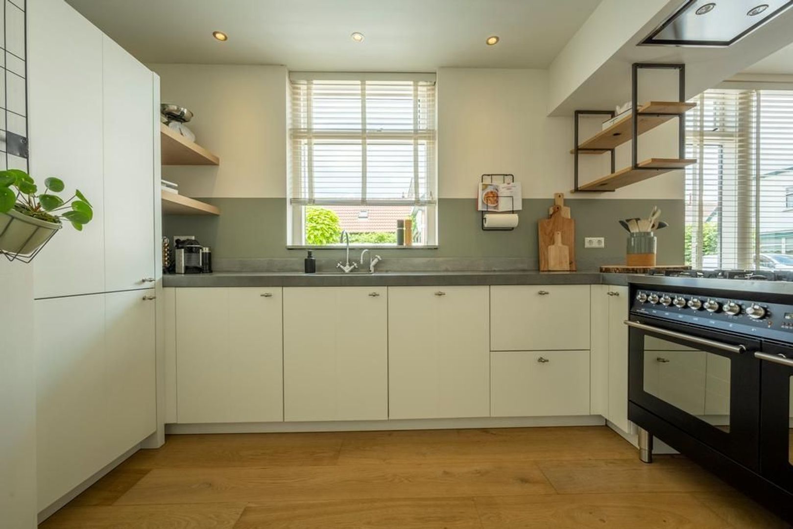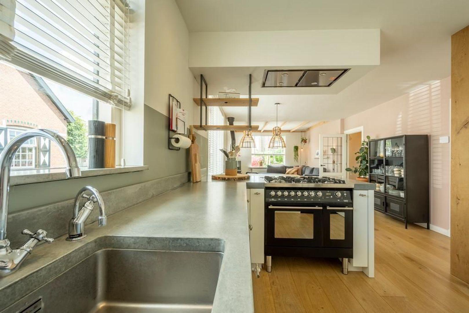 Open keuken met moderne inrichting, zoals een betonnen aanrechtblad, zespits gasfornuis, dubbele oven, afzuigkap, vaatwasser, koel-vriescombinatie en Quooker.