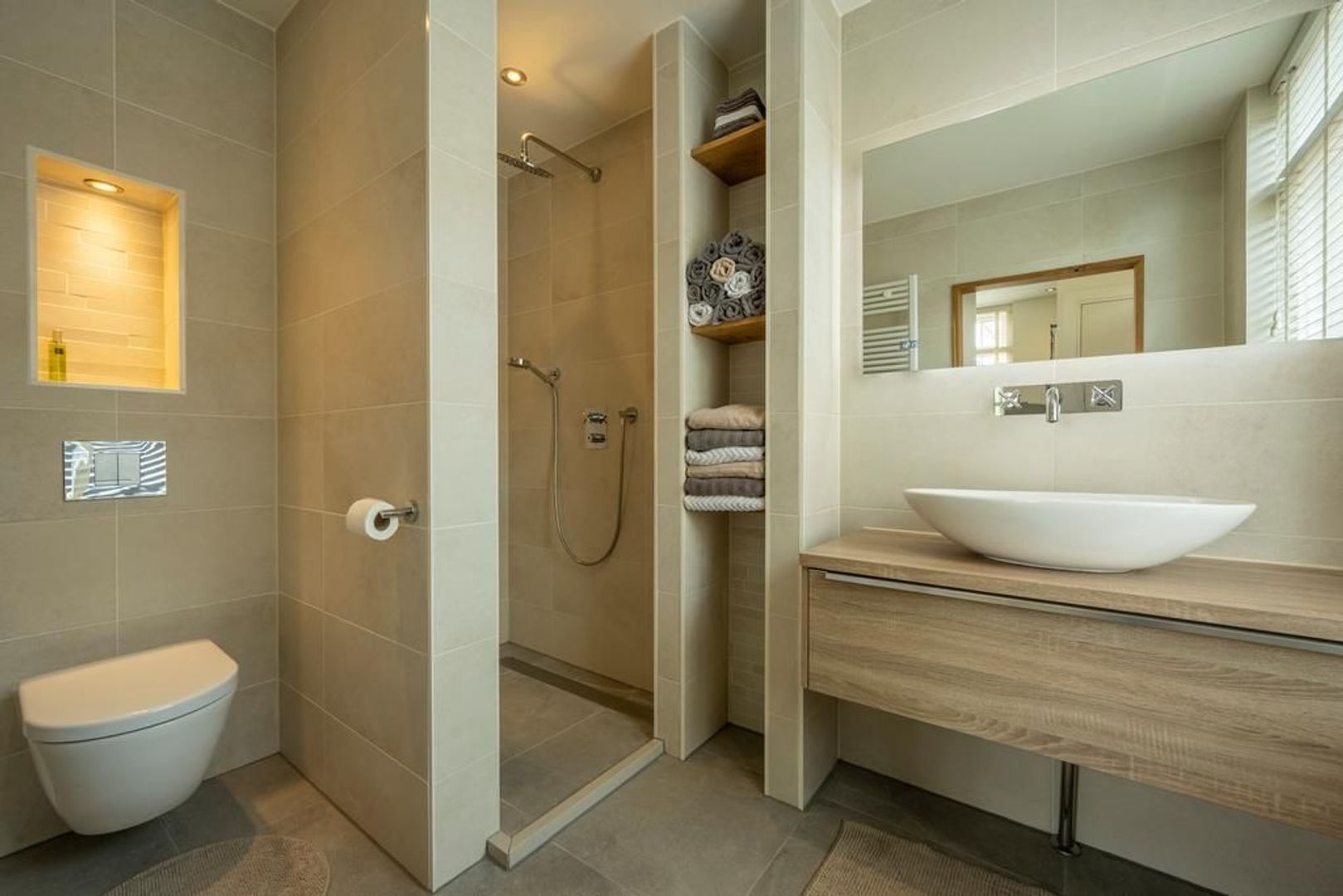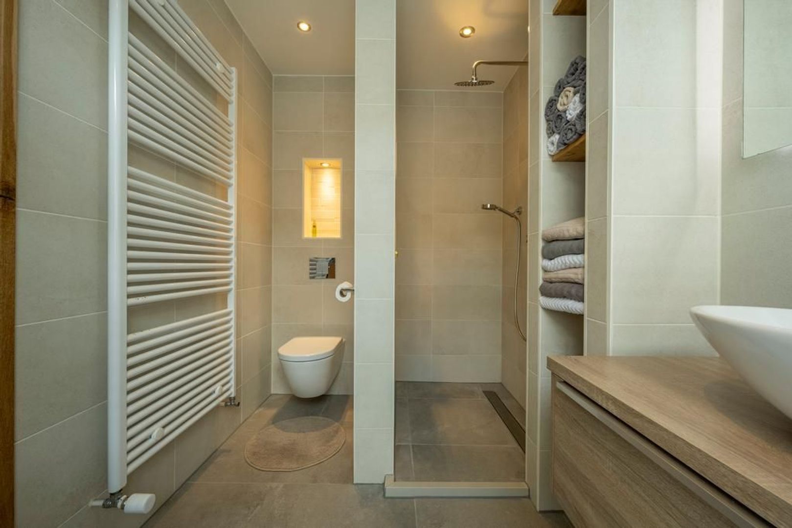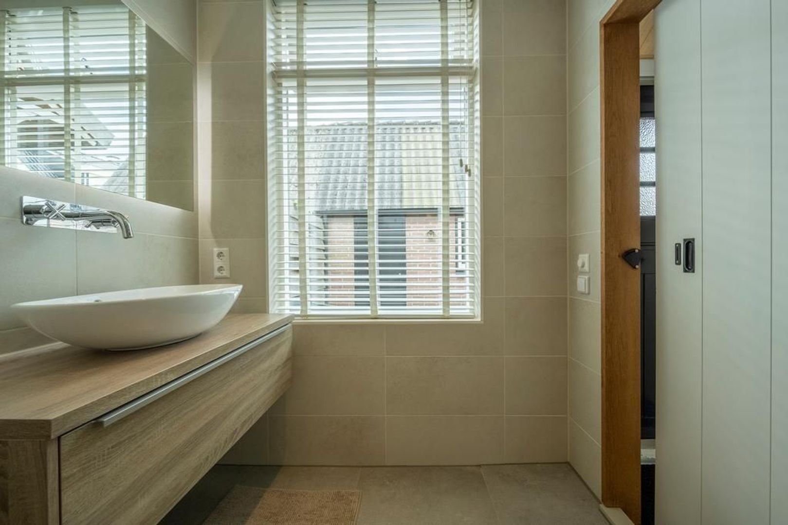 Deze is volledig betegeld en ingericht met een inloopdouche met regendouche, een badmeubel met een waskom en een wandcloset.