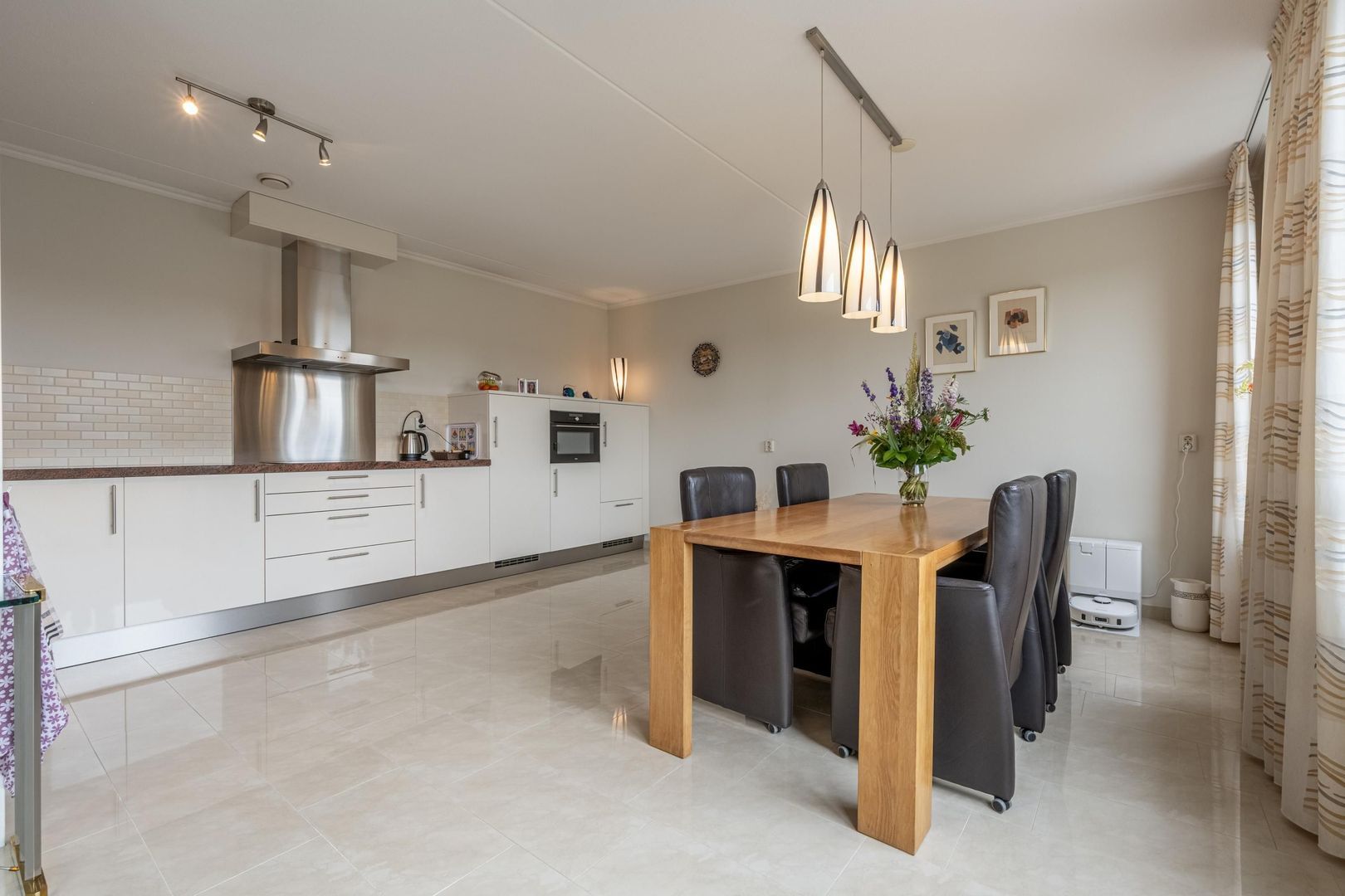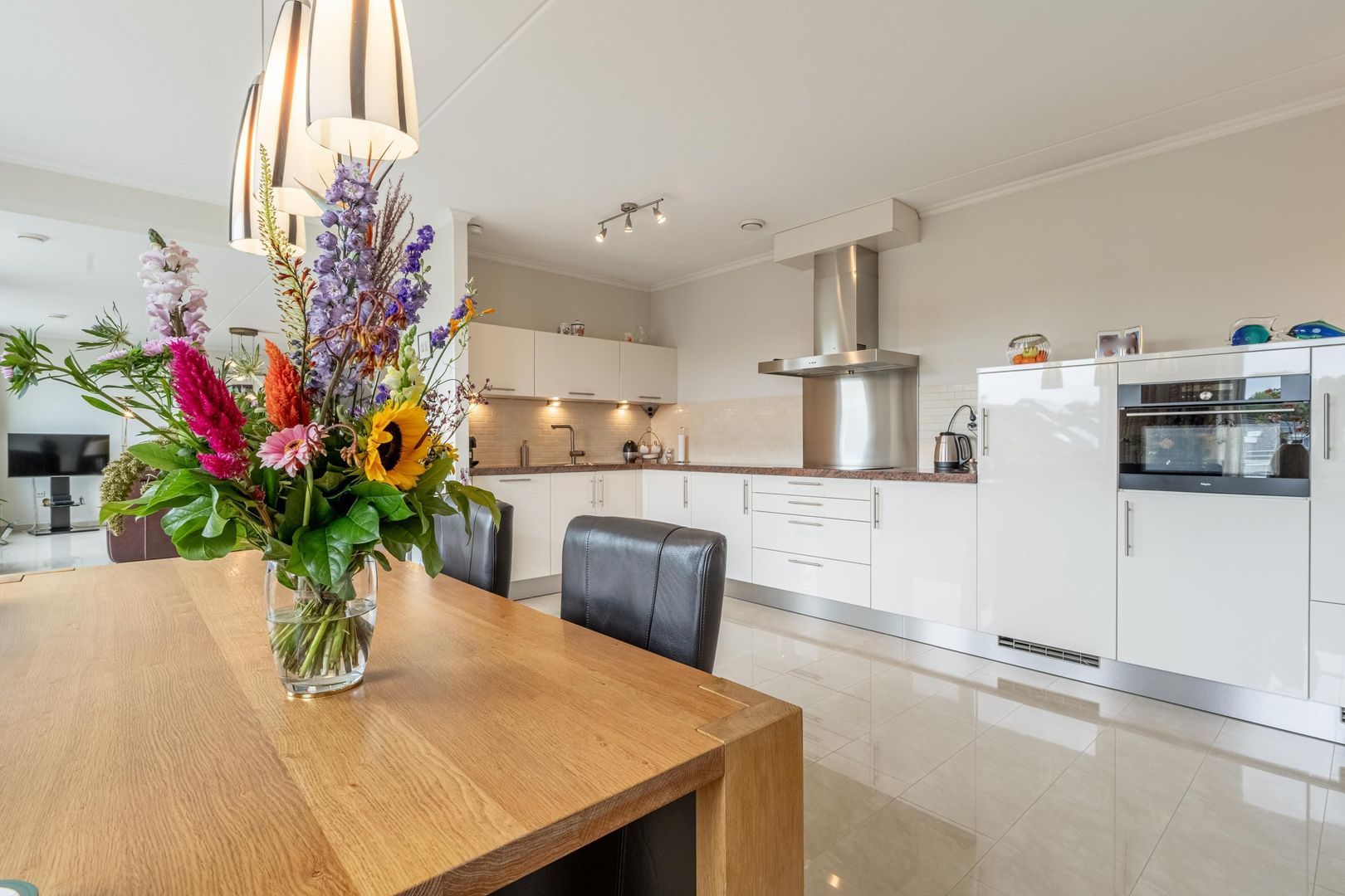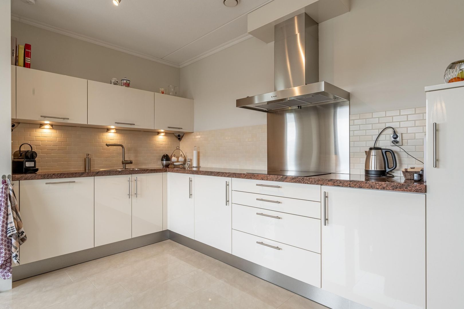 Het leefgedeelte bestaat uit een zonnige woonkamer met een half open woonkeuken. Deze heeft een L-vormige inrichting en is voorzien van een natuurstenen aanrechtblad en inbouwapparatuur.