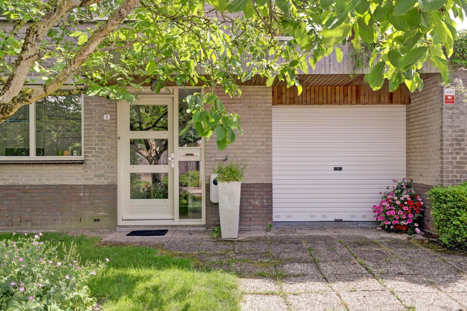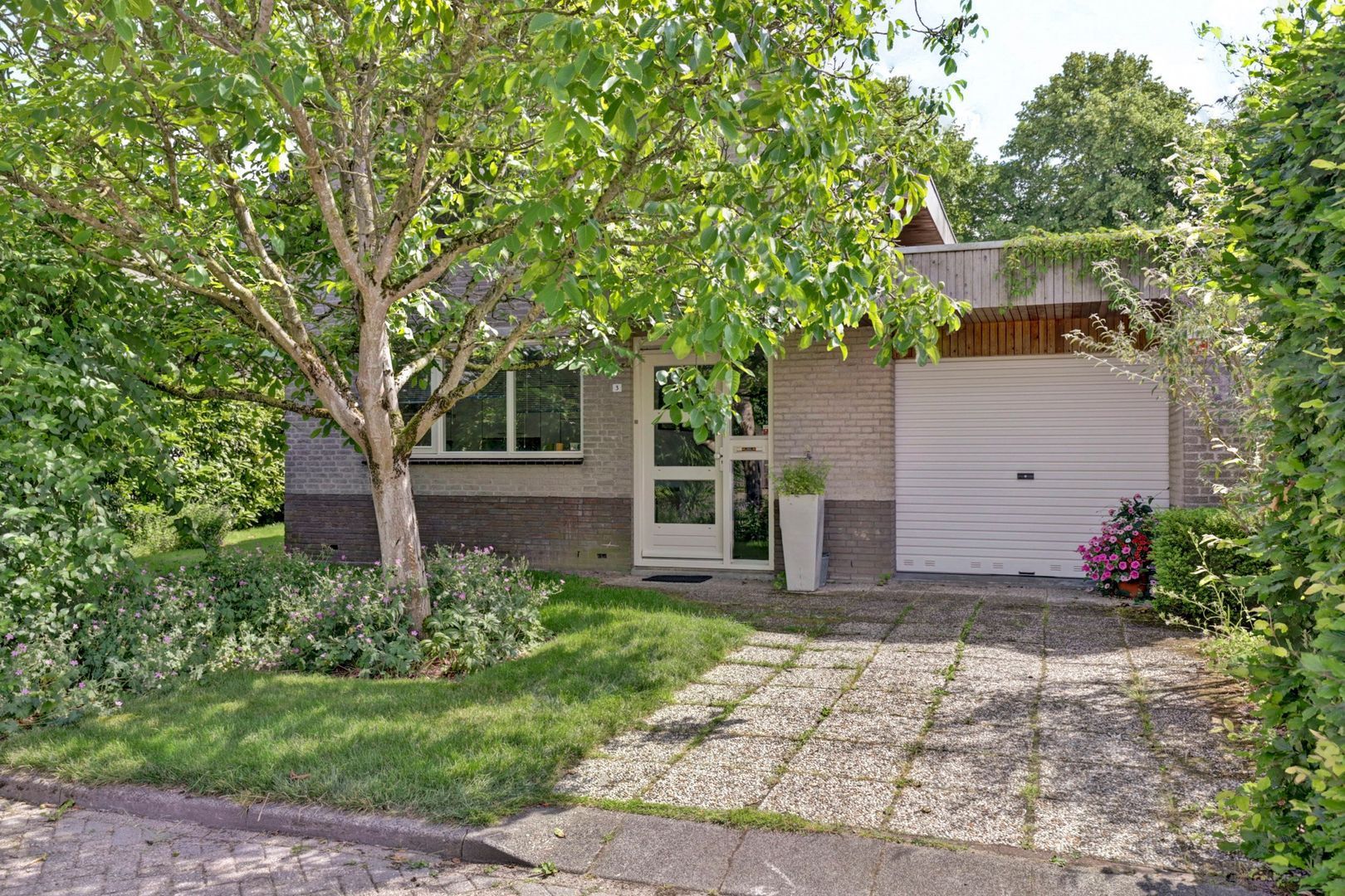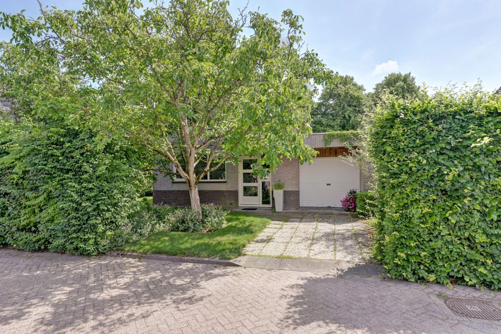 Op de oprit voor de garage is gelegenheid om een auto op eigen terrein te parkeren.