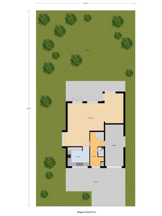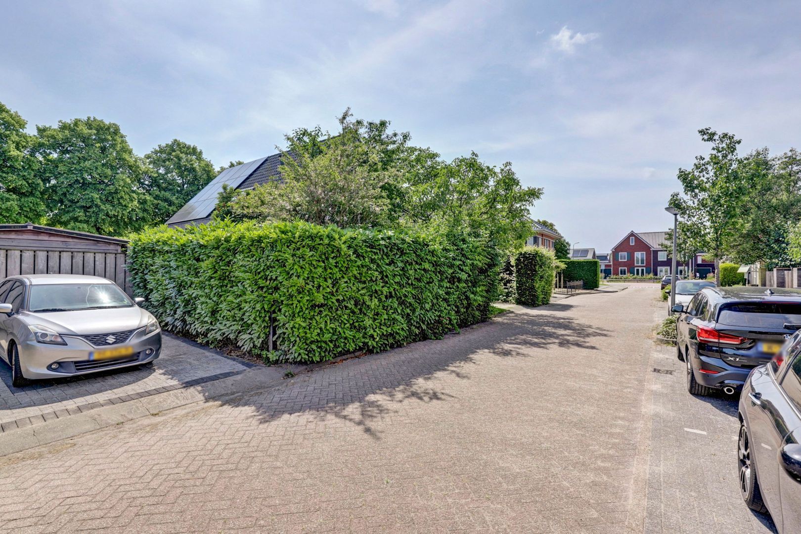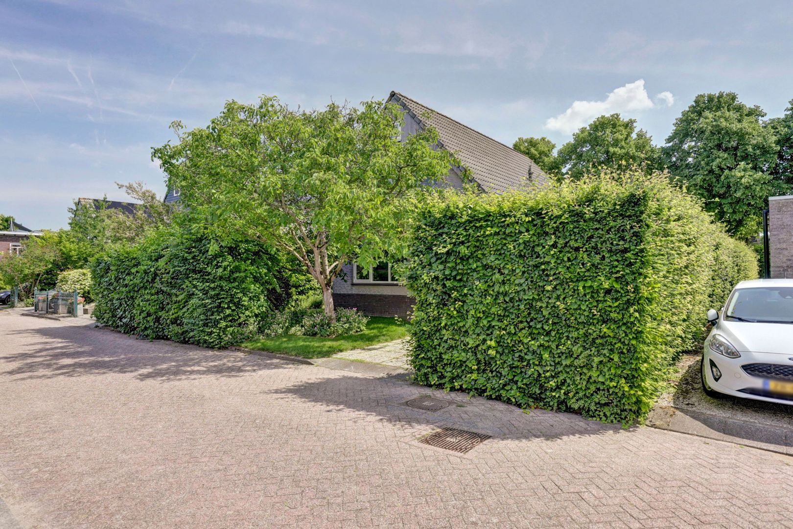 Op de oprit voor de garage is gelegenheid om een auto op eigen terrein te parkeren.