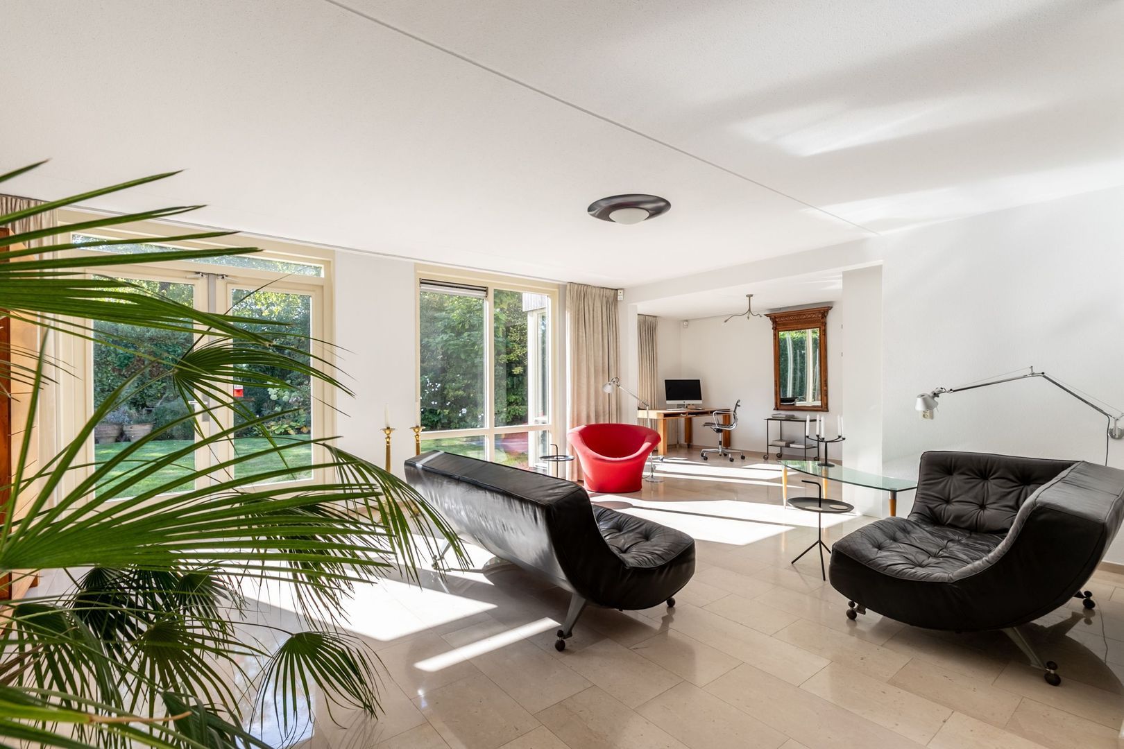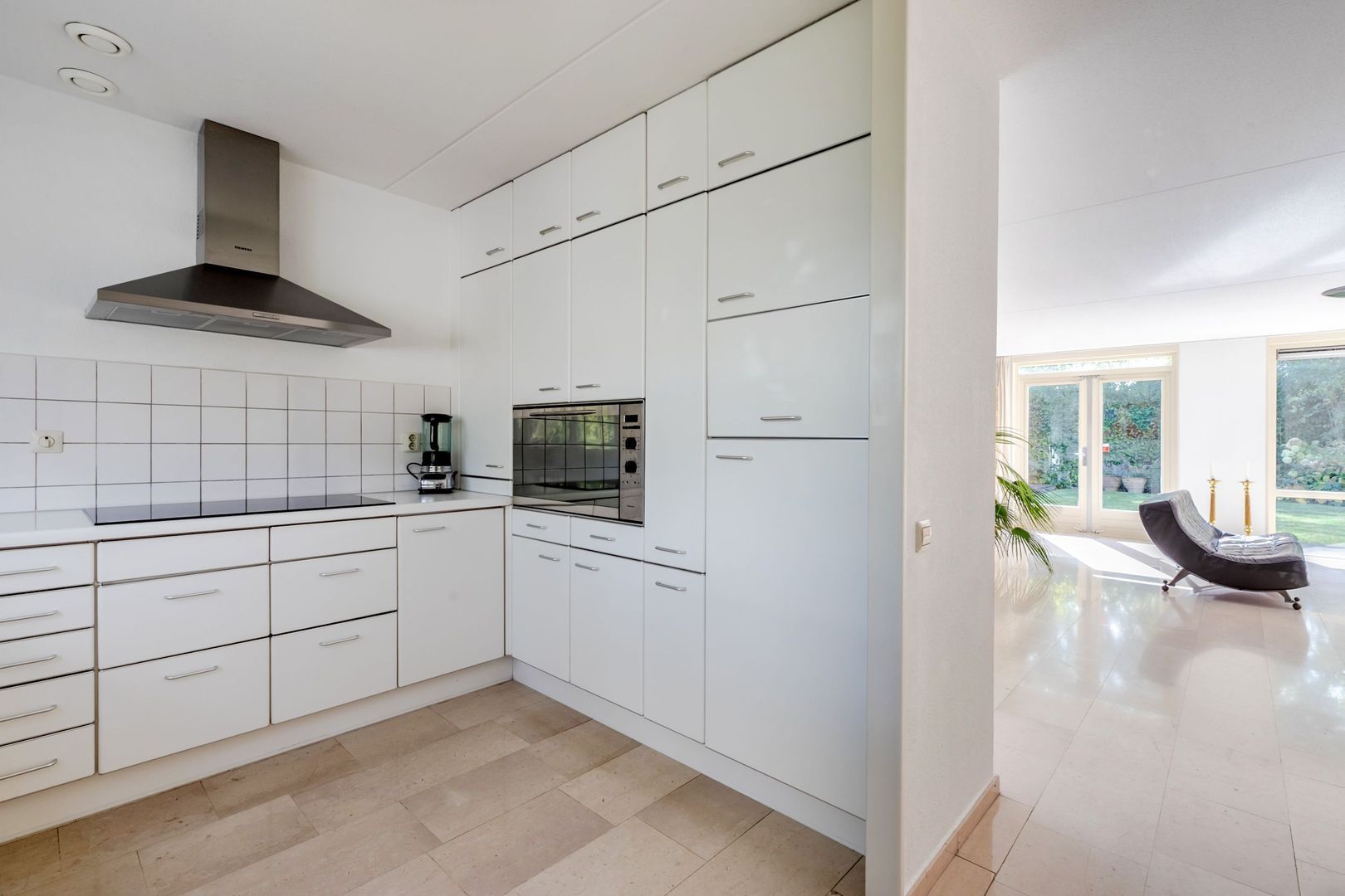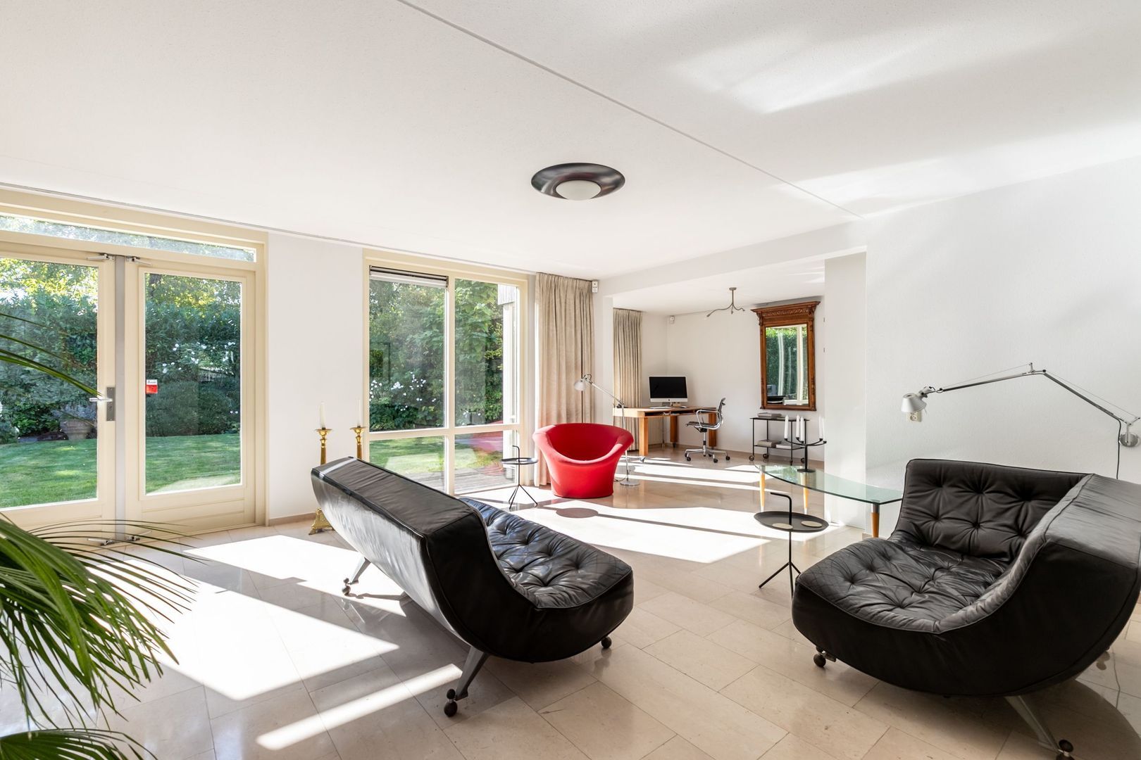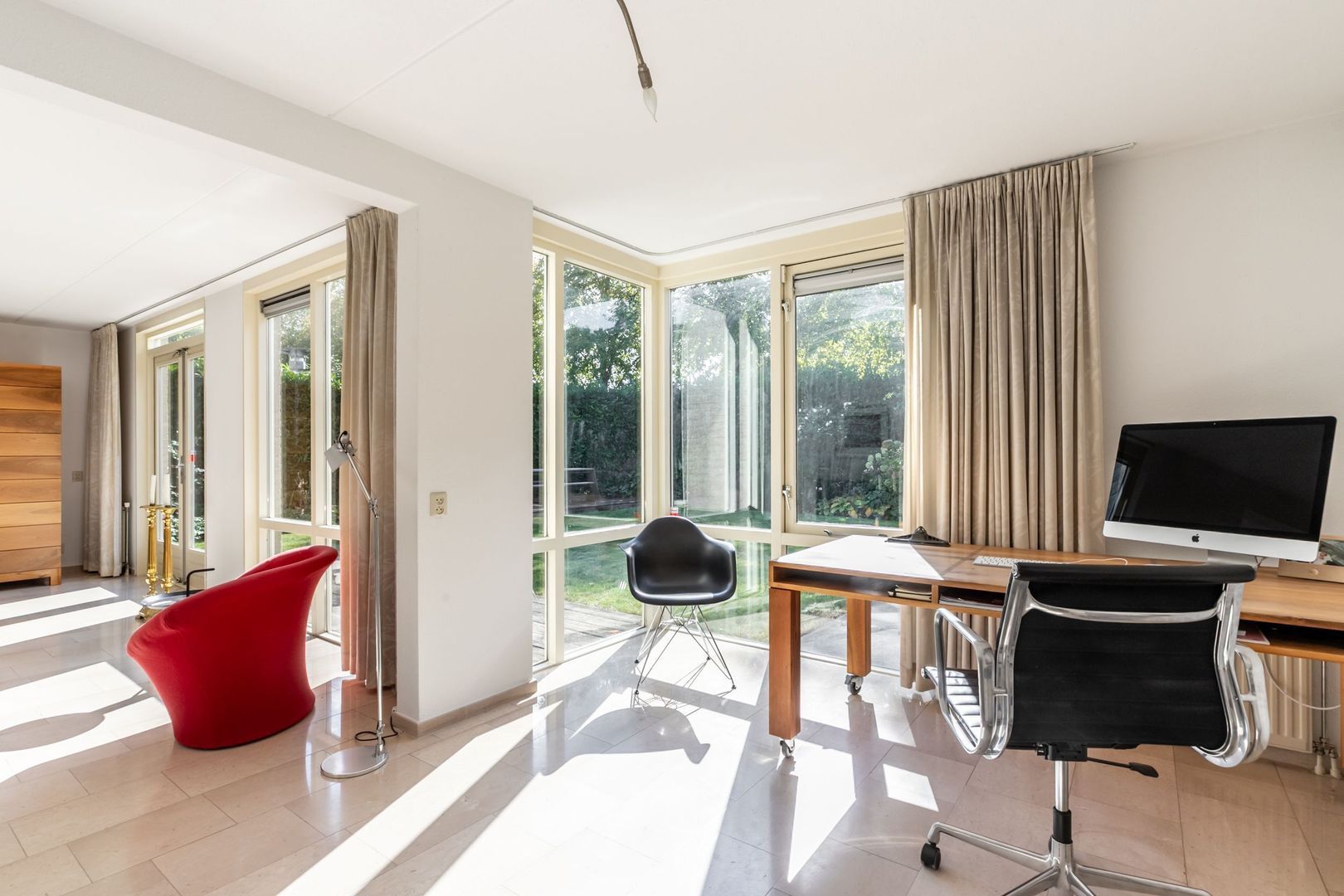 Ruime L-vormige woonkamer met erker en openslaande deuren naar de tuin. De halfopen keuken ligt aan de straatkant. Deze heeft nog de inrichting vanuit de bouwperiode, maar de inbouwapparatuur is inmiddels vernieuwd.