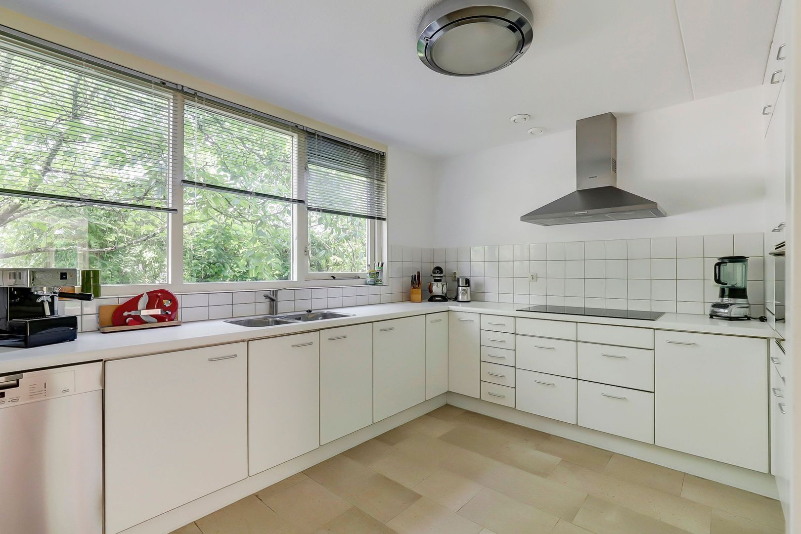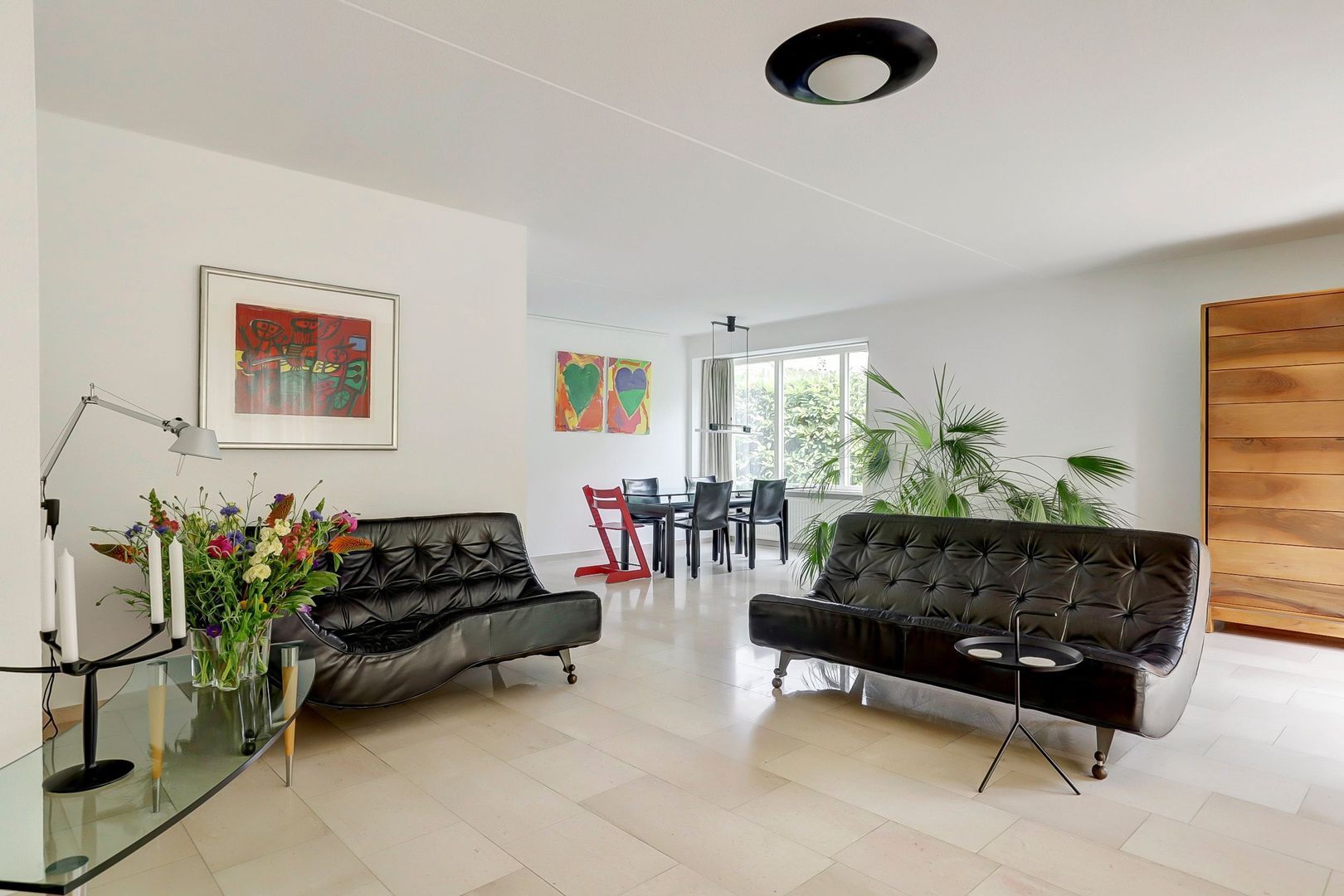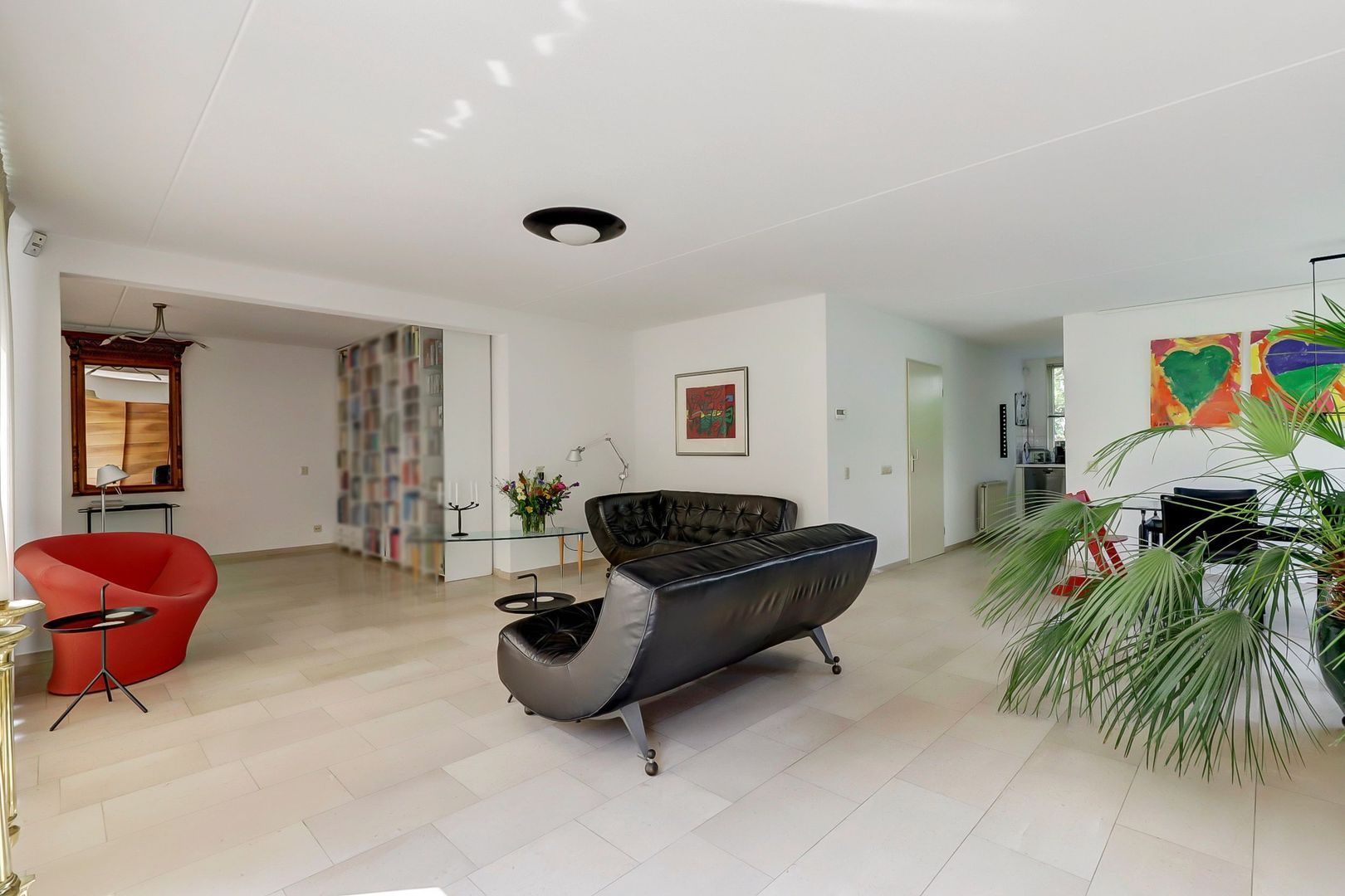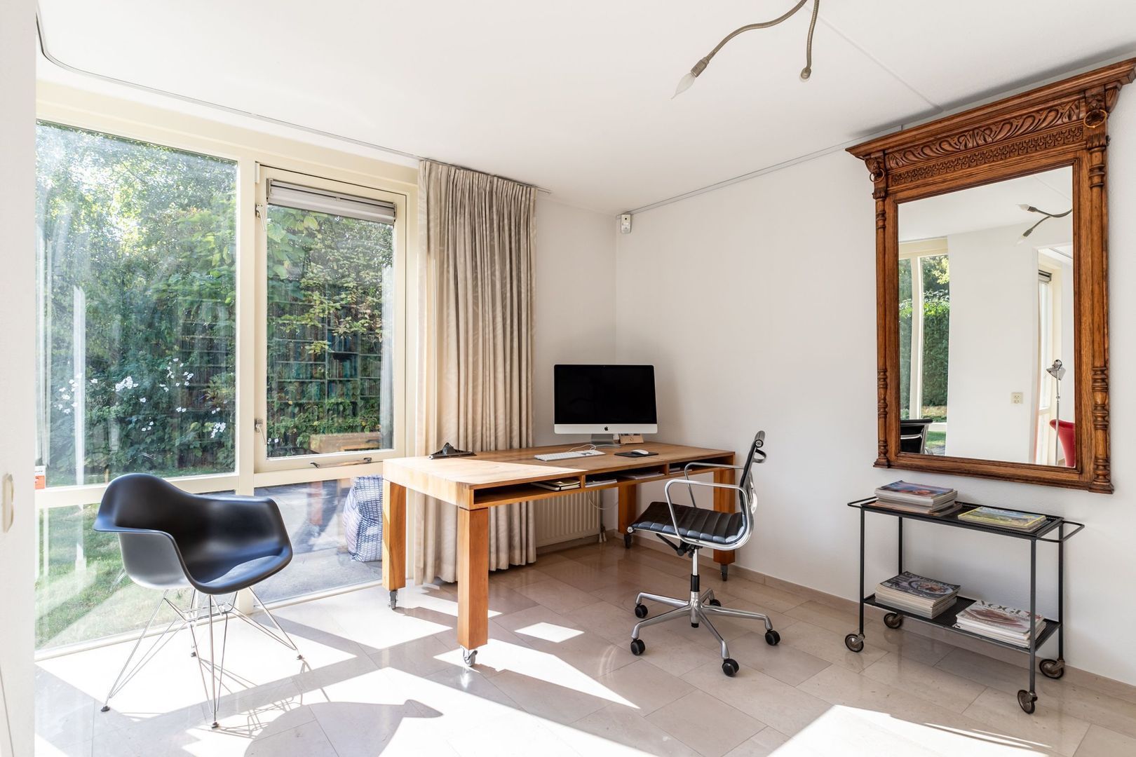 Ruime L-vormige woonkamer met erker en openslaande deuren naar de tuin. De halfopen keuken ligt aan de straatkant. Deze heeft nog de inrichting vanuit de bouwperiode, maar de inbouwapparatuur is inmiddels vernieuwd.