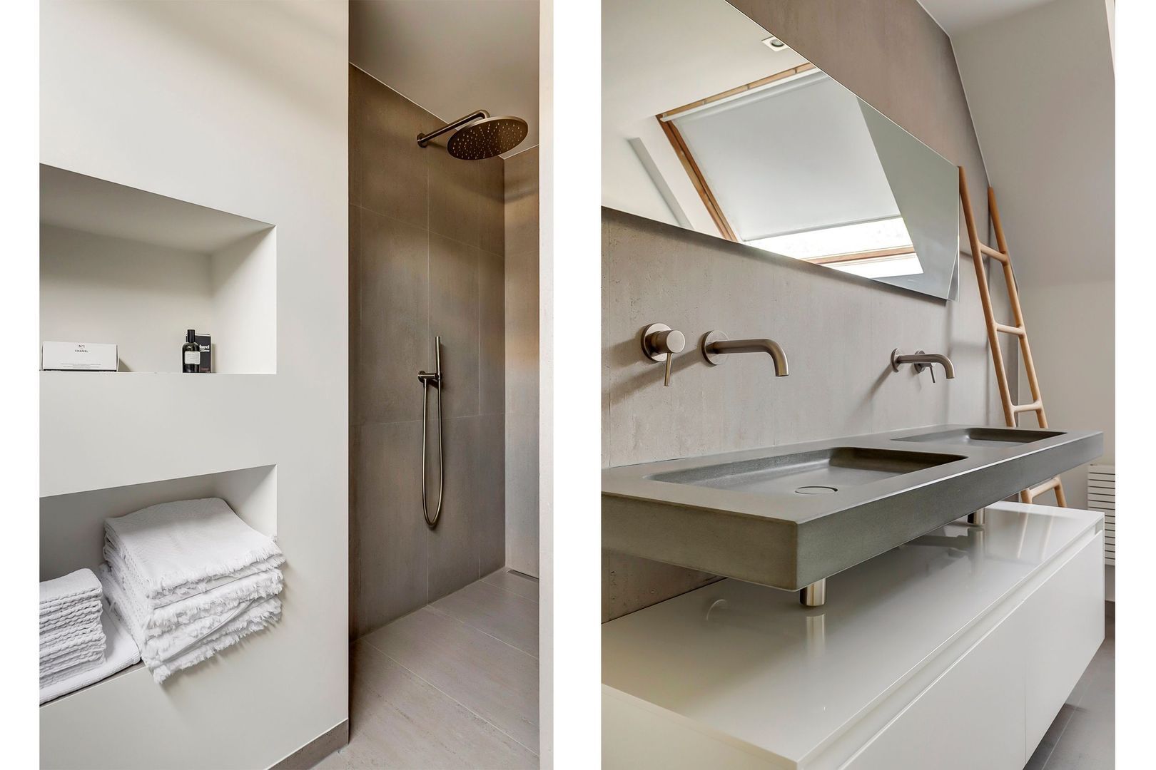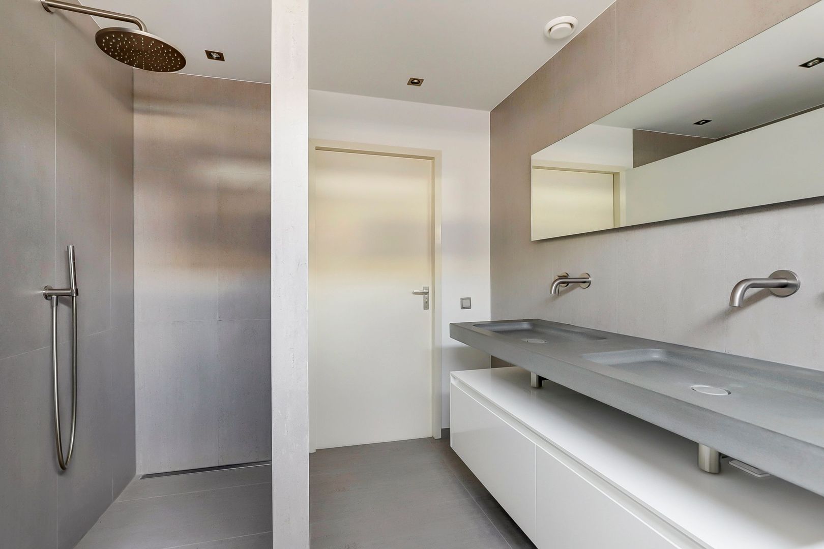 De badkamer is ingericht met een dubbel wastafelmeubel, een inloopdouche en een tuimelraam. Het gestucte plafond is voorzien van inbouwspots.