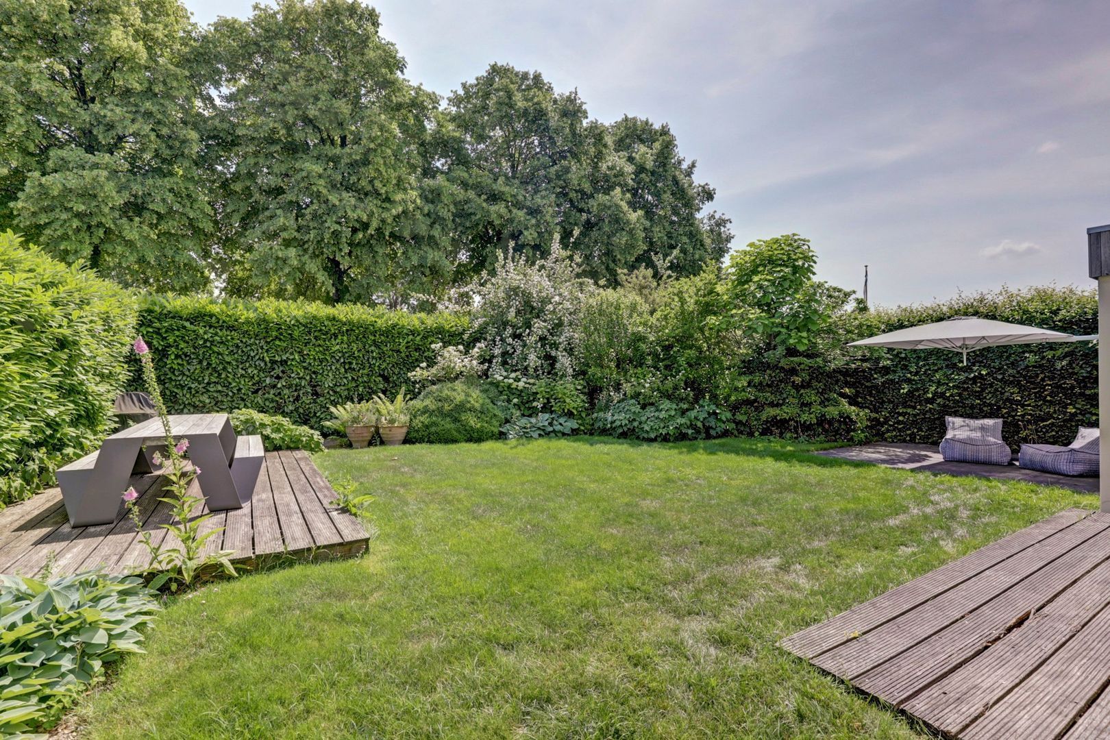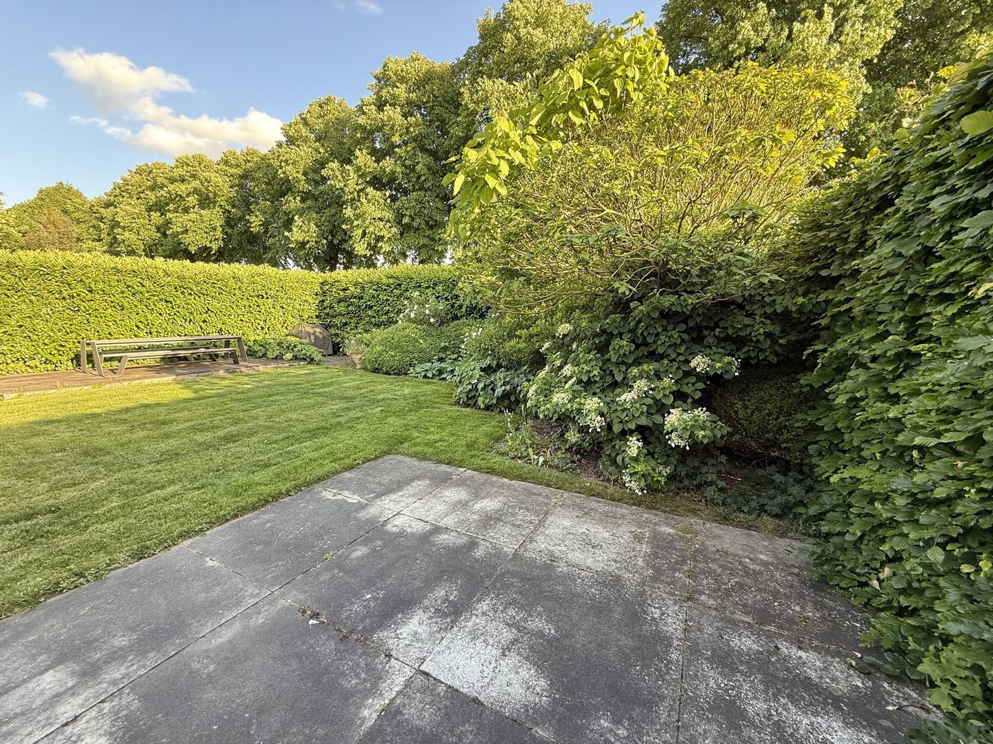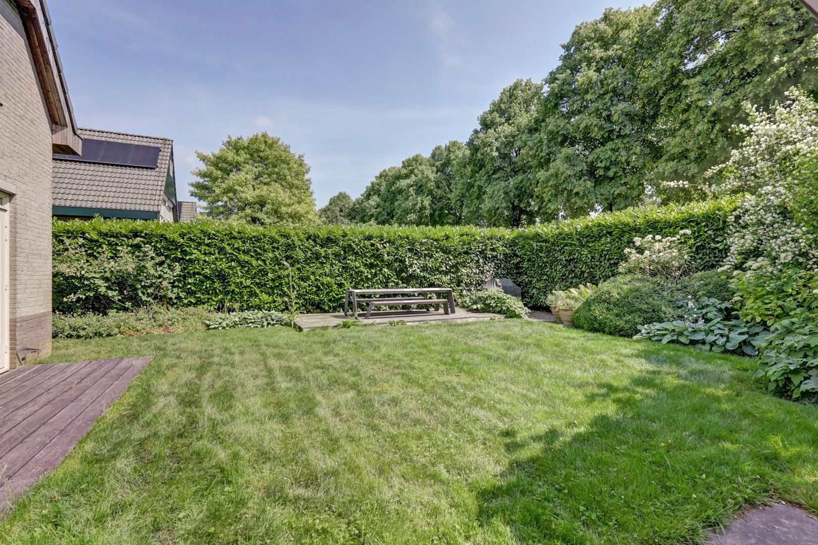 De tuin is ruim en biedt veel privacy, mede vanwege de volwassen beplanting.
