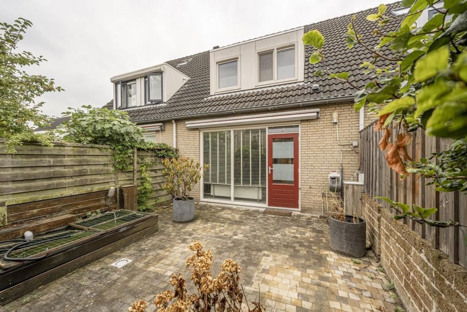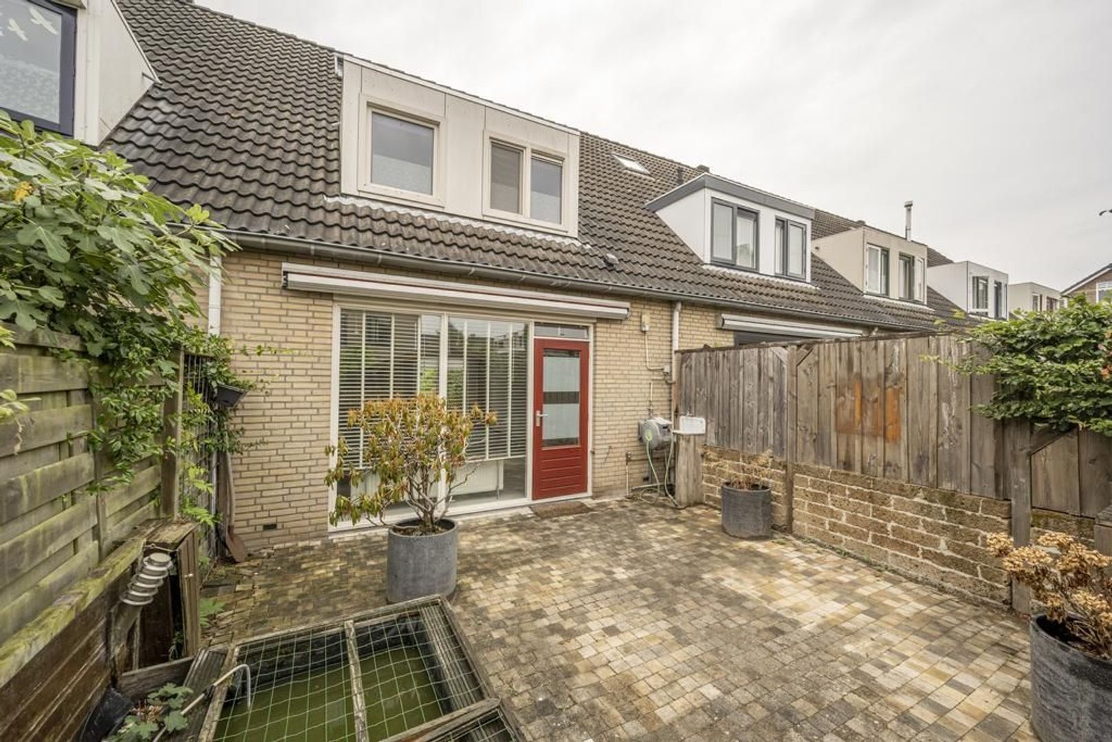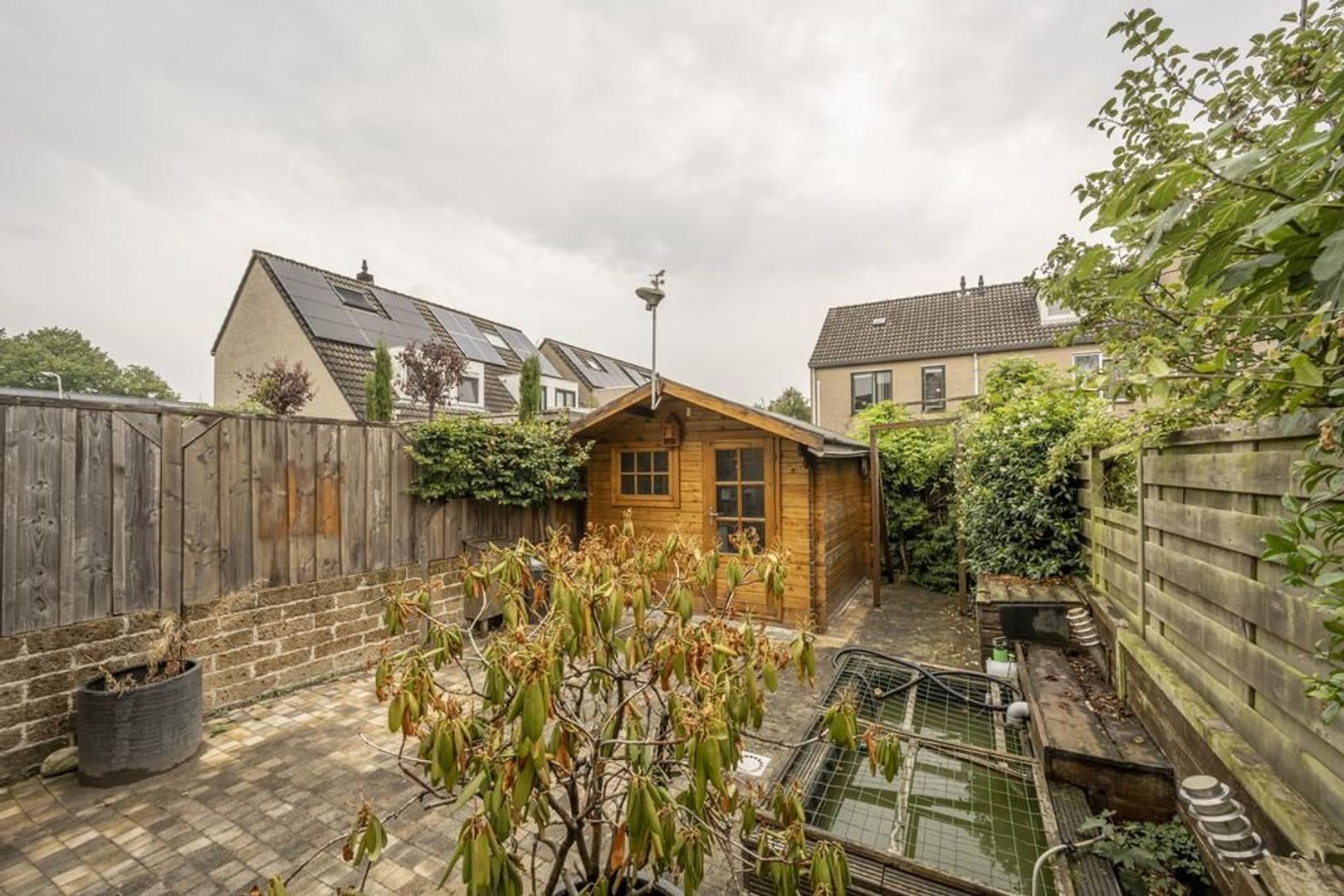 De achtertuin ligt op het oosten. Deze is voorzien van bestrating en een vijver. Achterin staat een houten berging. Aan de achtergevel is een elektrisch zonnescherm aangebracht.
