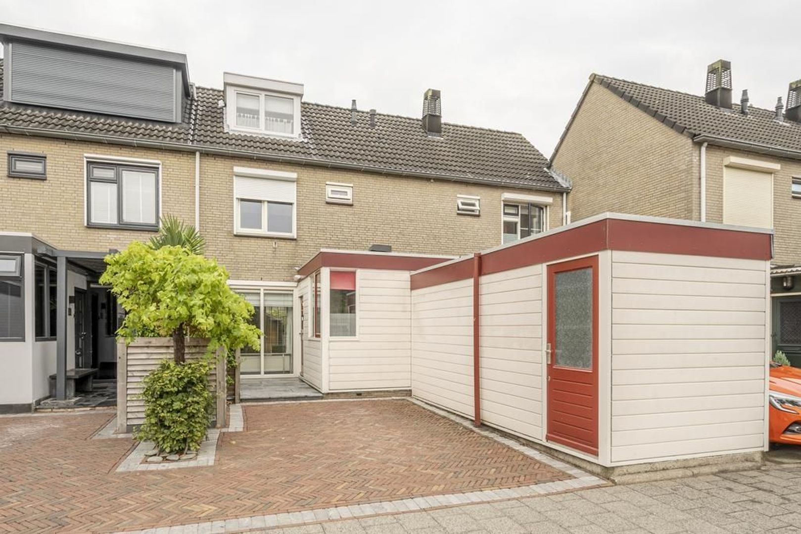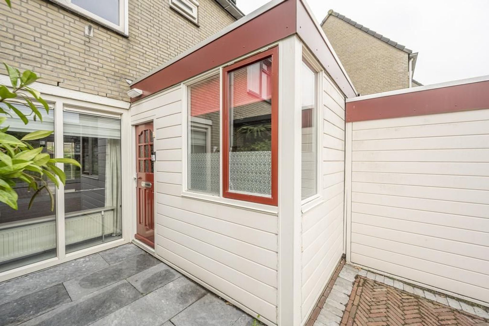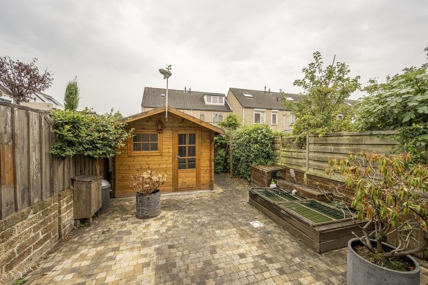 De achtertuin ligt op het oosten. Deze is voorzien van bestrating en een vijver. Achterin staat een houten berging. Aan de achtergevel is een elektrisch zonnescherm aangebracht.