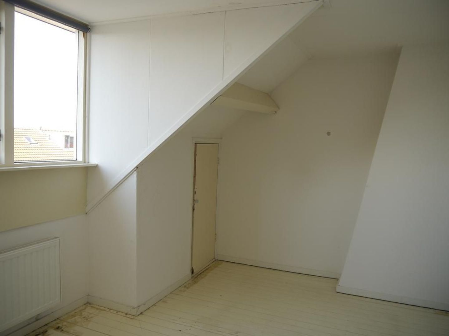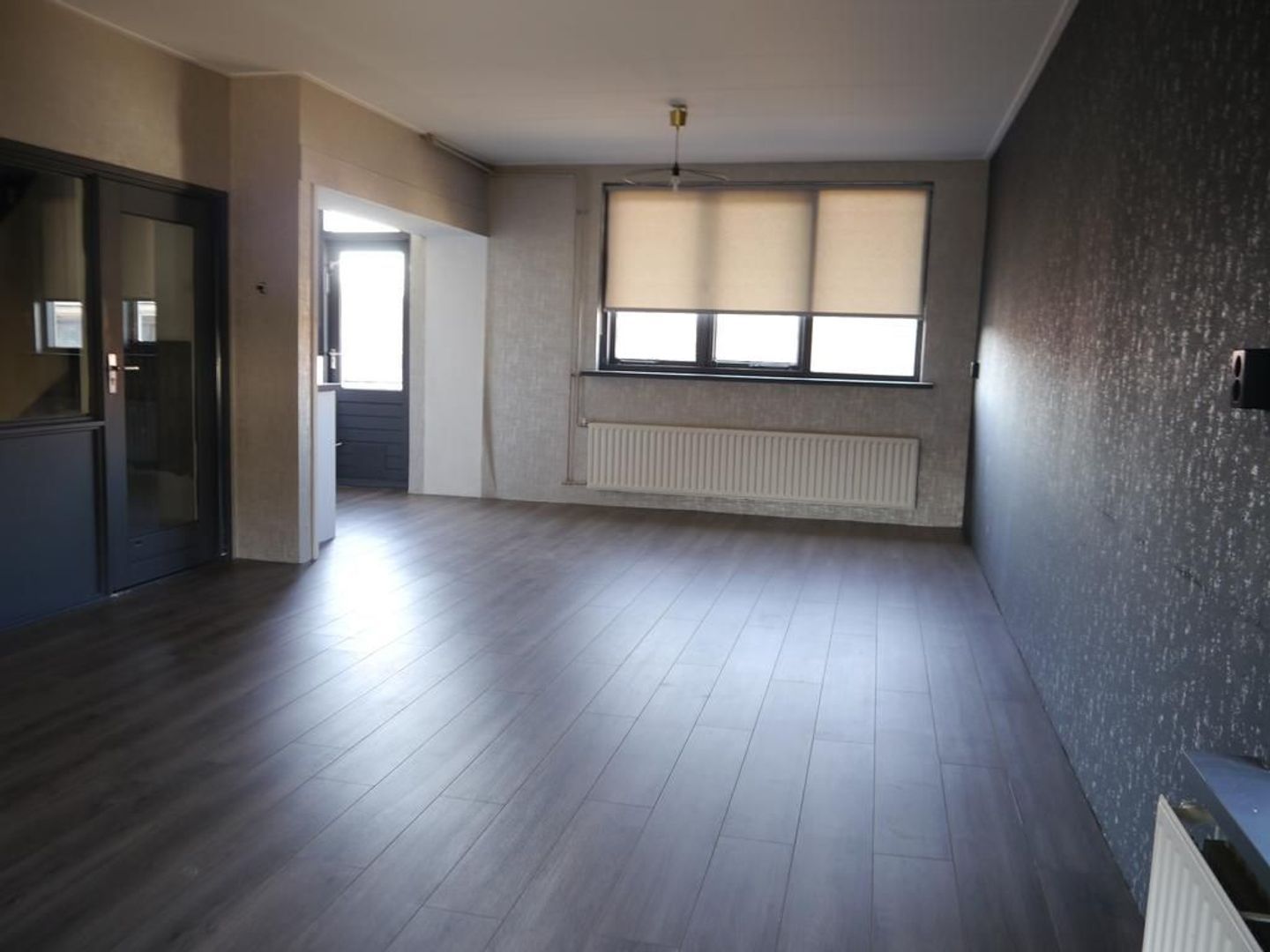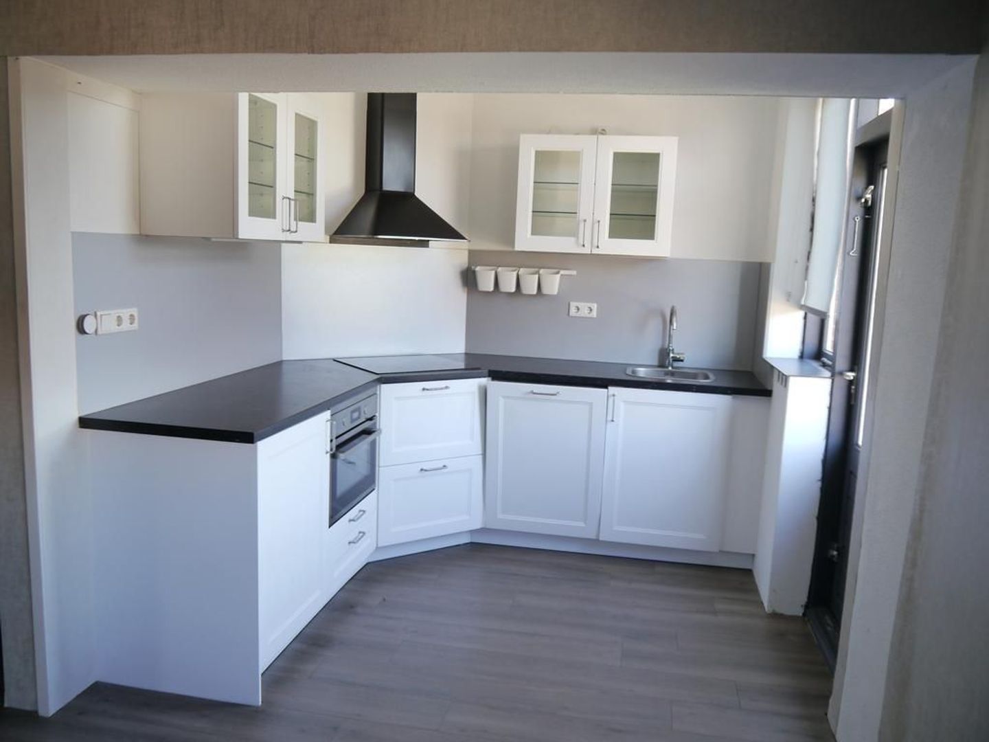 De indeling is als volgt: entree, trapopgang, overloop met toiletruimte en toegang tot de ruime en lichte woonkamer met open keuken. Deze heeft een hoekinrichting met diverse apparaten. Ook is er een deur naar een klein balkon aan de keuken.