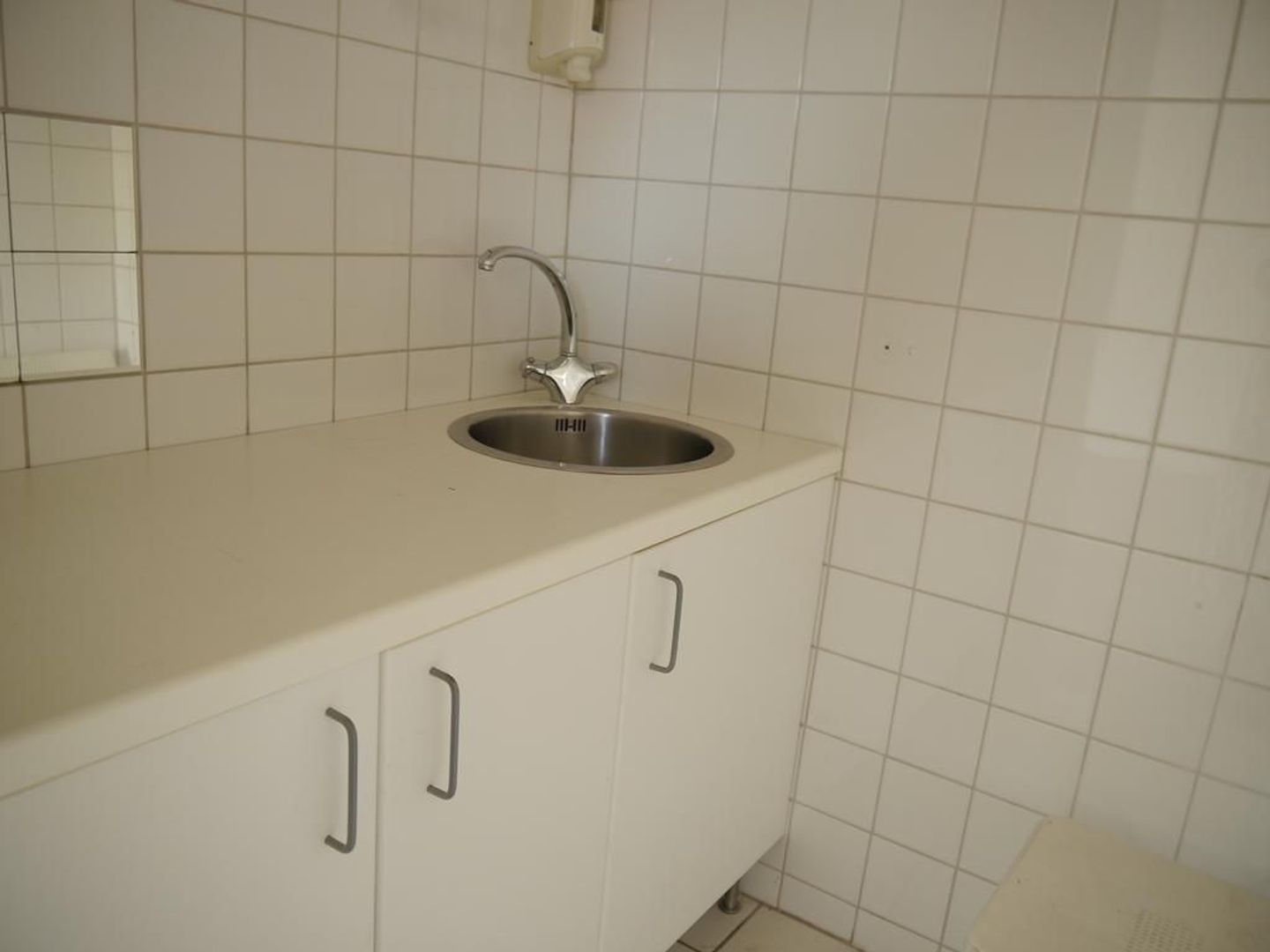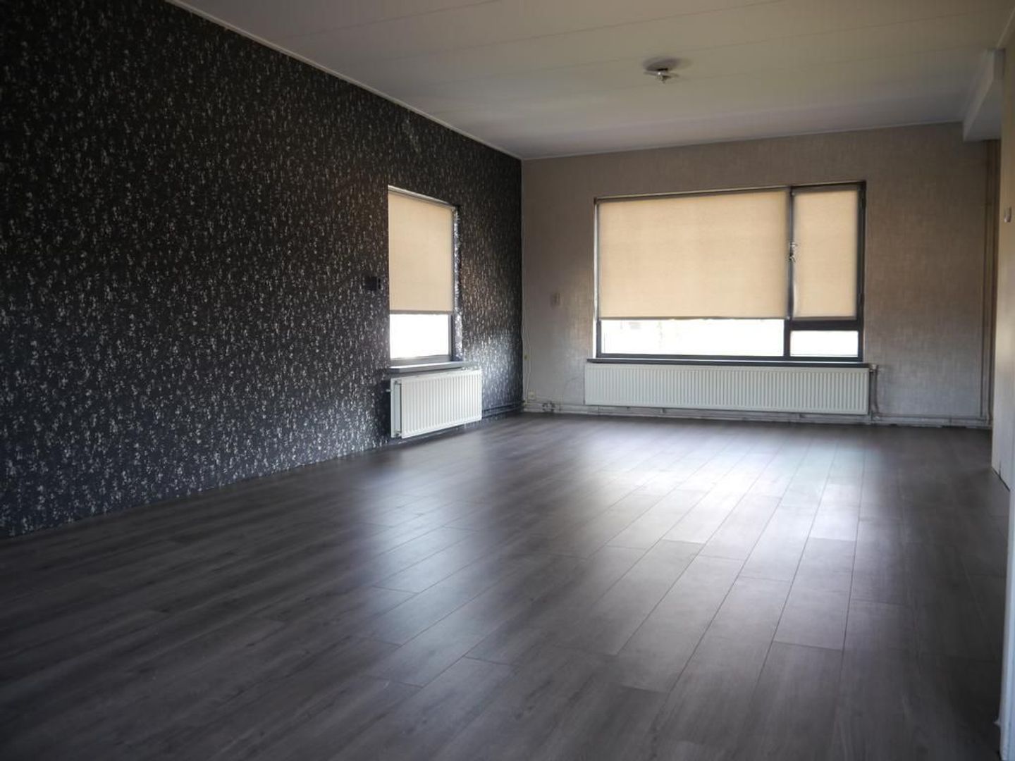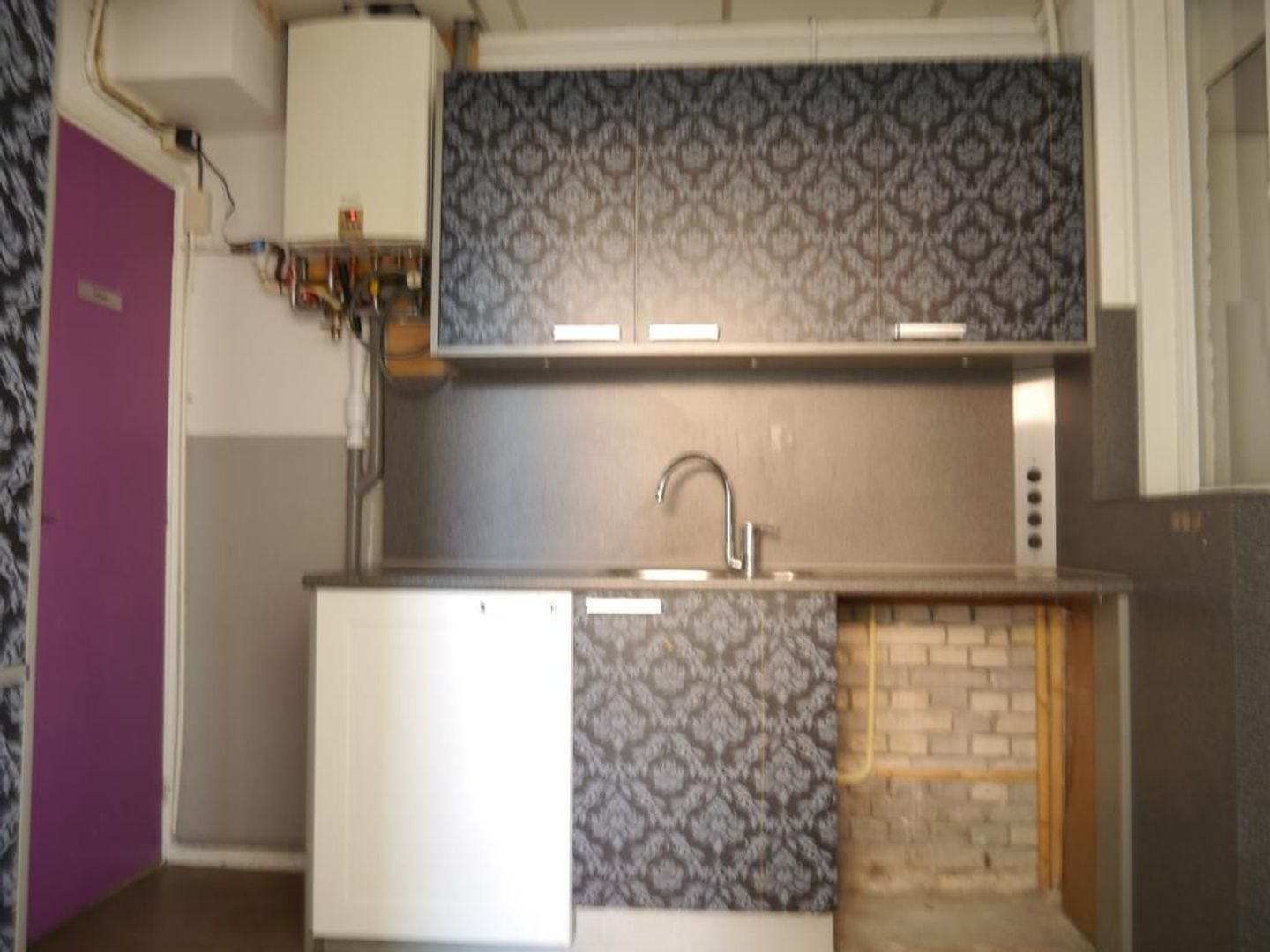 De indeling is als volgt: entree, trapopgang, overloop met toiletruimte en toegang tot de ruime en lichte woonkamer met open keuken. Deze heeft een hoekinrichting met diverse apparaten. Ook is er een deur naar een klein balkon aan de keuken.