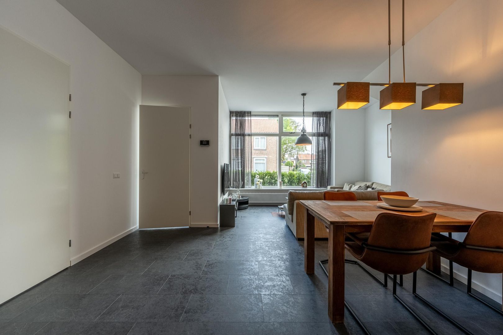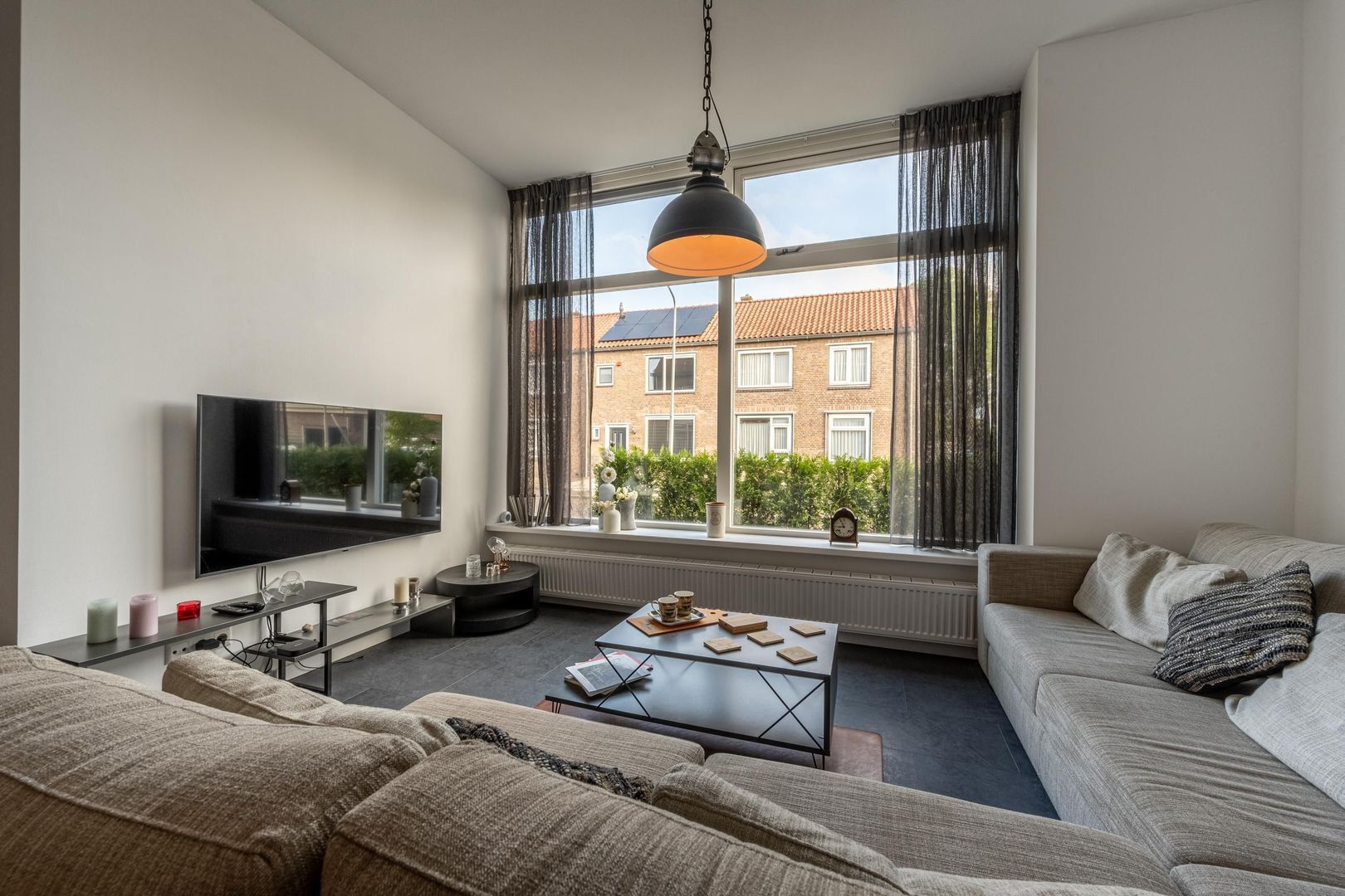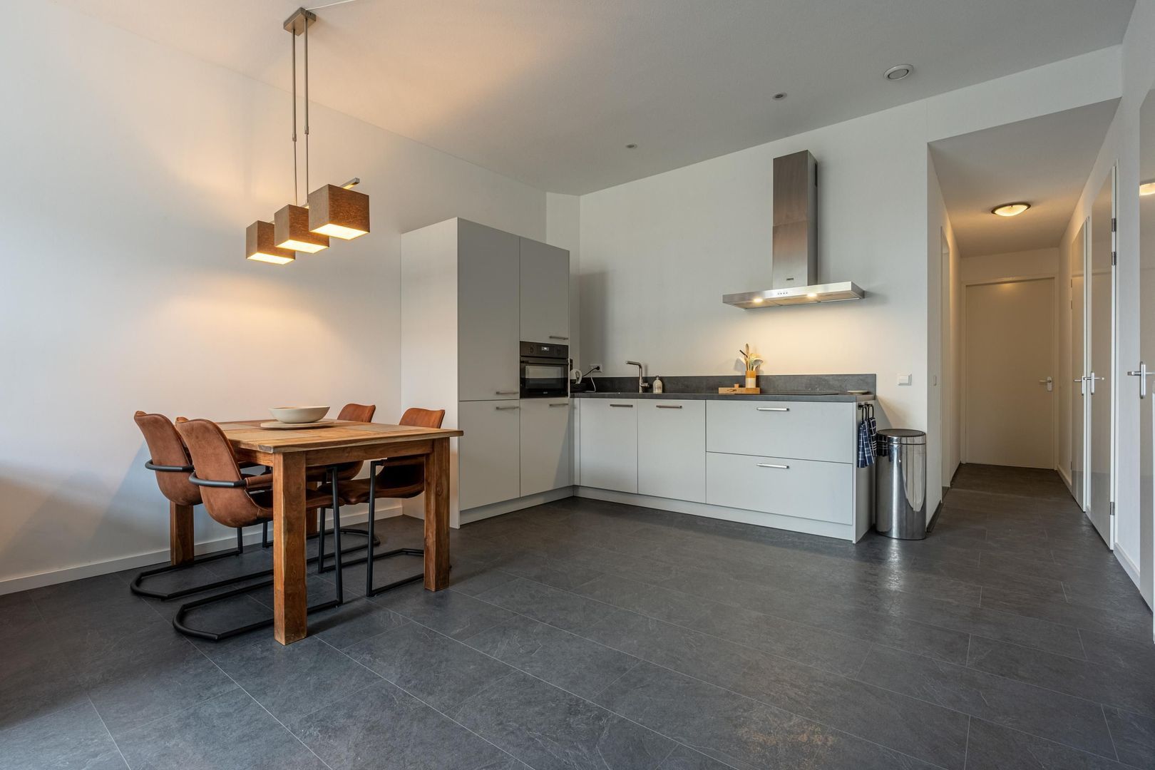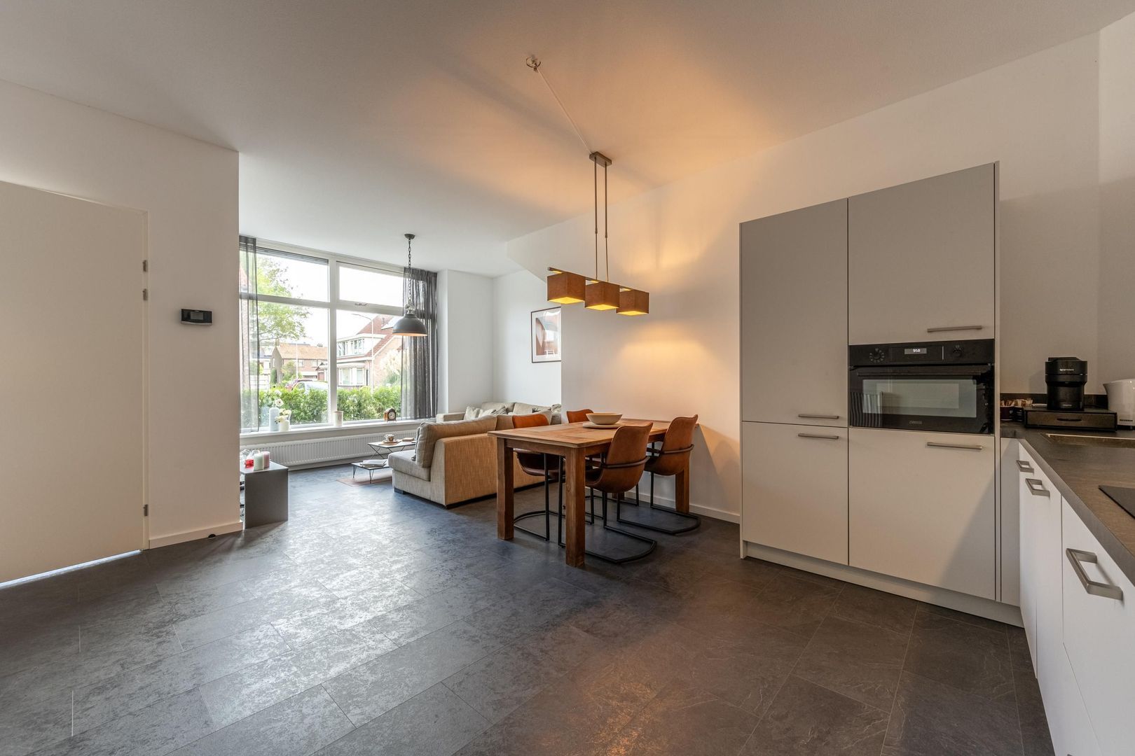 De gezellige woonkamer heeft een prettige lichtinval dankzij het grote raam aan de straatkant. De open keuken is voorzien van een eigentijdse hoekinrichting met inbouwapparatuur.